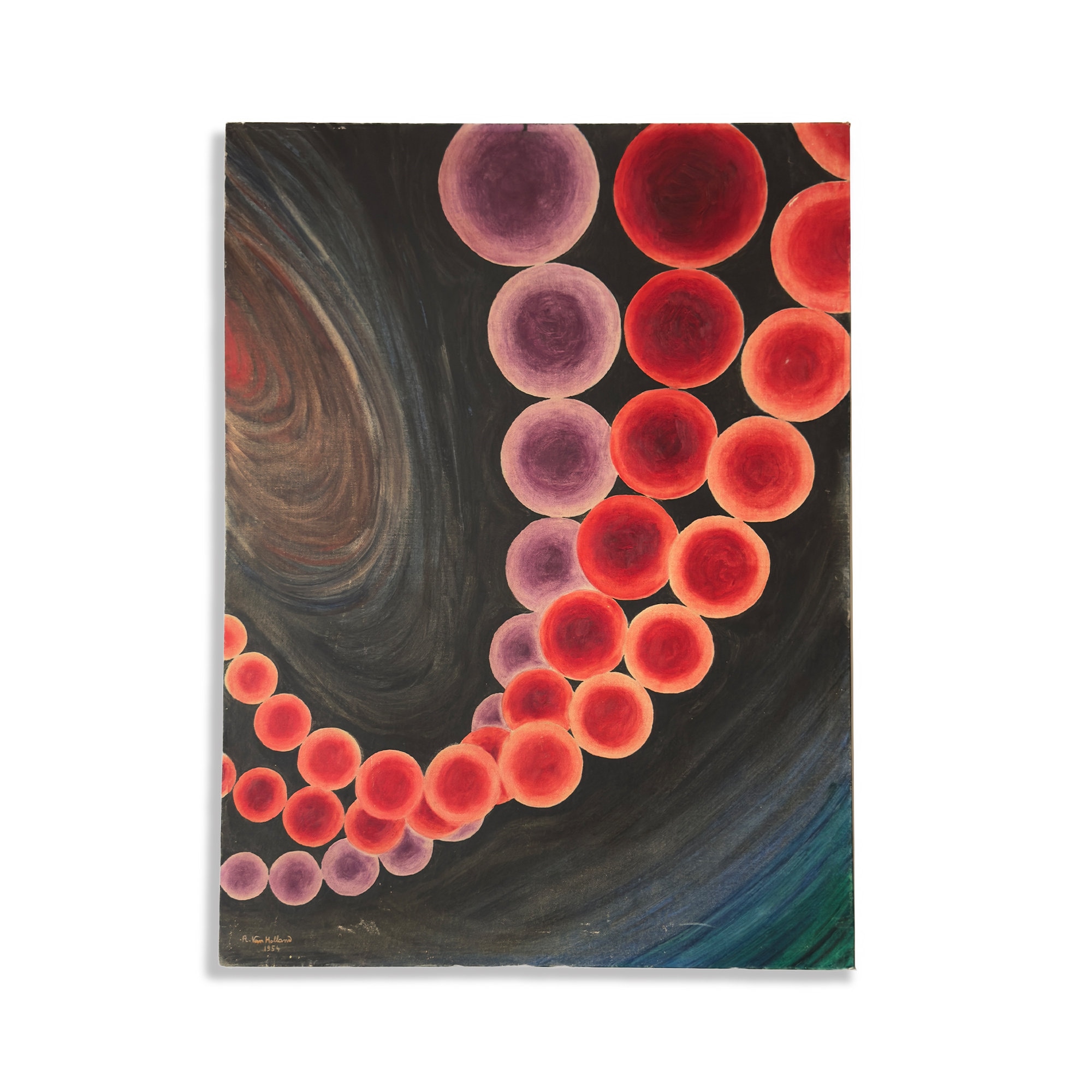 This is a fascinating painting on canvas board from 1954 by R. Van Holland. At a quick glance the work look like a pure abstract geometric painting, but looking closer it appear to be set in space, with a sun or a galaxy in the background, and three planets revolving around it.