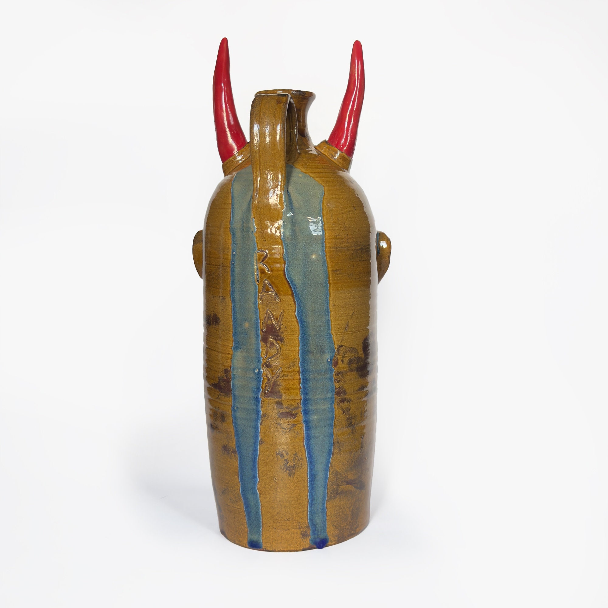 Self Taught Outsider Artist Randy Tobias that has been making pottery for over 50 years. Most known for his evocative face jugs, he often uses snakes, devil, and eye imagery. Tobias lives in NC. 17 x 8 inches