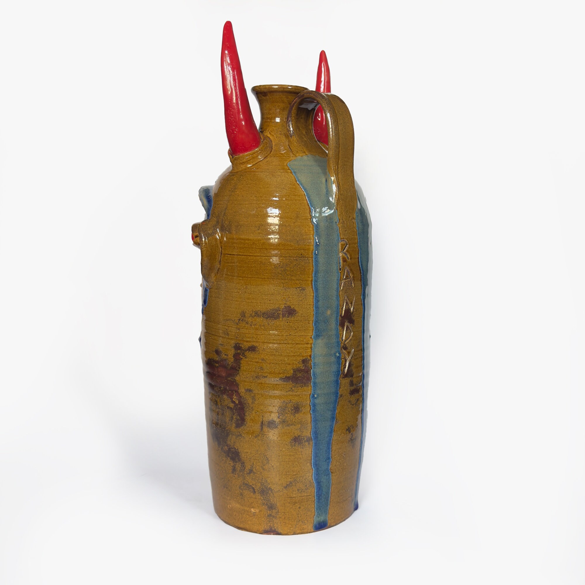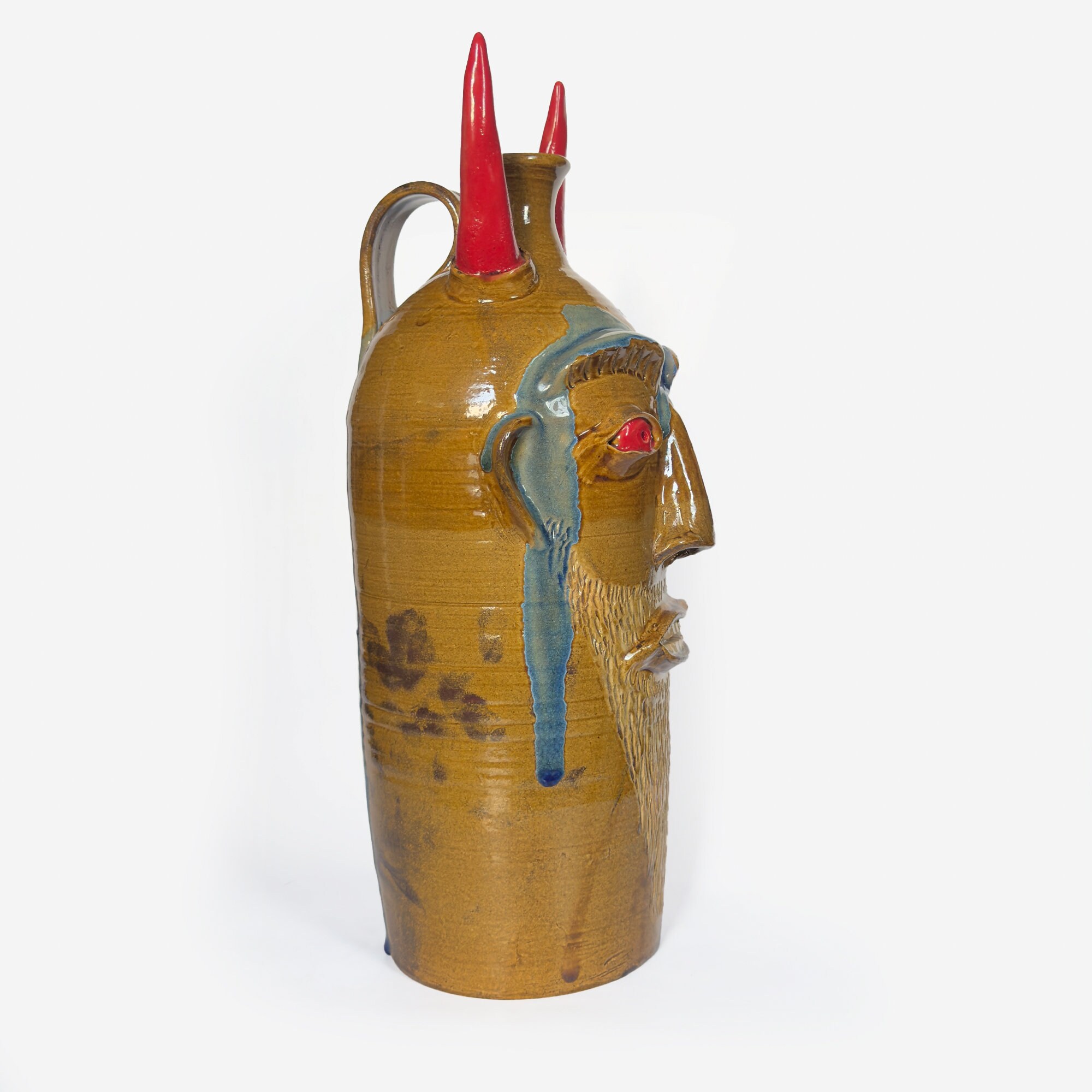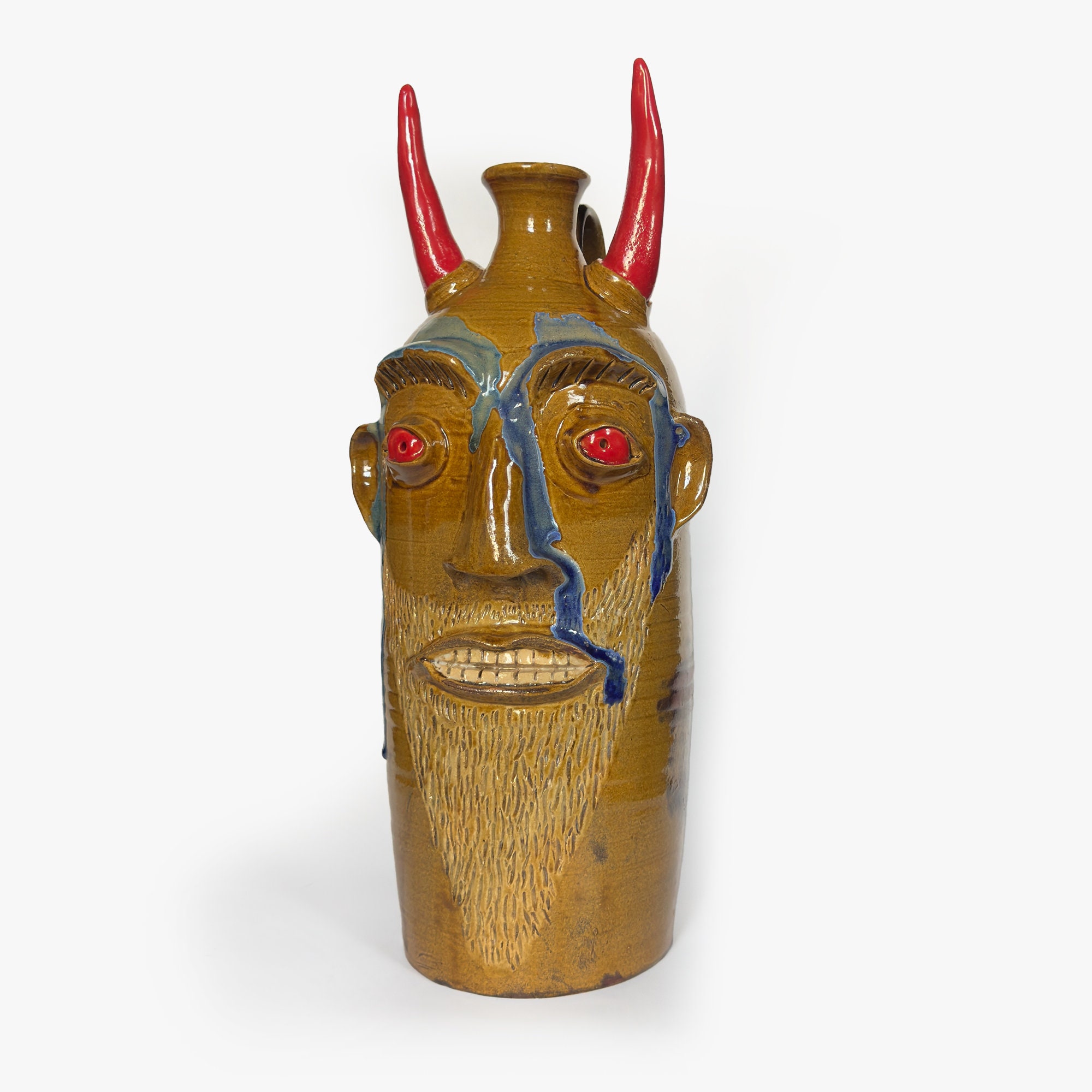 Face jugs, a staple of popular folk craft, are some of the most iconic works in the history of American folk art. While nearly synonymous with Americana and American folk art traditions, their origins were co-opted from an amalgam of disparate cultural influences. The oldest most likely stems from the traditional African practice of creating expressive jugs to serve as headstones. Brought to America by the cruel act of slavery, the tradition found a prevalence in throughout the Southeast that thrives to this day. Similarly, International trade from China imported the highly sought after art of red ceramic glazes. One of the most recognizable and prized forms of face jugs are the vibrant Red Devils faces. In the south these embellished pots were used to buy & store liquor; the ominous features would scare children so they would not be tempted to try the contents. England too has a cultural form of figurative pottery know as Toby Jugs. Toby Jugs typically feature archetypal characters or famous men.