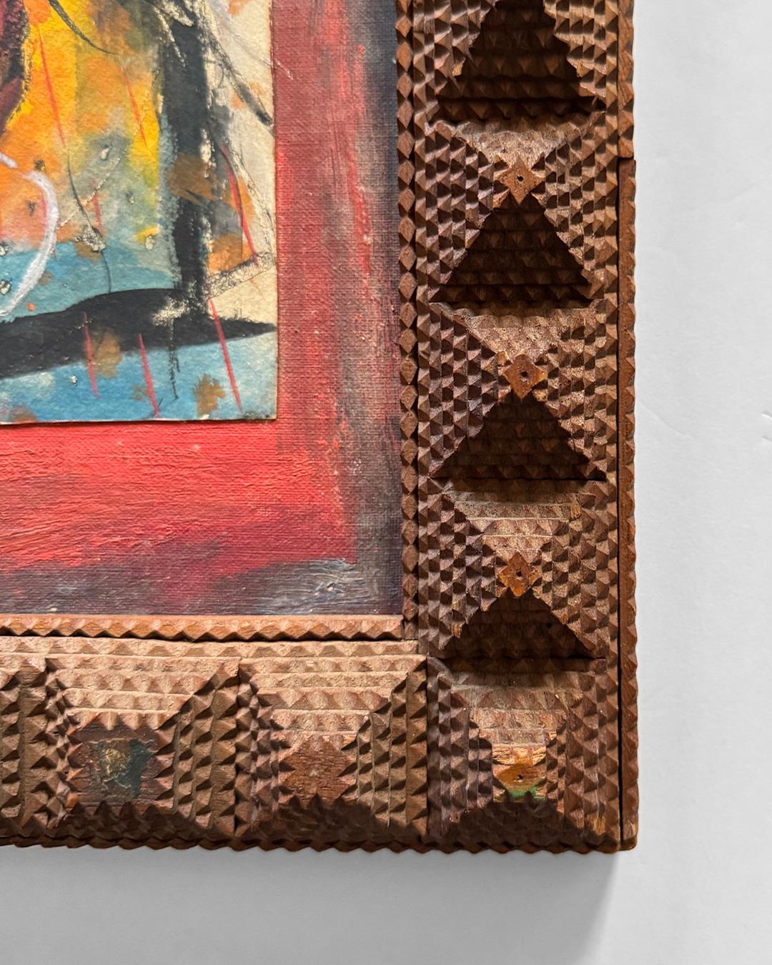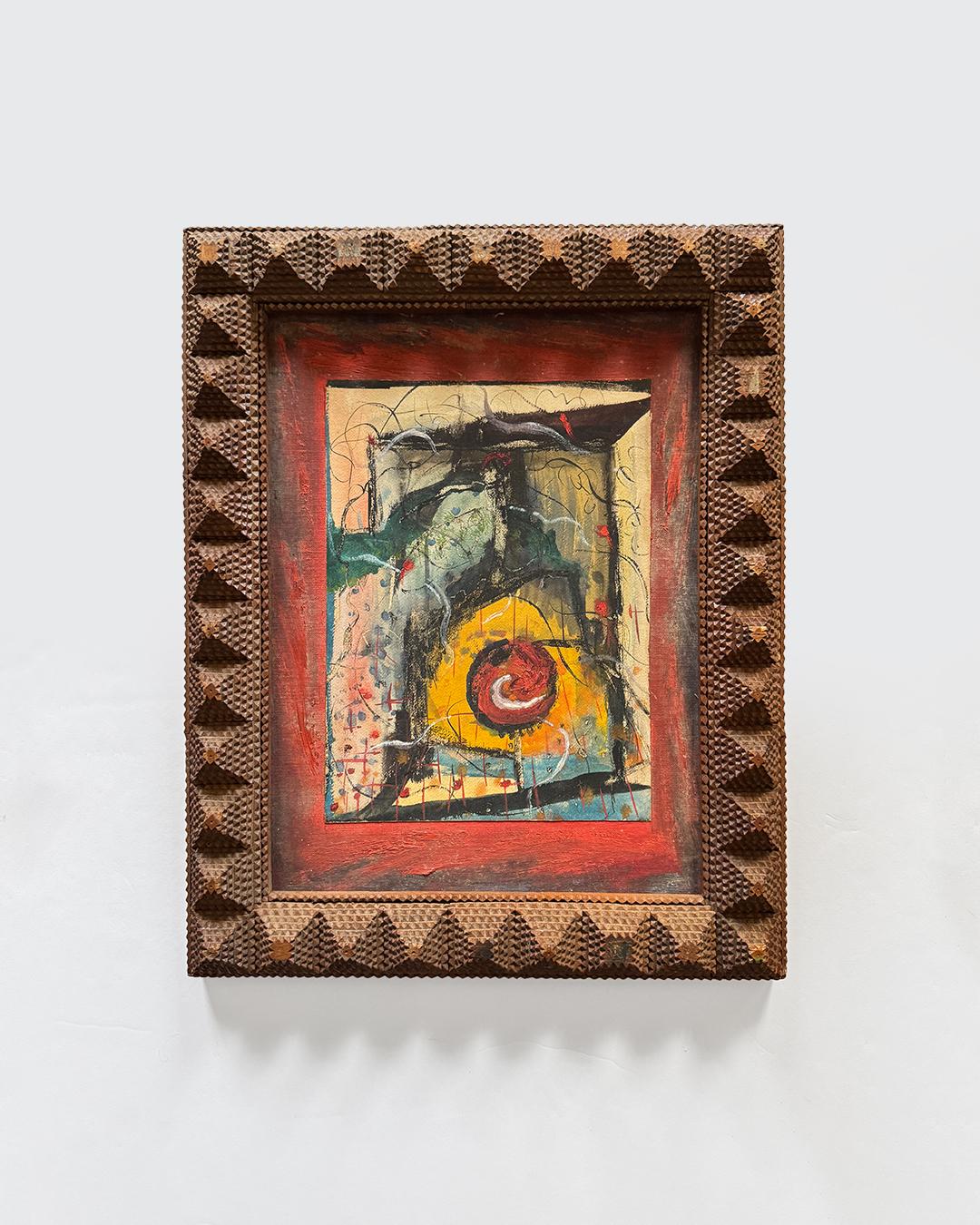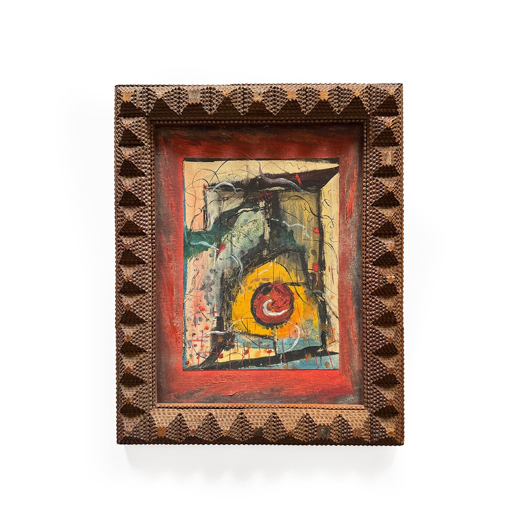 Mid-20th Century Abstract Expressionist Painting on Board in a Tramp Art Frame. Signed "Albert Marcus, Composition No. 1," this work features energetic, active brushwork evocative of early Mark Rothko or Jackson Pollock, with a raw immediacy that embodies the gestural freedom of the Abstract Expressionist movement. Its vibrant surface contained within a hand-carved tramp art frame, measuring 20 x 15 inches, that adds a sculptural folk-art presence, making the piece a striking hybrid of high modernism and vernacular craft.