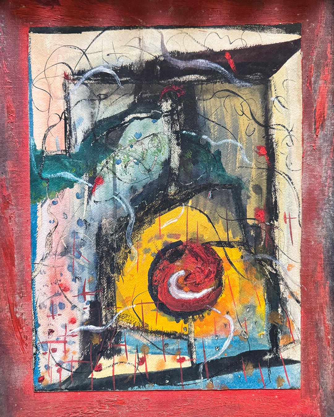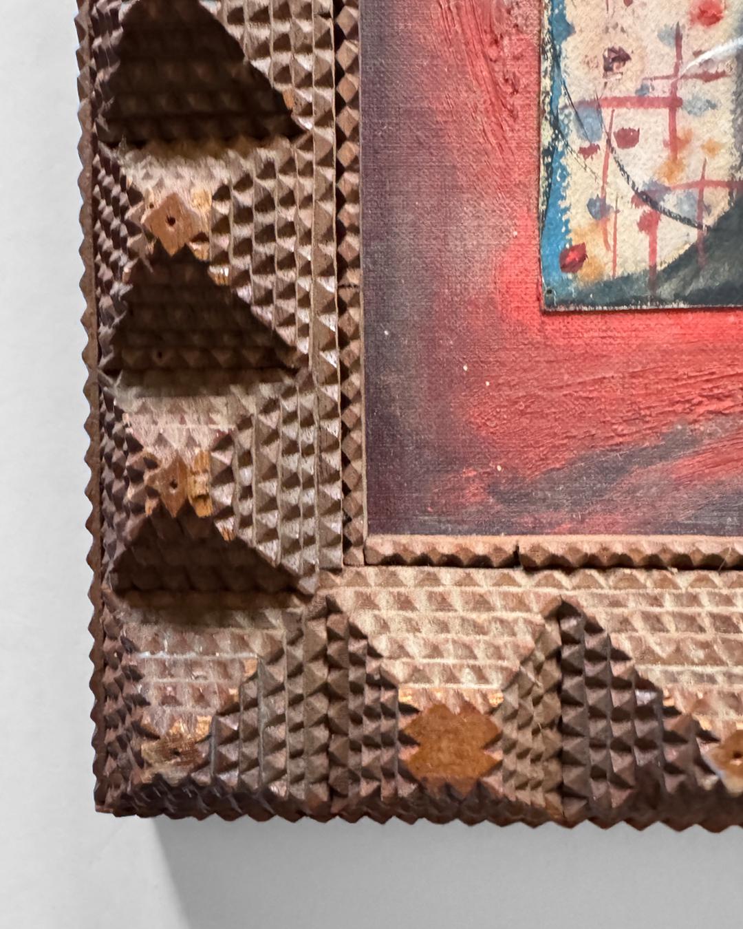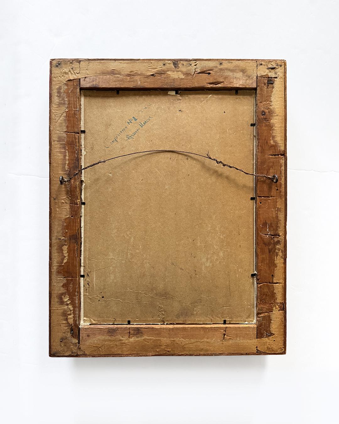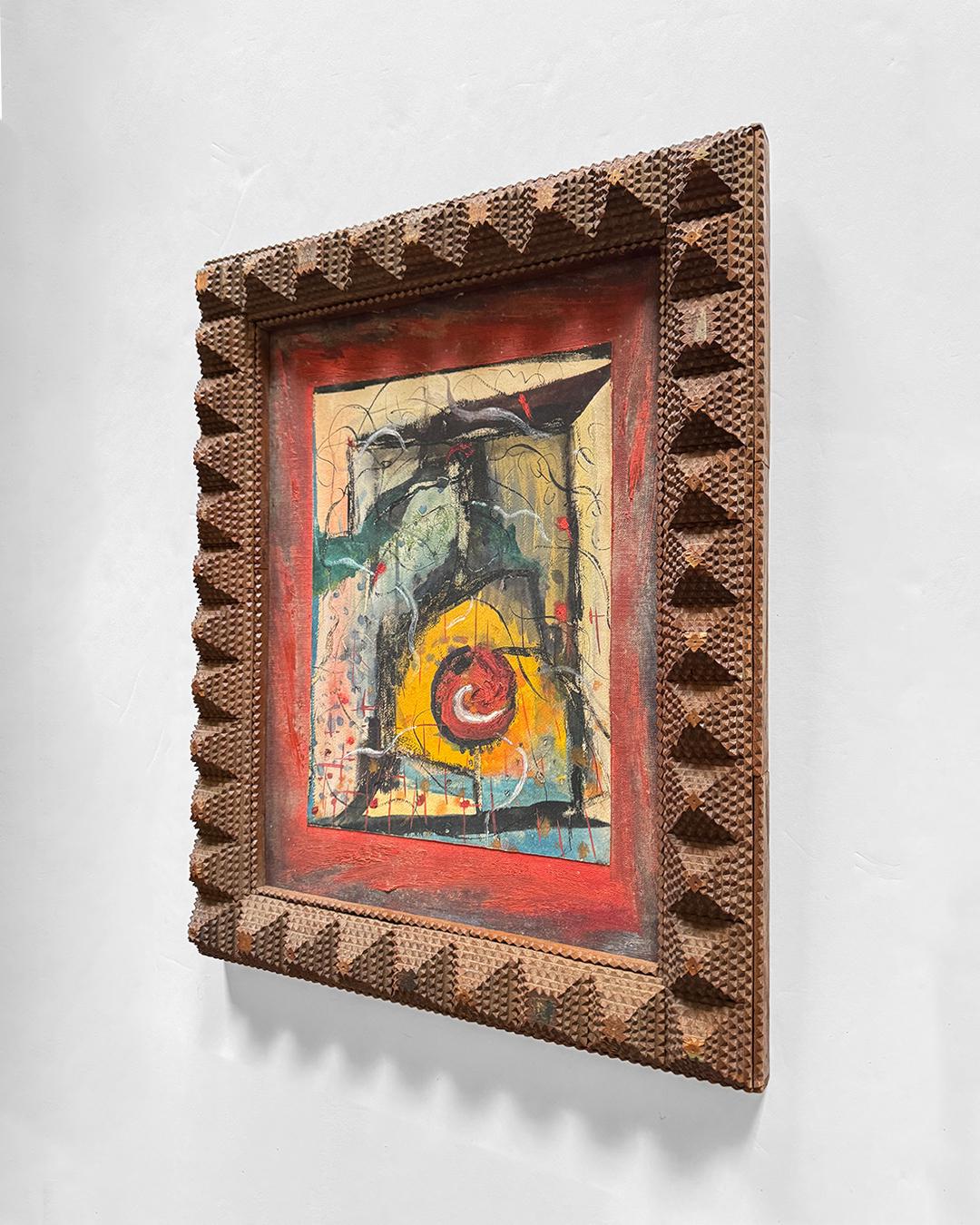 Mid-20th Century Abstract Expressionist Painting on Board in a Tramp Art Frame. Signed "Albert Marcus, Composition No. 1," this work features energetic, active brushwork evocative of early Mark Rothko or Jackson Pollock, with a raw immediacy that embodies the gestural freedom of the Abstract Expressionist movement. Its vibrant surface contained within a hand-carved tramp art frame, measuring 20 x 15 inches, that adds a sculptural folk-art presence, making the piece a striking hybrid of high modernism and vernacular craft.