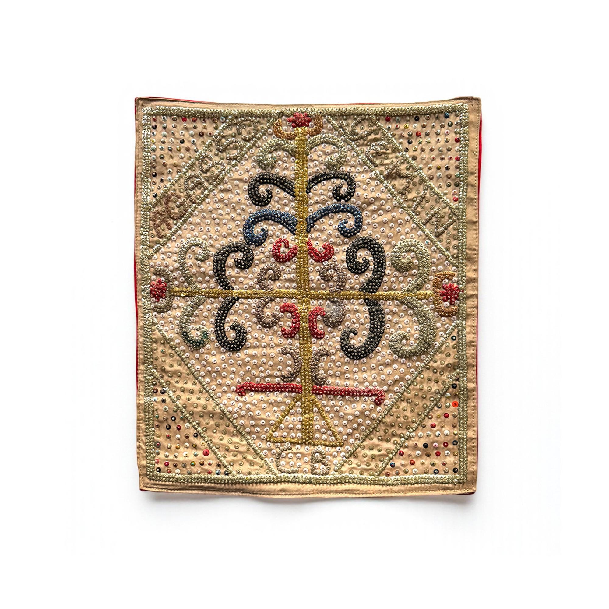 This original Haitian Vodou drapo was created by master flagmaker Clotaire Bazile in the 1980s–90s. Measuring 16 x 18 inches, the sequined textile features a bold cross/tree form, with the inscription “Agasso Vemin” stitched across the upper edge. The flag bears Bazile’s signature “CB” at the bottom.