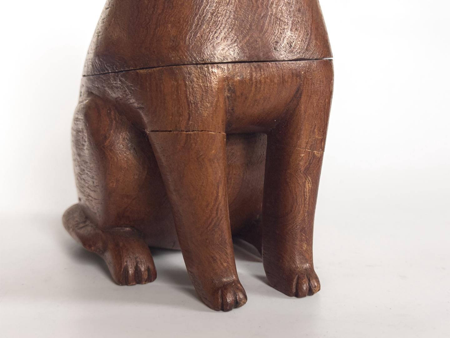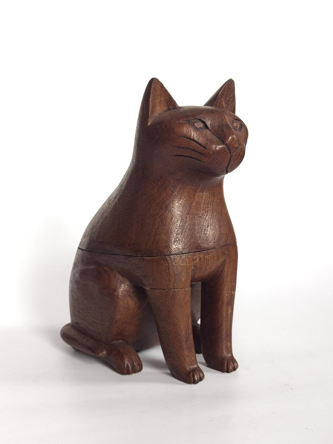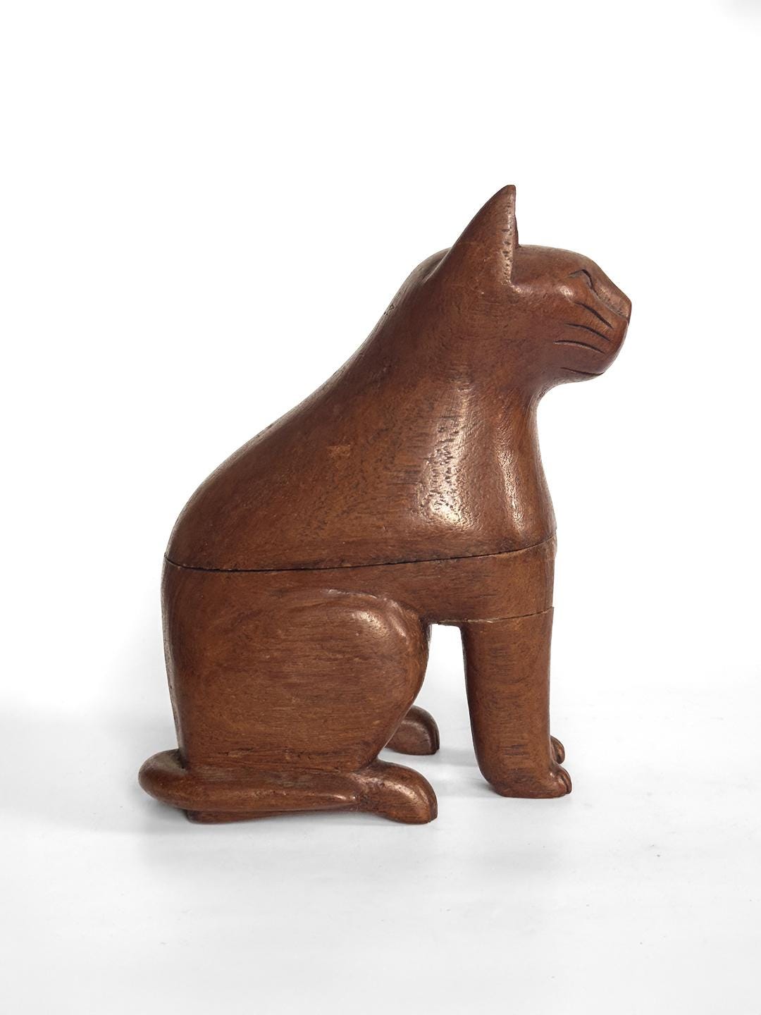 A unique folk carved cat sculpture in mahogany, measuring 8" x 5" x 4". At first glance a simple figure, the upper body cleverly lifts away to reveal a hidden compartment — perfect for stashing jewelry, money, keys, or small trinkets.
