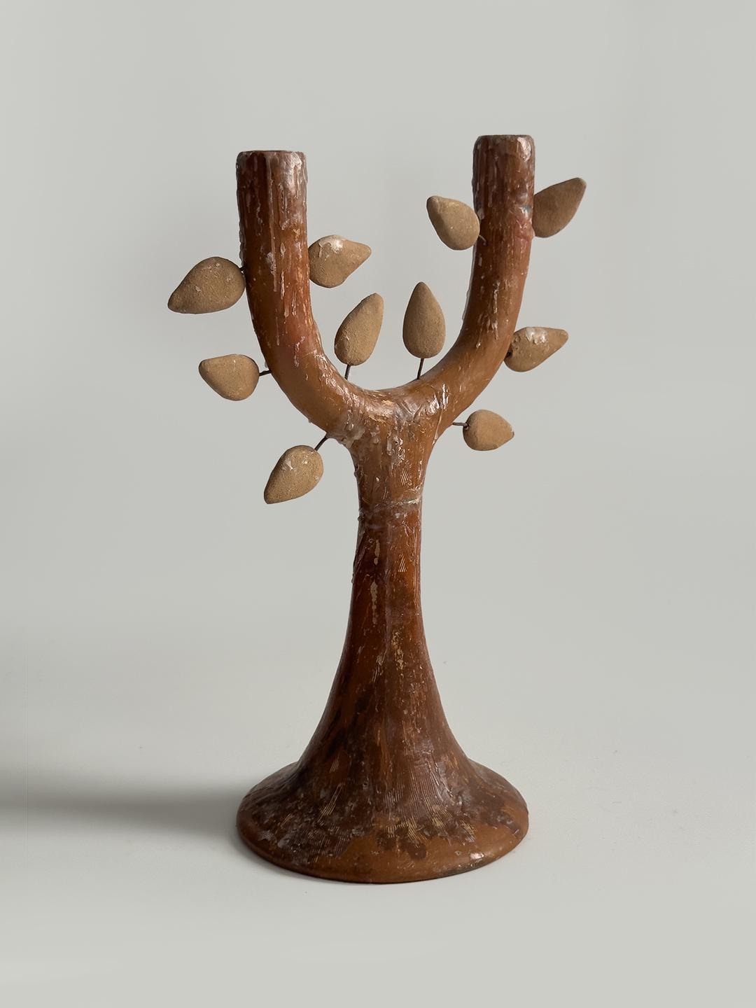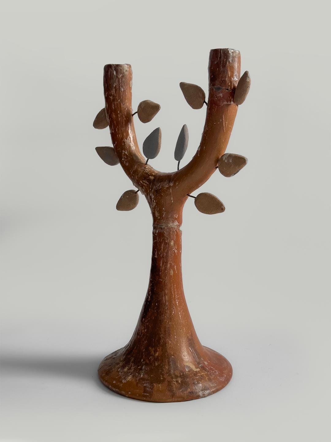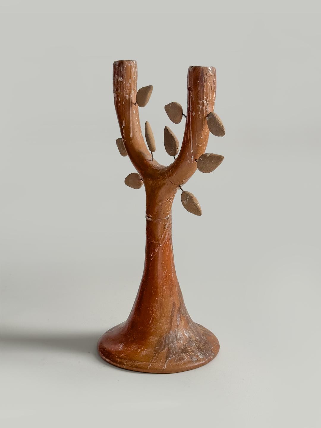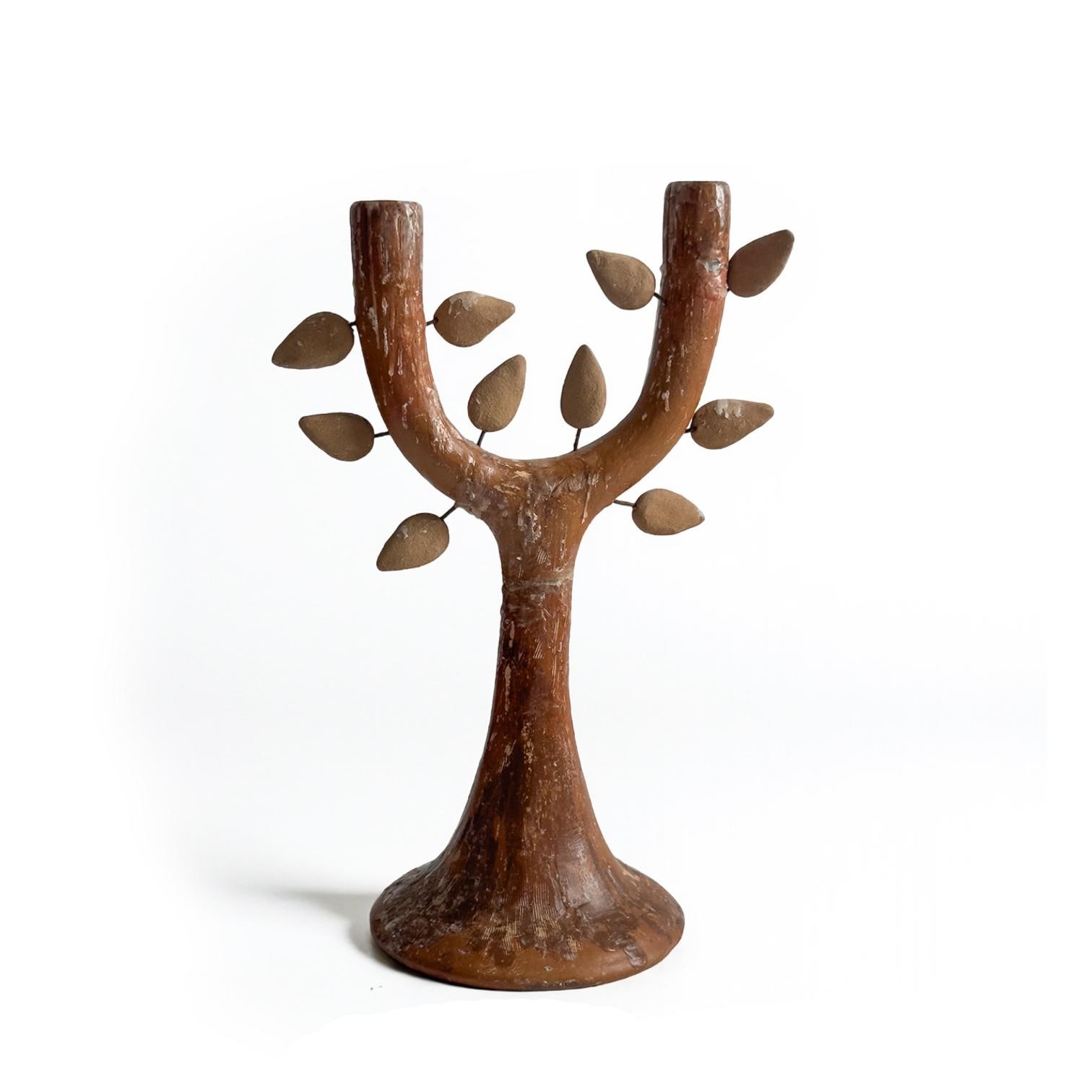 A striking example of traditional Mexican folk art, this hand-sculpted clay Tree of Life candelabra stands 12 inches tall and embodies the vibrant spirit and symbolism of rural craftsmanship. Rendered in a primitive, expressive style, the piece features organic detailing and a warm, earthy finish. While it shows a few surface cracks consistent with age and handmade origin, they do not detract from its beauty or authenticity—they instead testify to its handmade, time-worn charm.
