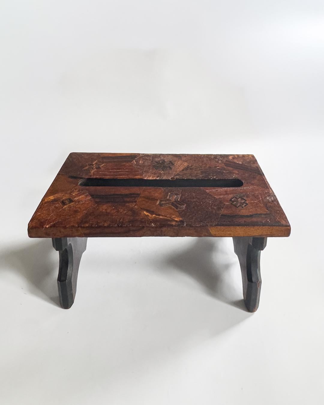 An exceptional example of American primitive craftsmanship, this handmade folding stool combines ingenuity of design with intricate decorative artistry. The cleverly hinged legs fold neatly beneath the seat for easy carrying—a practical detail that reflects both utility and creativity.