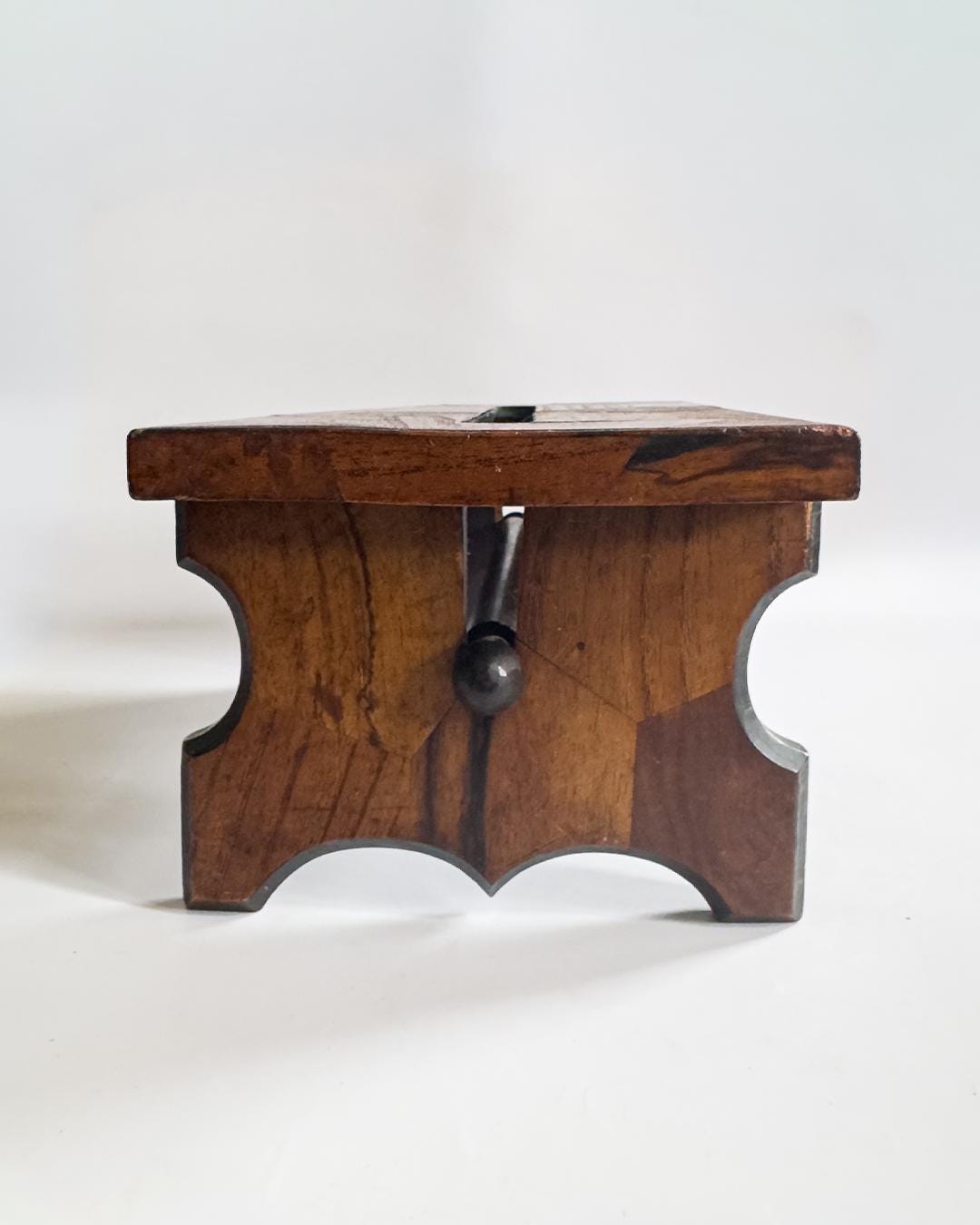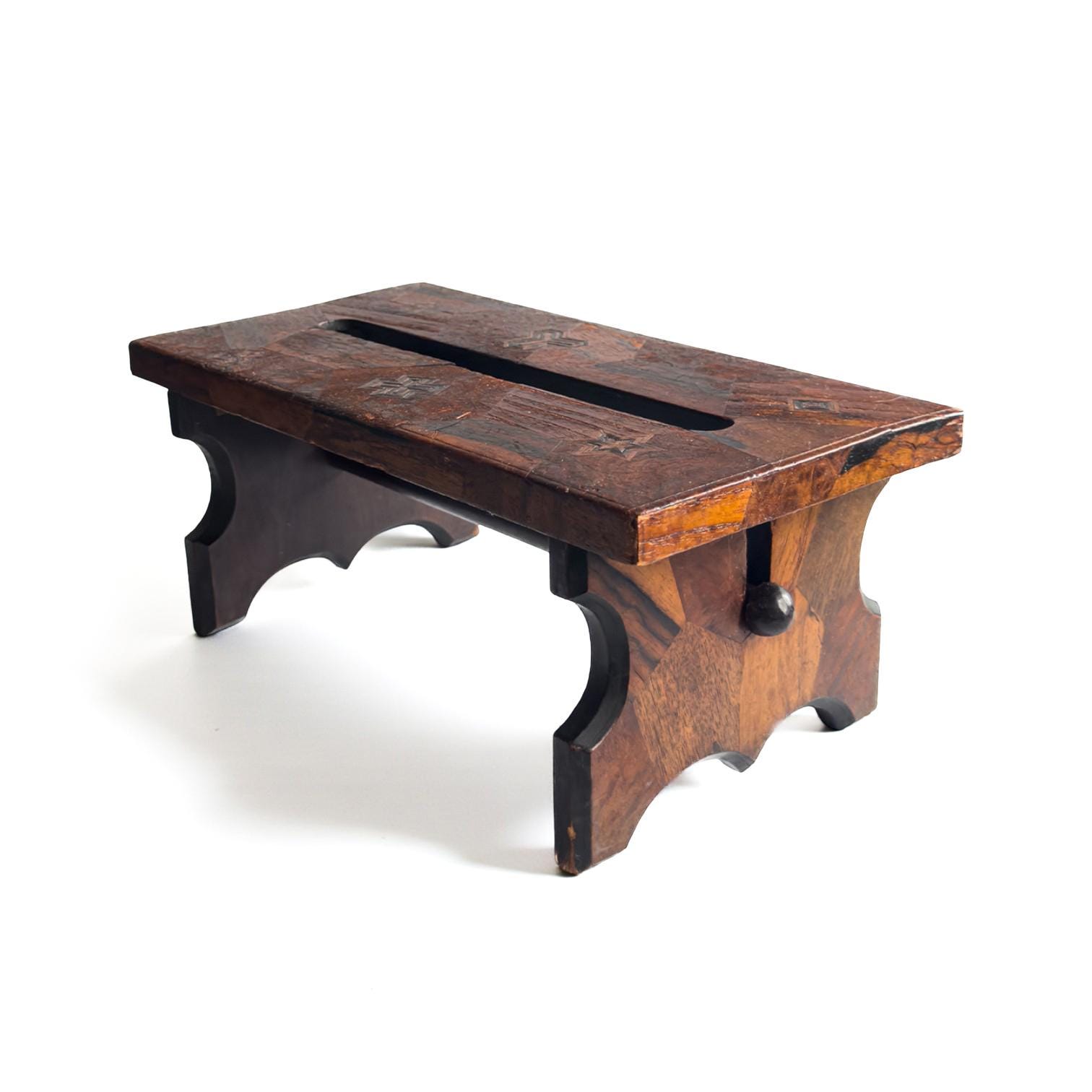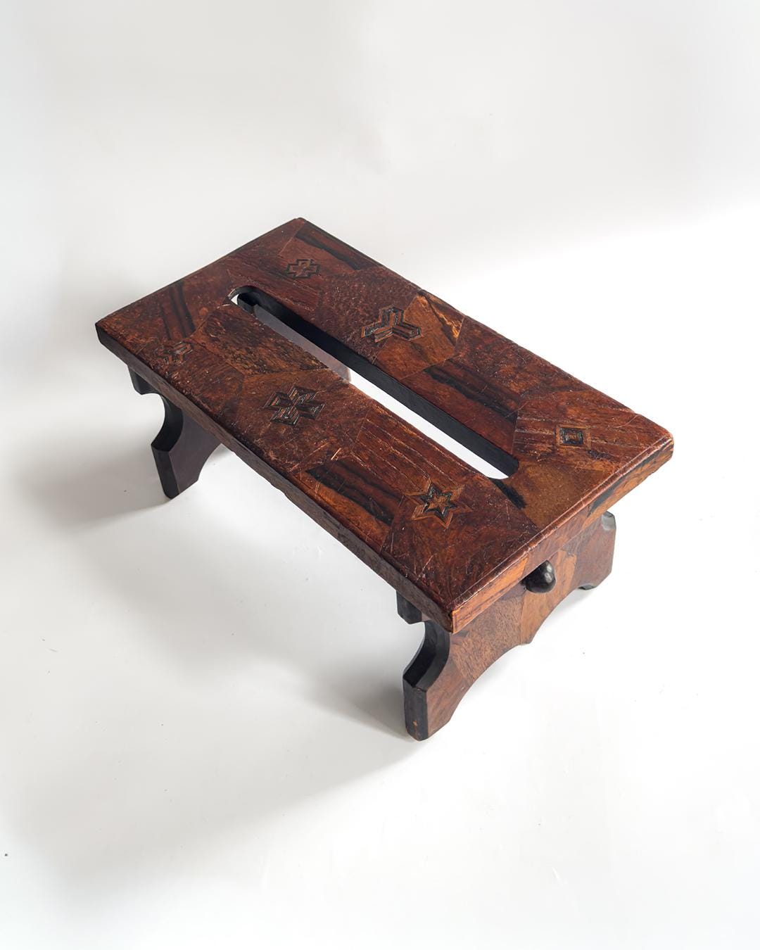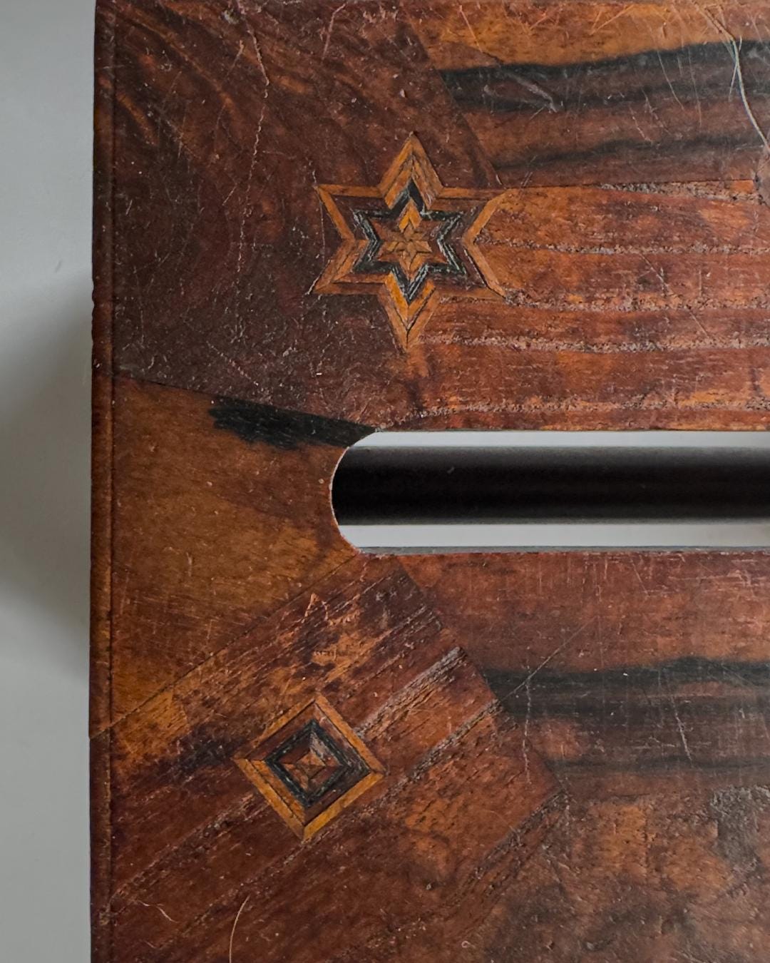 The stool’s top is composed of hand-cut marquetry in a striking pattern of stars and crosses, forming a complex web of tessellated wood pieces. Each inlay is carefully fitted, creating a mesmerizing surface that reveals both patience and precision. Possibly the work of an apprentice or self-taught craftsman, the piece embodies the expressive individuality and symbolic richness of early American vernacular design.