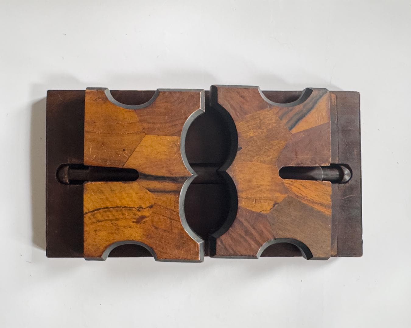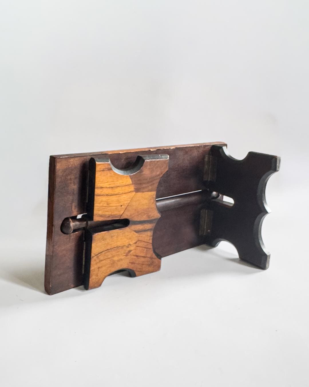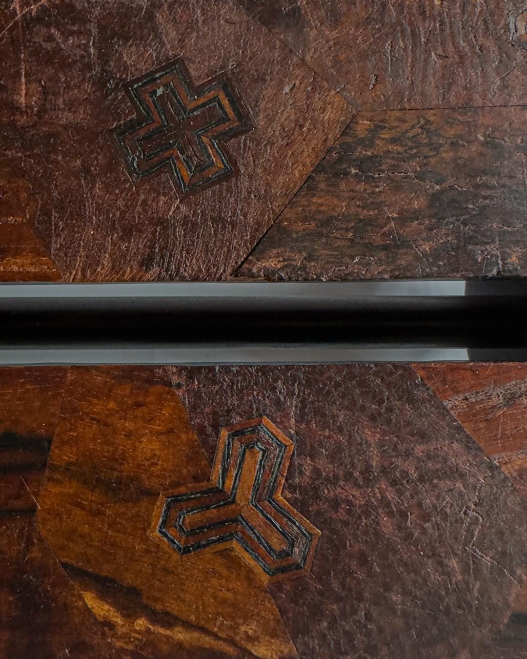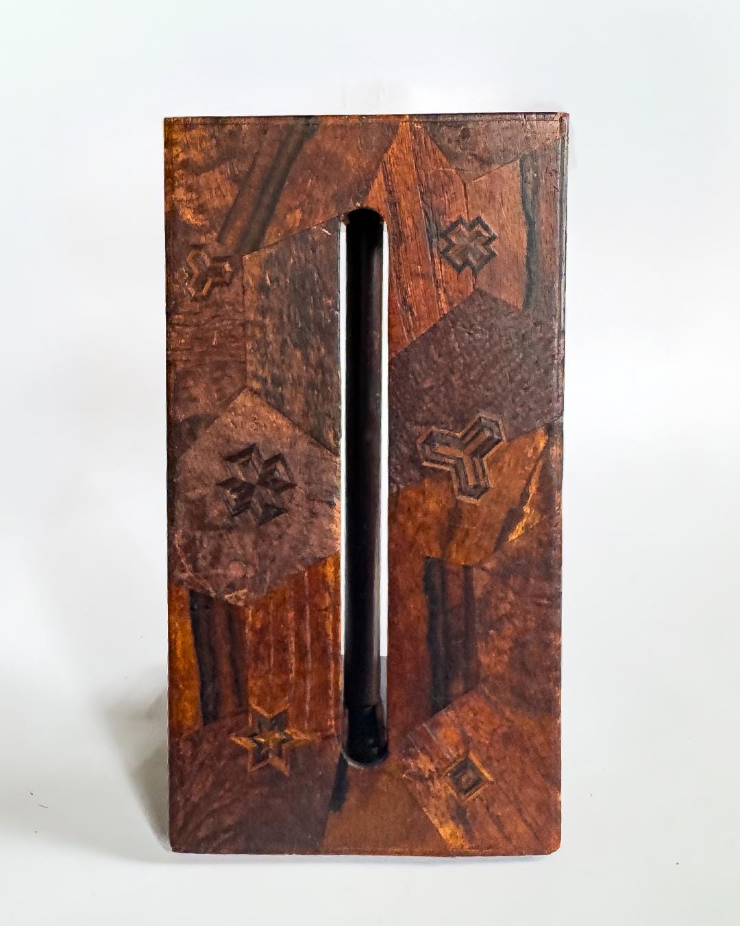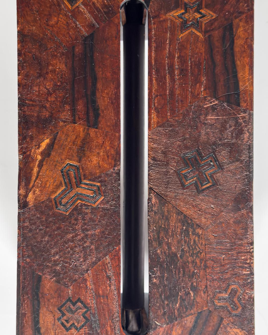 The stool’s top is composed of hand-cut marquetry in a striking pattern of stars and crosses, forming a complex web of tessellated wood pieces. Each inlay is carefully fitted, creating a mesmerizing surface that reveals both patience and precision. Possibly the work of an apprentice or self-taught craftsman, the piece embodies the expressive individuality and symbolic richness of early American vernacular design.