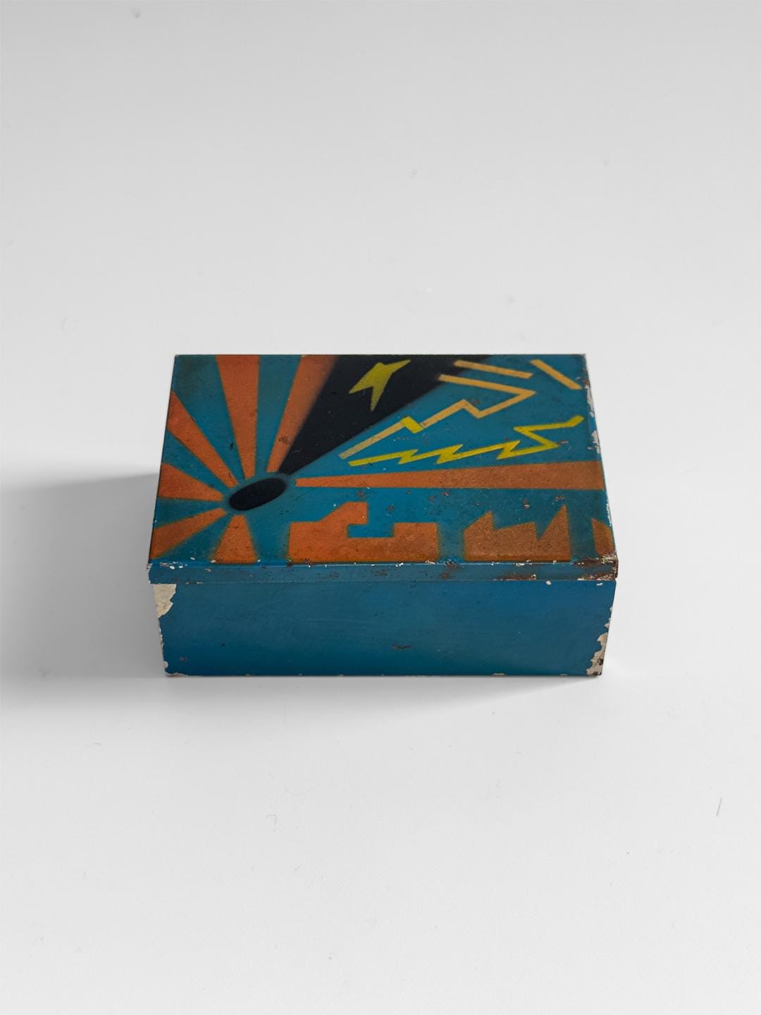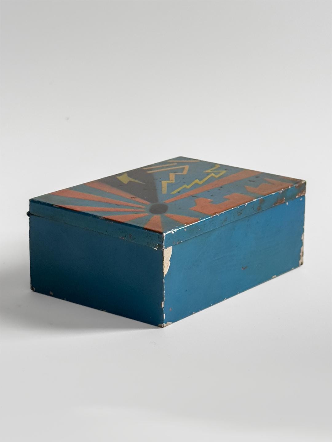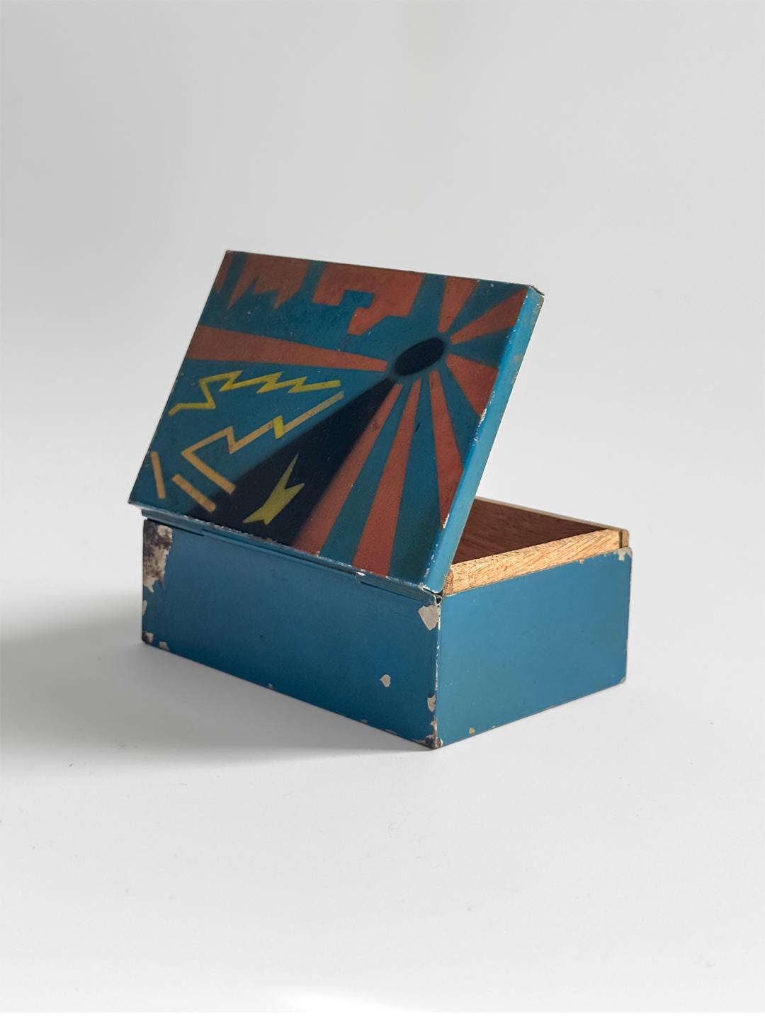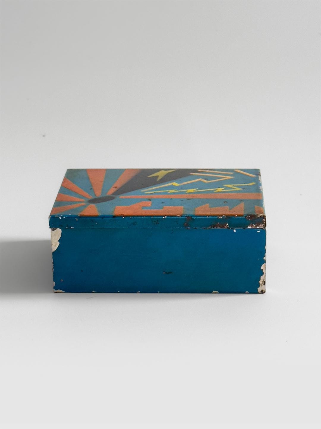Art Deco cigarette box dating to the 1930s–1940s, crafted from metal with a warm wood-lined interior and a securely hinged lid. The top features a bold enamel design in blue, orange, yellow, and black—geometric abstractions that reflect the influence of Bauhaus and early modernist aesthetics.