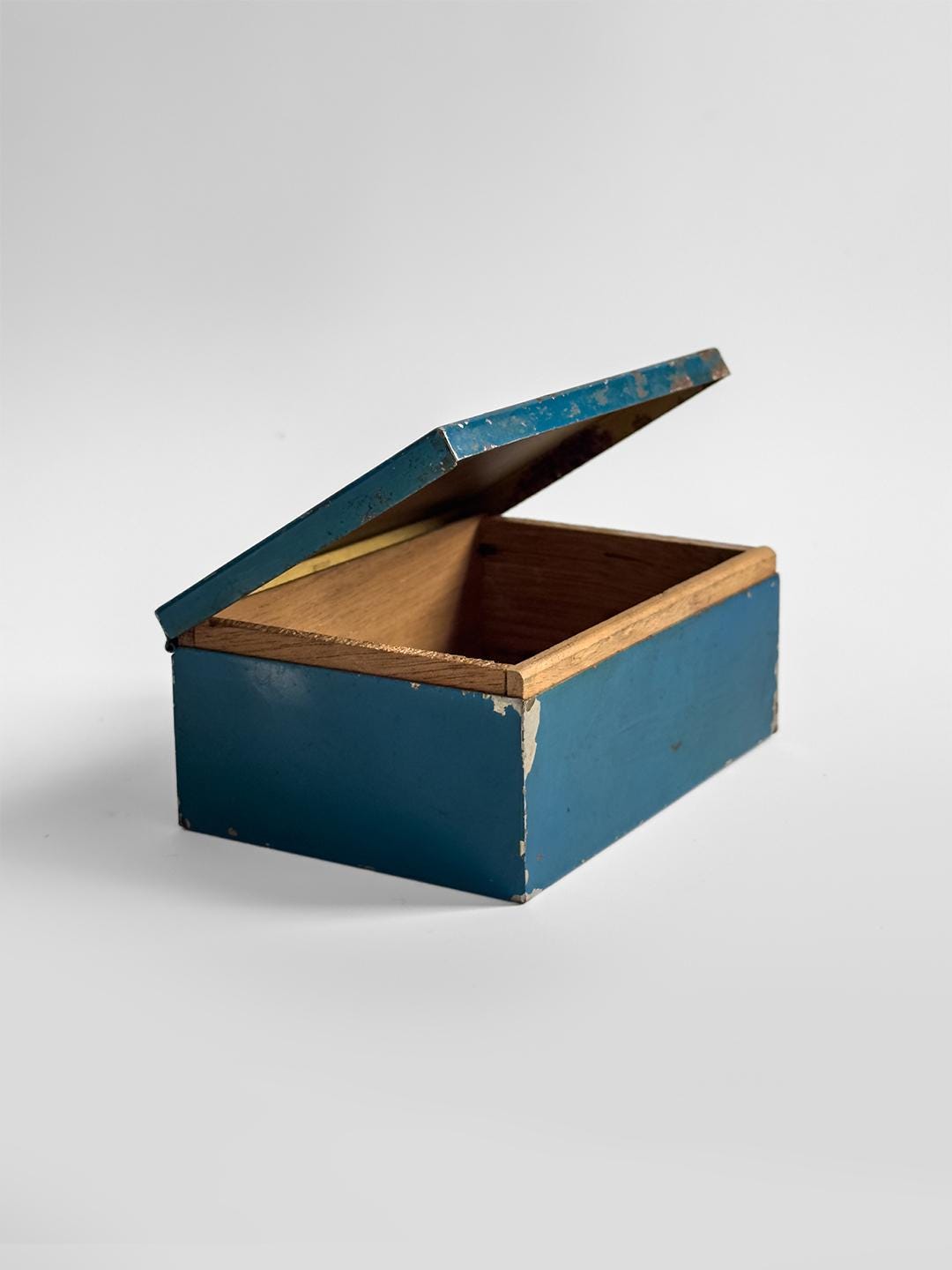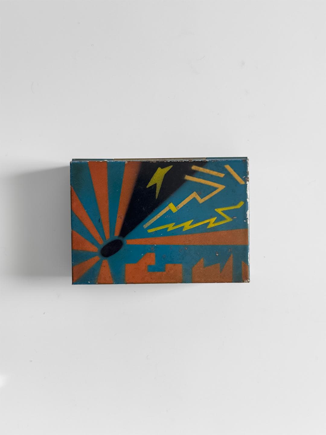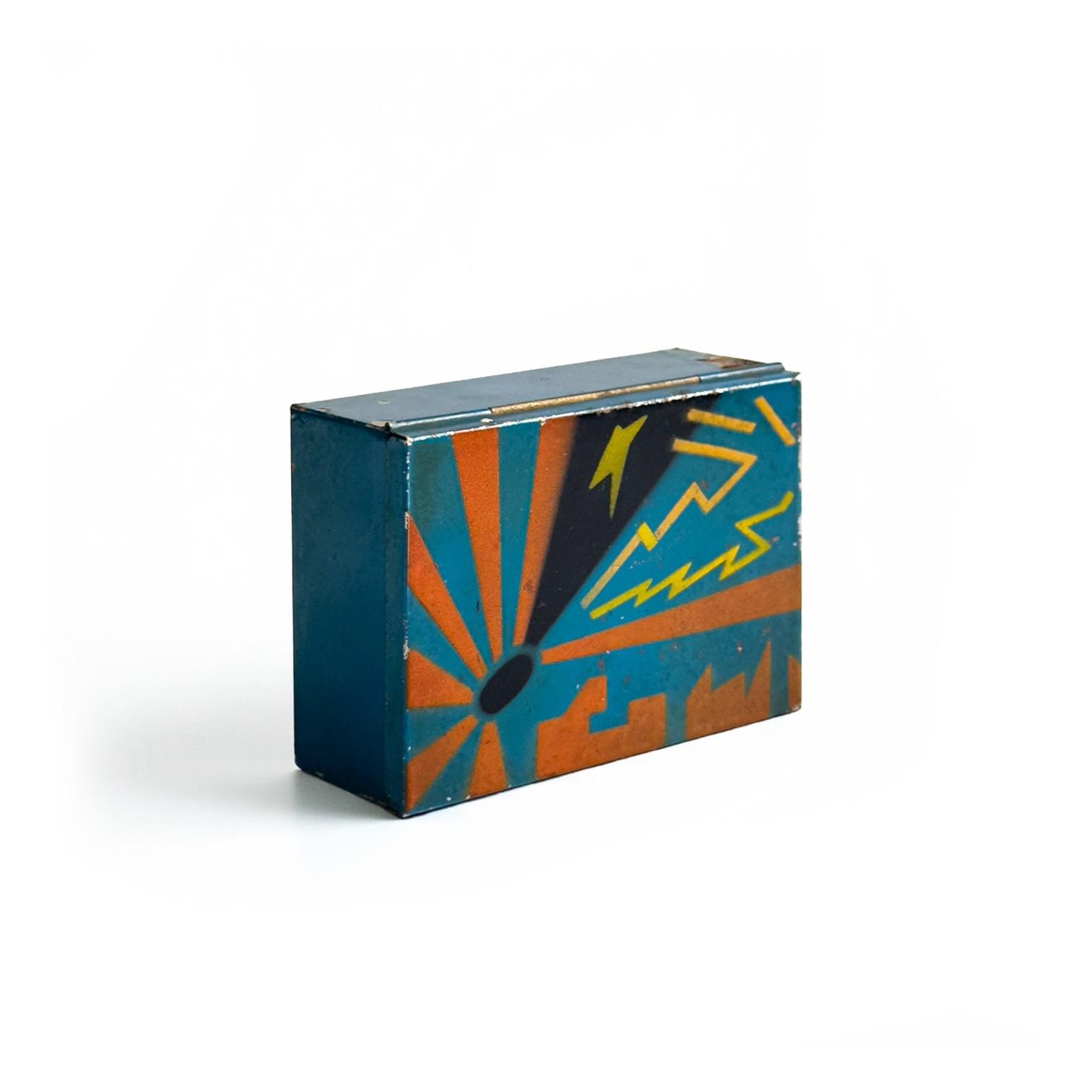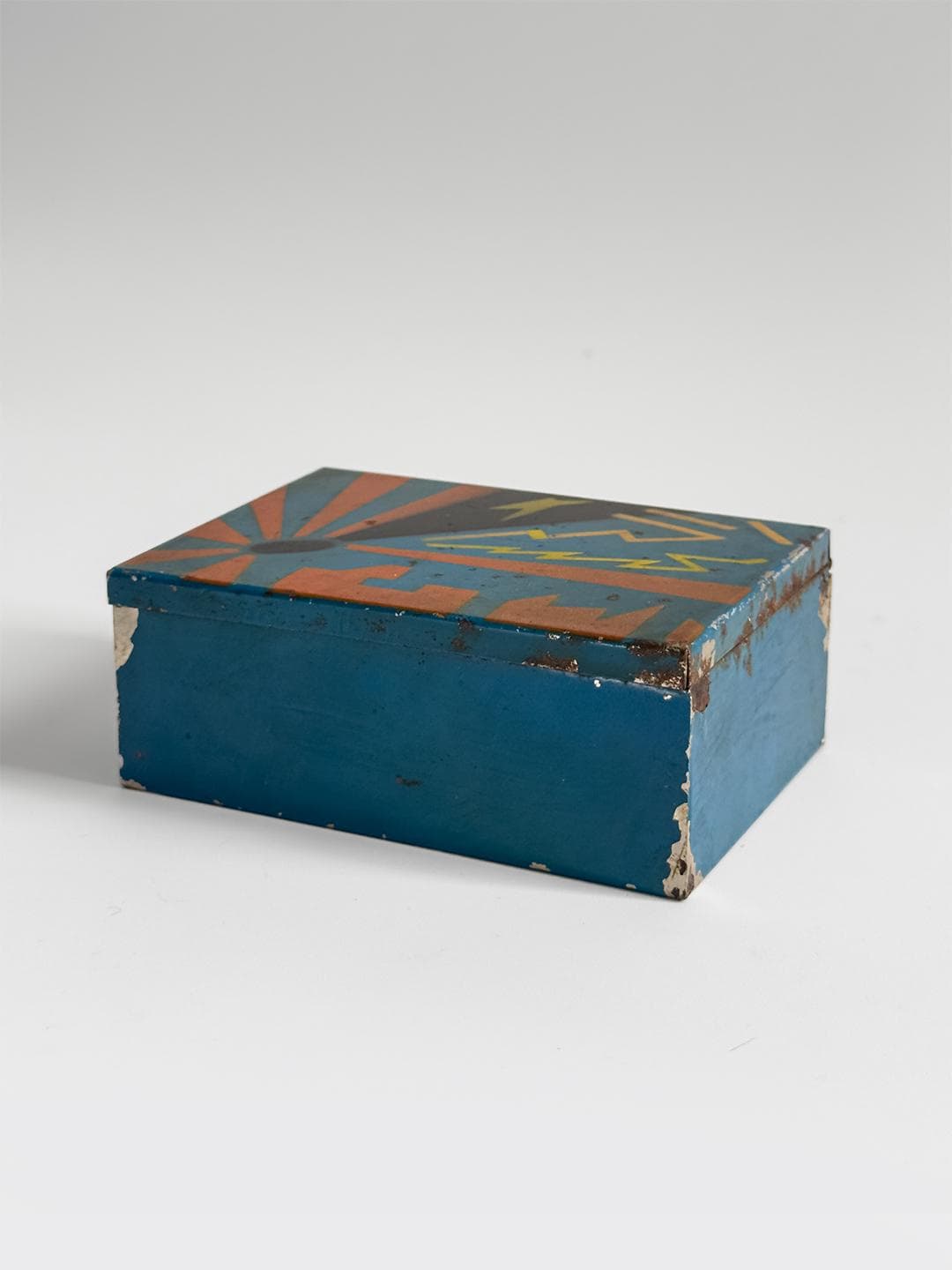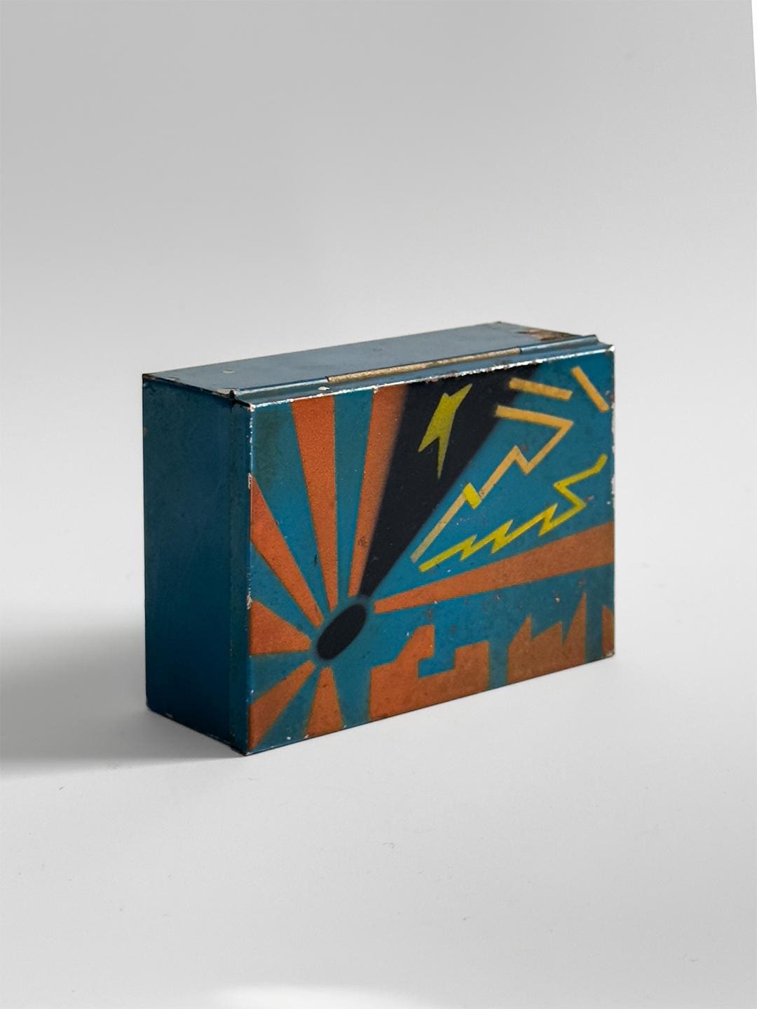Art Deco cigarette box dating to the 1930s–1940s, crafted from metal with a warm wood-lined interior and a securely hinged lid. The top features a bold enamel design in blue, orange, yellow, and black—geometric abstractions that reflect the influence of Bauhaus and early modernist aesthetics.