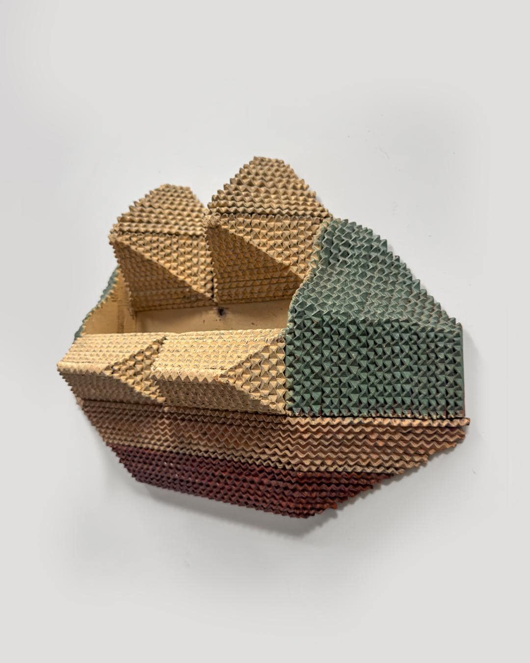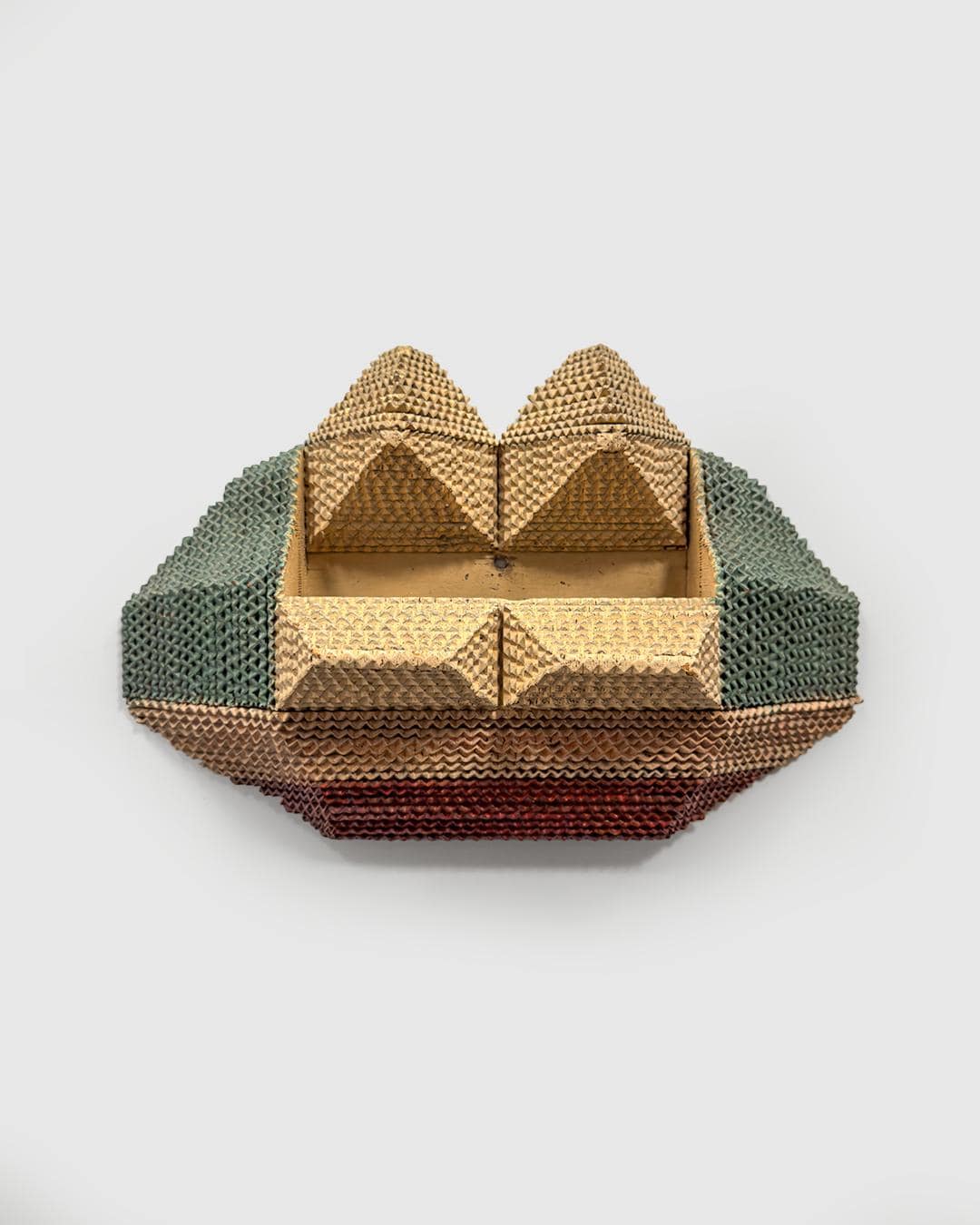 An extraordinary example of late tramp art ingenuity, this wall-hanging “comb box” measures 15 x 10 x 4 inches and showcases a sophisticated geometric construction rarely seen in the form. Built using layered chip-carved techniques, its sharply faceted planes and angular tiers recall early Deco influences filtered through vernacular craftsmanship.