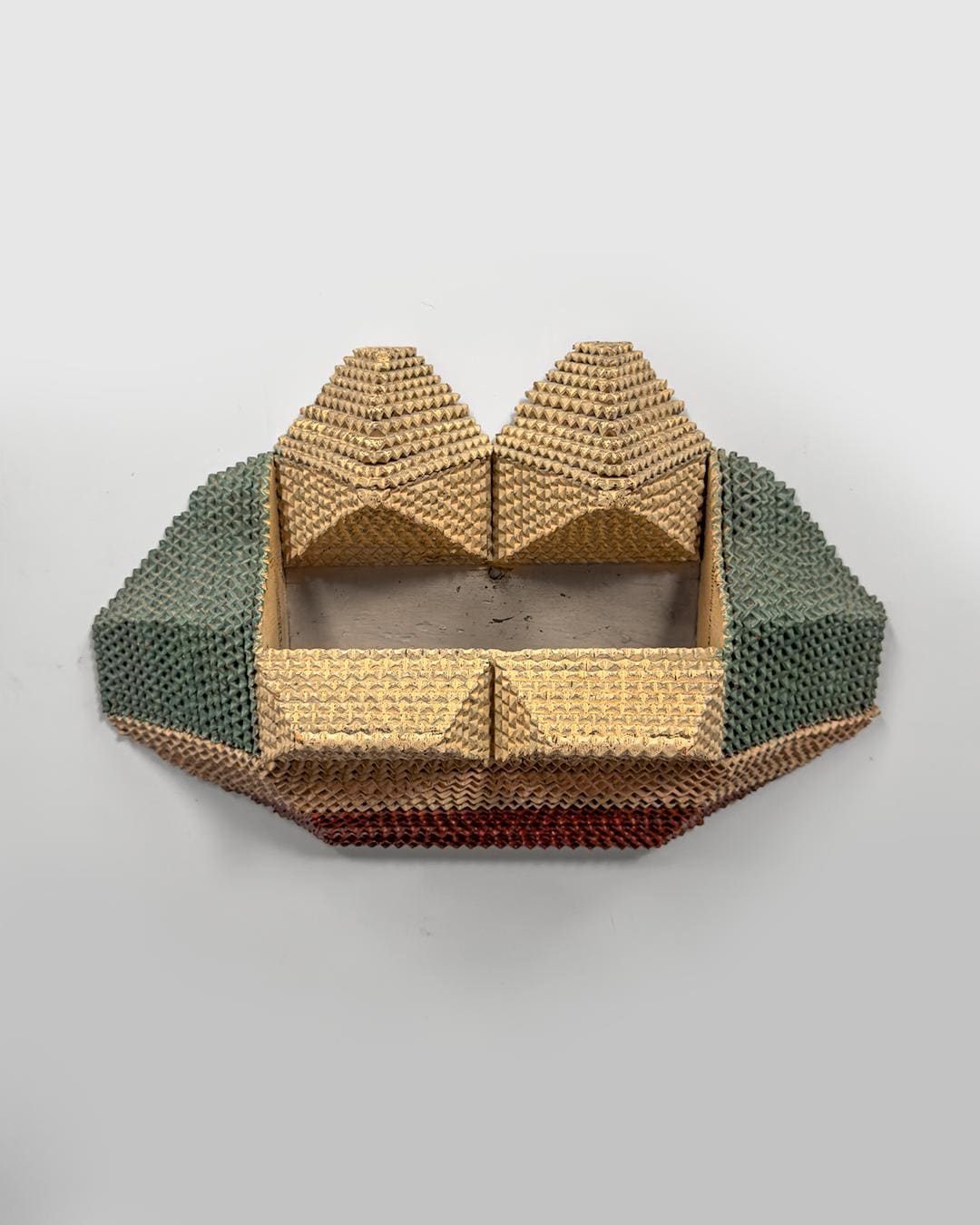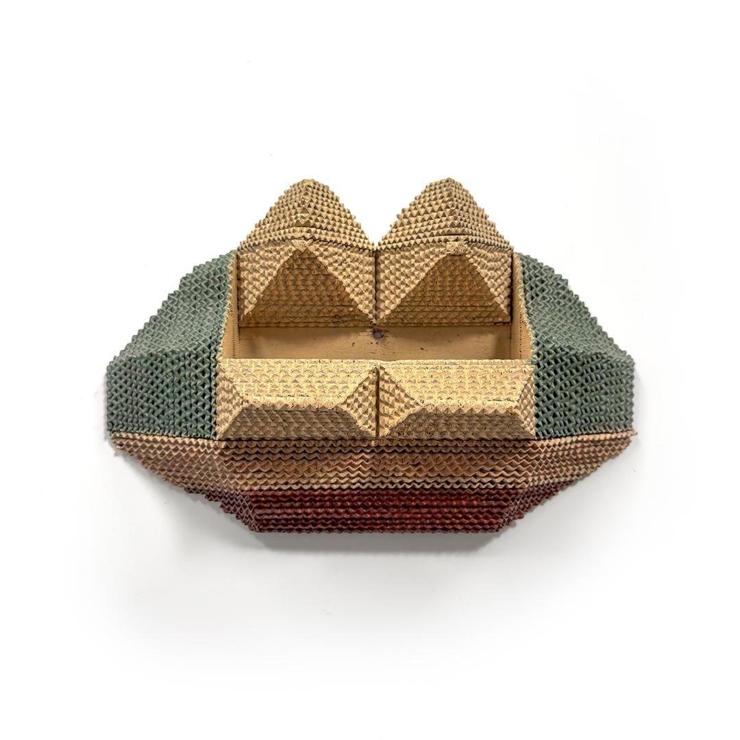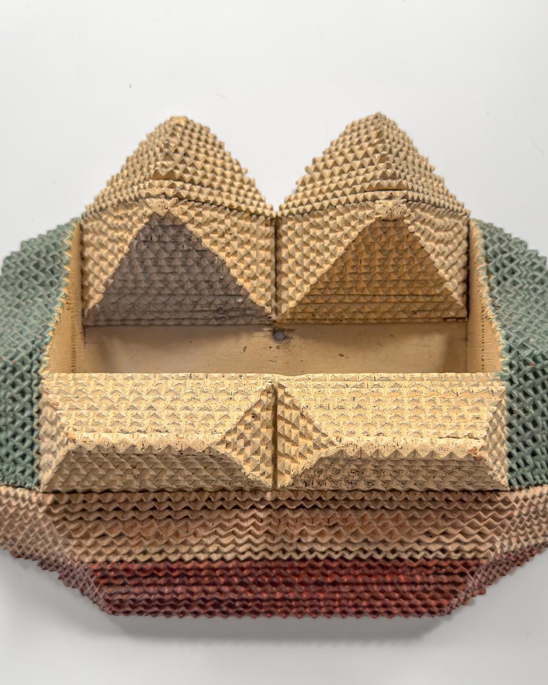 Painted in a refined palette of cream, mauve, tan, and mossy green, the surface reveals a complex rhythm of color and shadow—simultaneously architectural and ornamental. Likely dating from the 1930s–1940s, this piece exemplifies the creative evolution of tramp art as makers experimented with symmetry, color, and function.