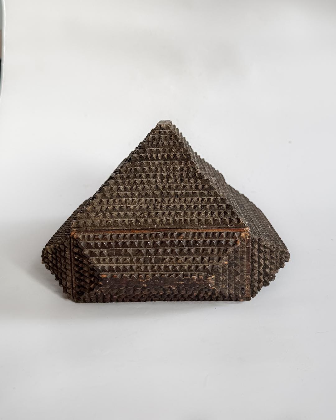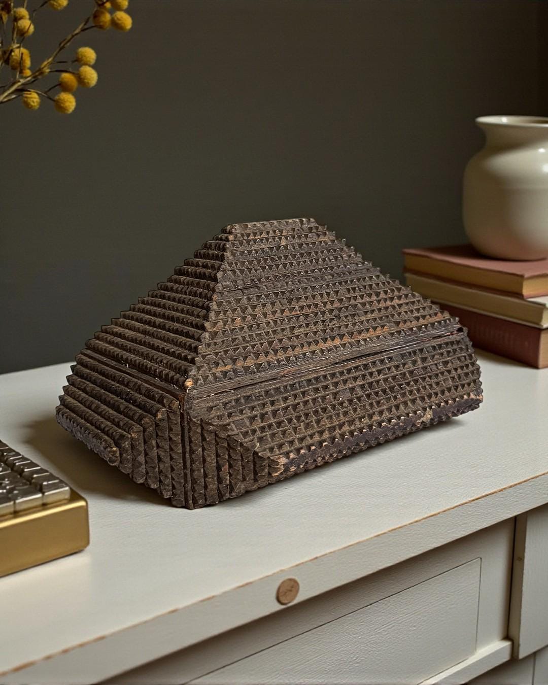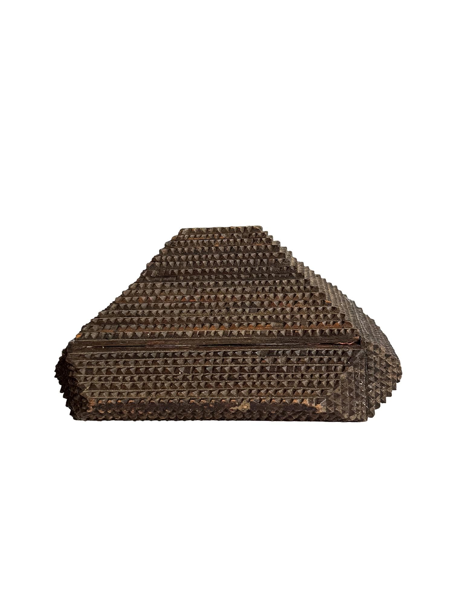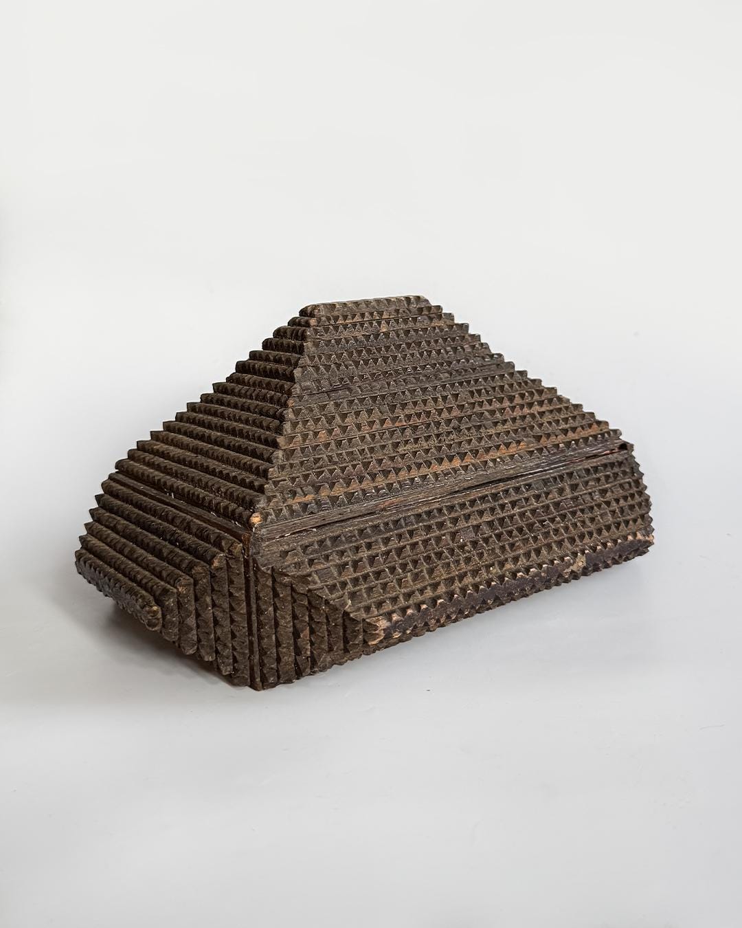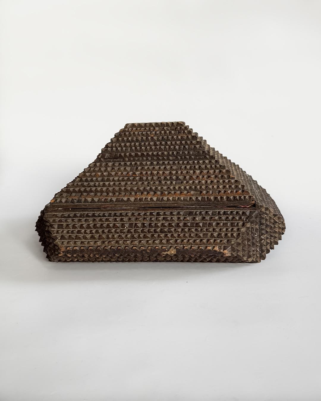 Excellent c. early 20th Century pyramidal lidded tramp box. The box has a remarkable total of 14 layers with each meticulously carved. The precision of each layer results in consistent spiked texture. Some of tramp art's defining characteristics include chip or notch carving, the reclamation of cheap or available wood such as that from cigar boxes and shipping crates, the use of simple tools such as penknives, and the layering of materials into geometric shapes through glue or nails. 11" x 8" x 7"
