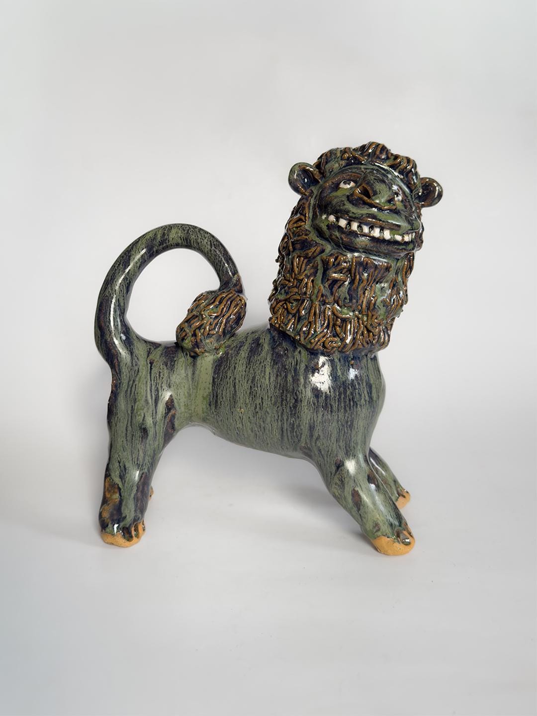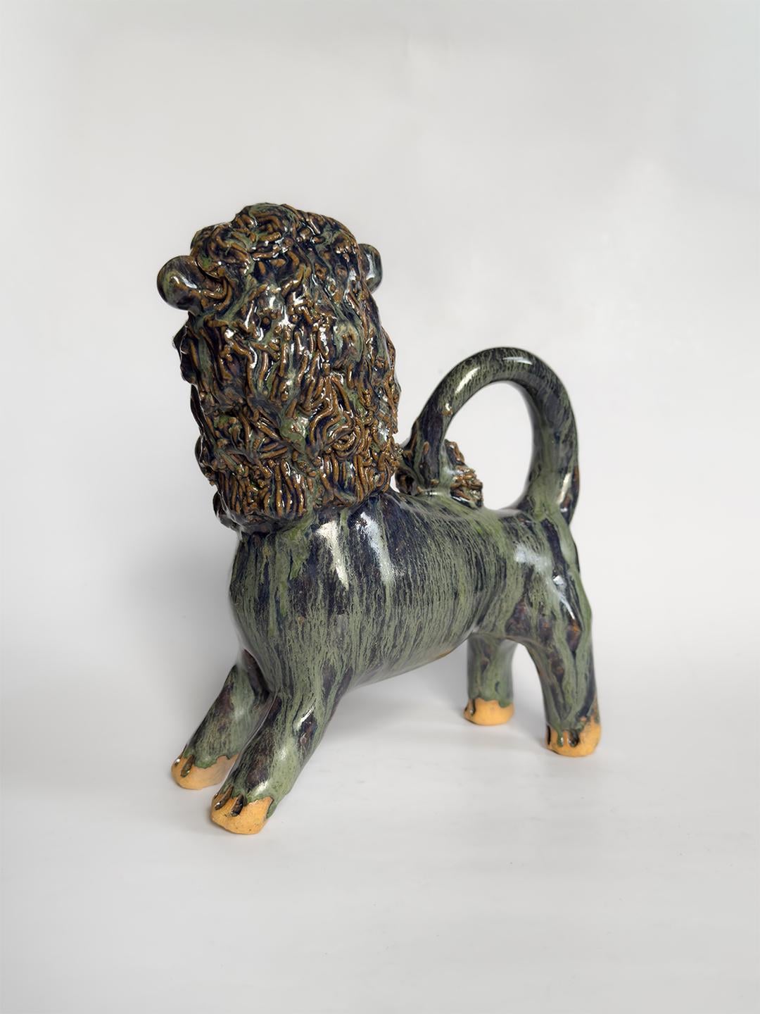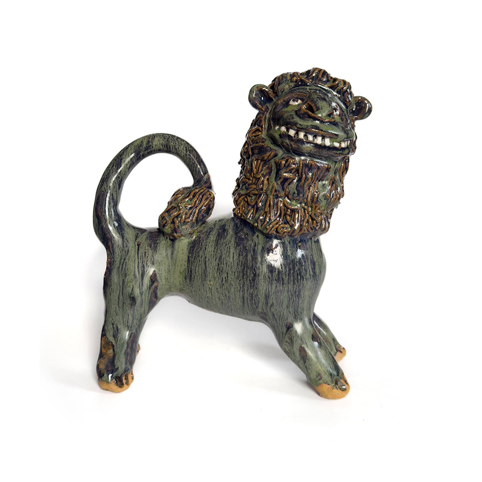 Stoneware lion by South Carolina folk artist Marvin Bailey. The figure is hand-built with clearly defined facial features and a textured mane, finished in a green and blue run glaze that pools in the recesses of the surface. Signed to the underside. 8.5 x 8.5 x 3 inches