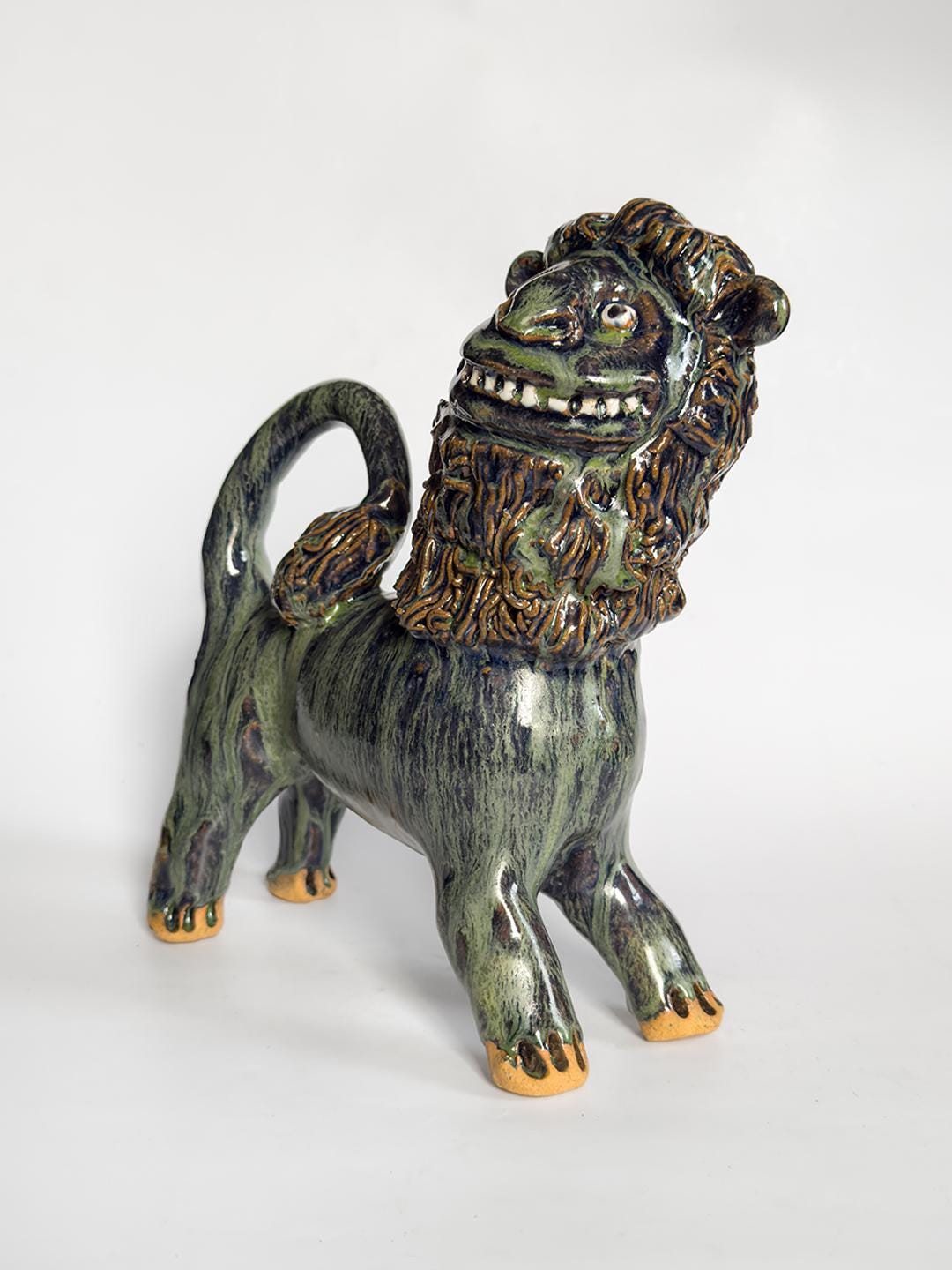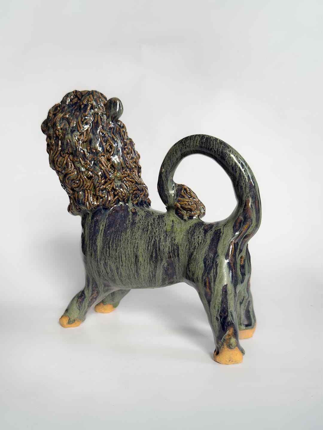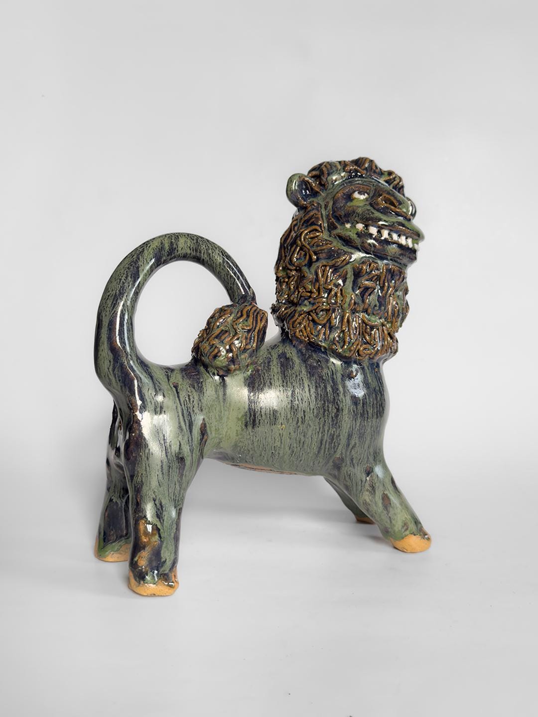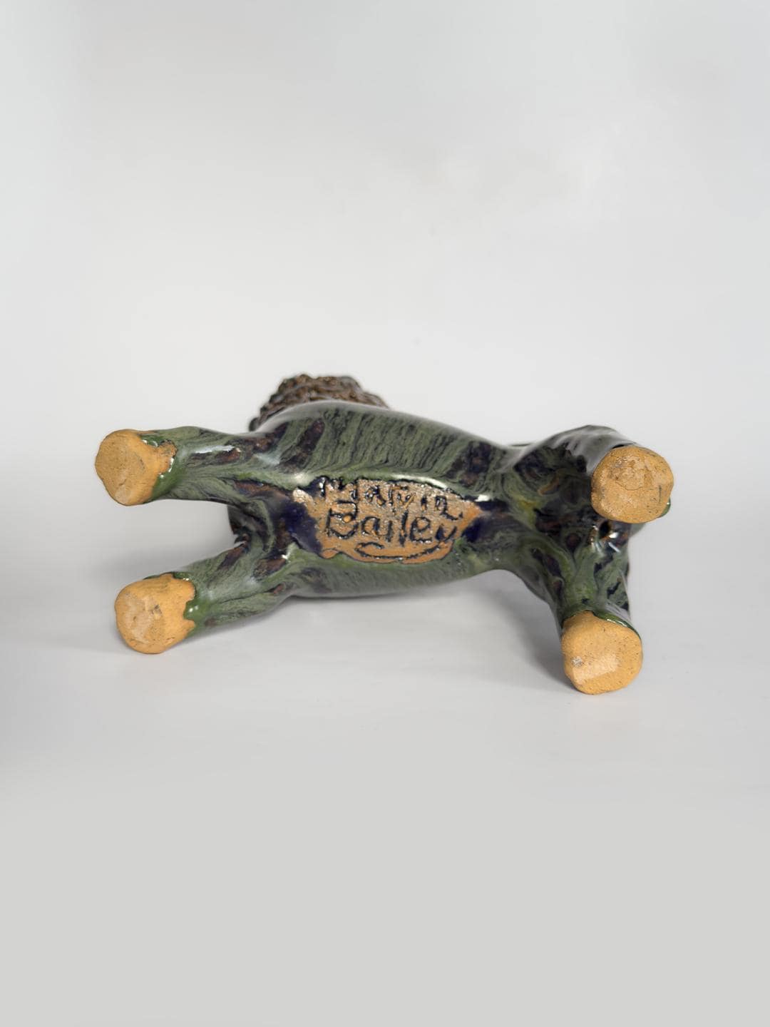 Stoneware lion by South Carolina folk artist Marvin Bailey. The figure is hand-built with clearly defined facial features and a textured mane, finished in a green and blue run glaze that pools in the recesses of the surface. Signed to the underside. 8.5 x 8.5 x 3 inches
