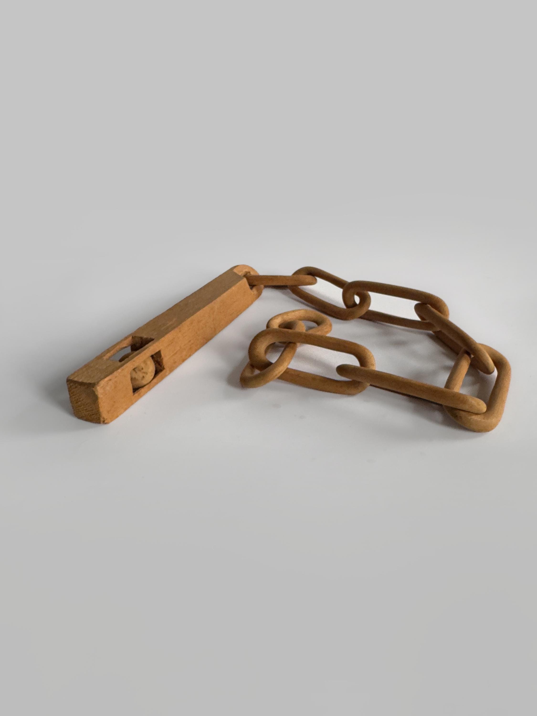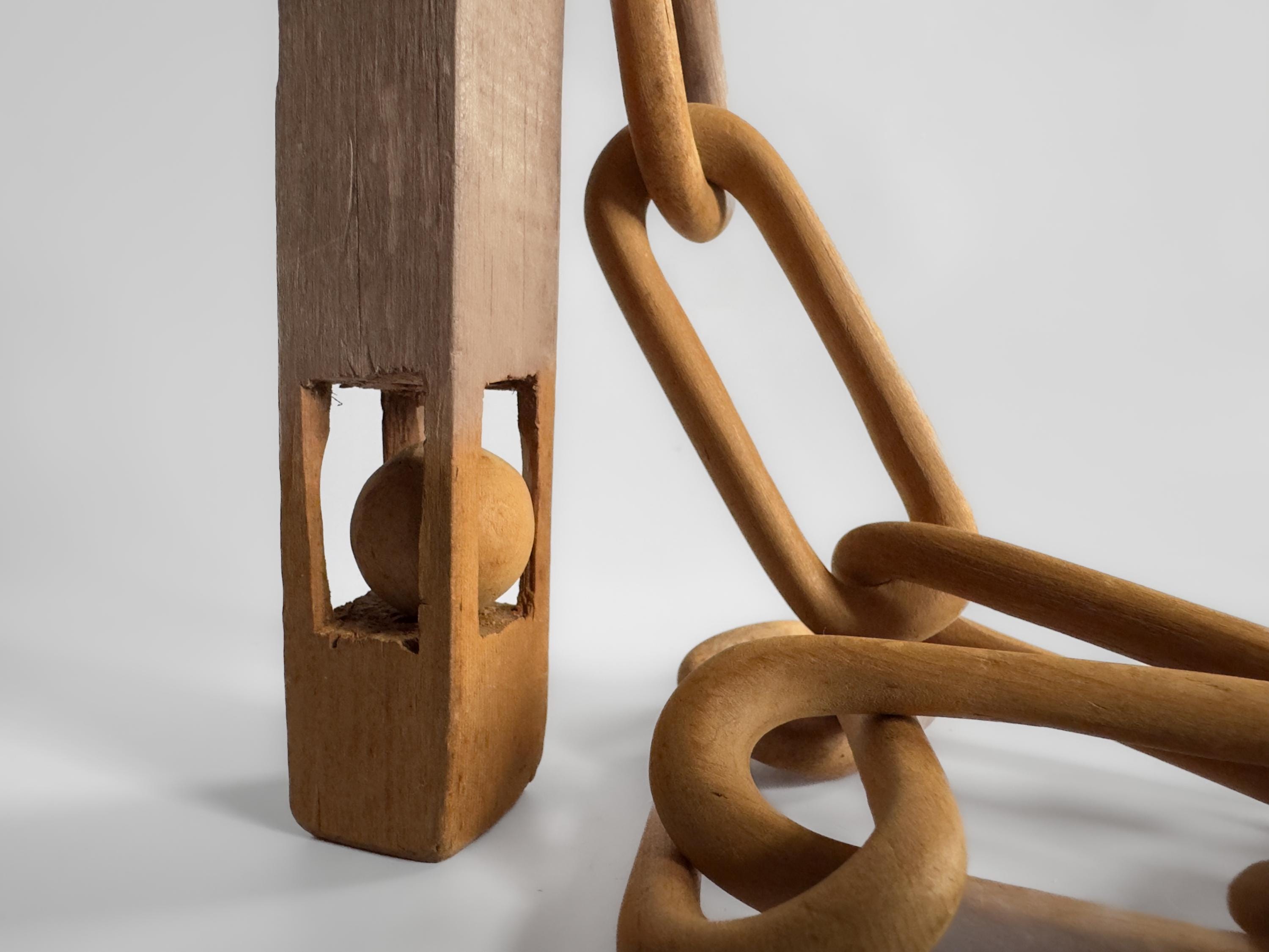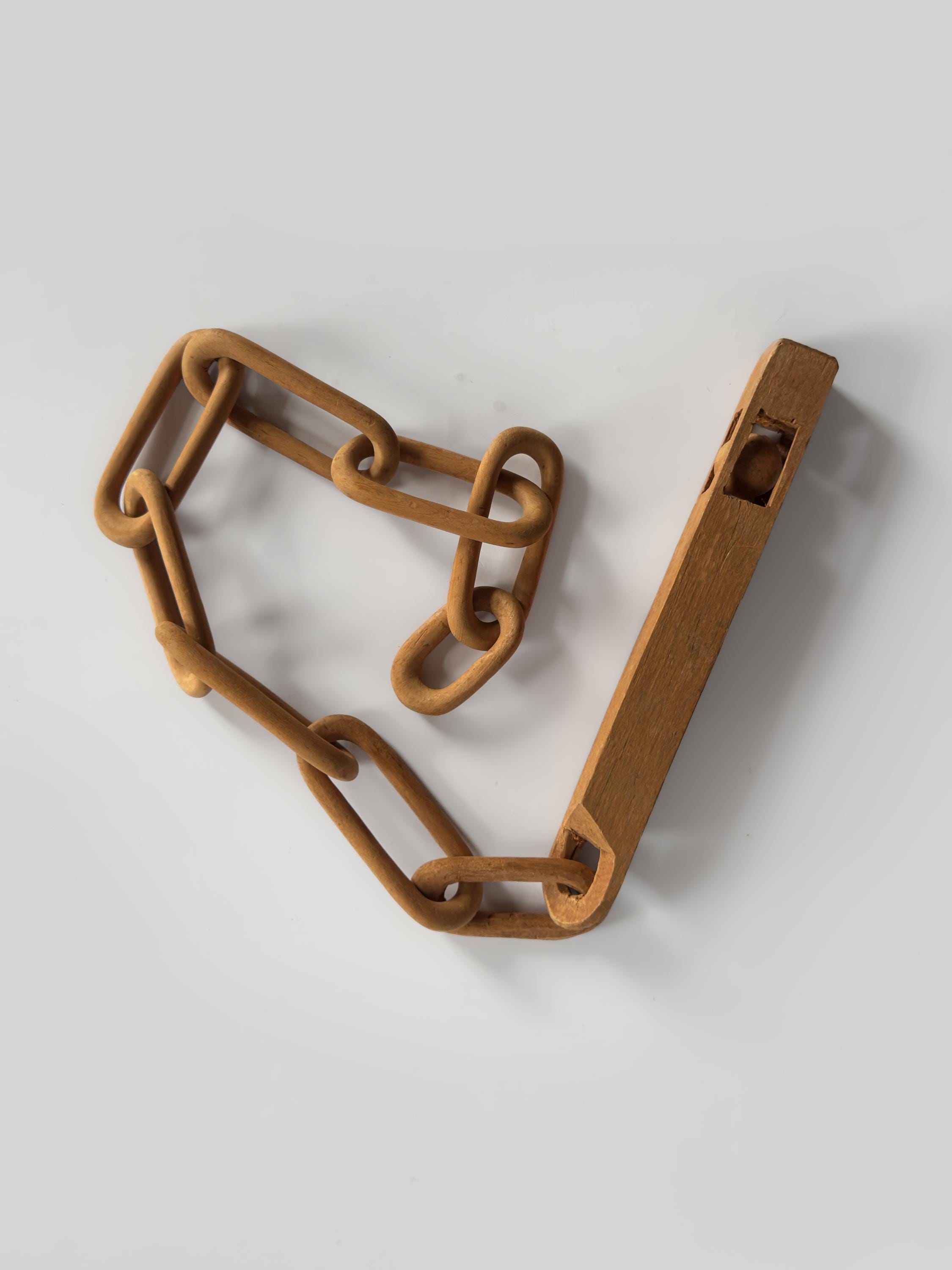Great example of a folk art whimsy chain with a carved baton with a ball in cage. Measures 11.5 inches by 1 inch. Baton measures 9.5 x 1 inches. Chain measures 24 x 1.5 inches