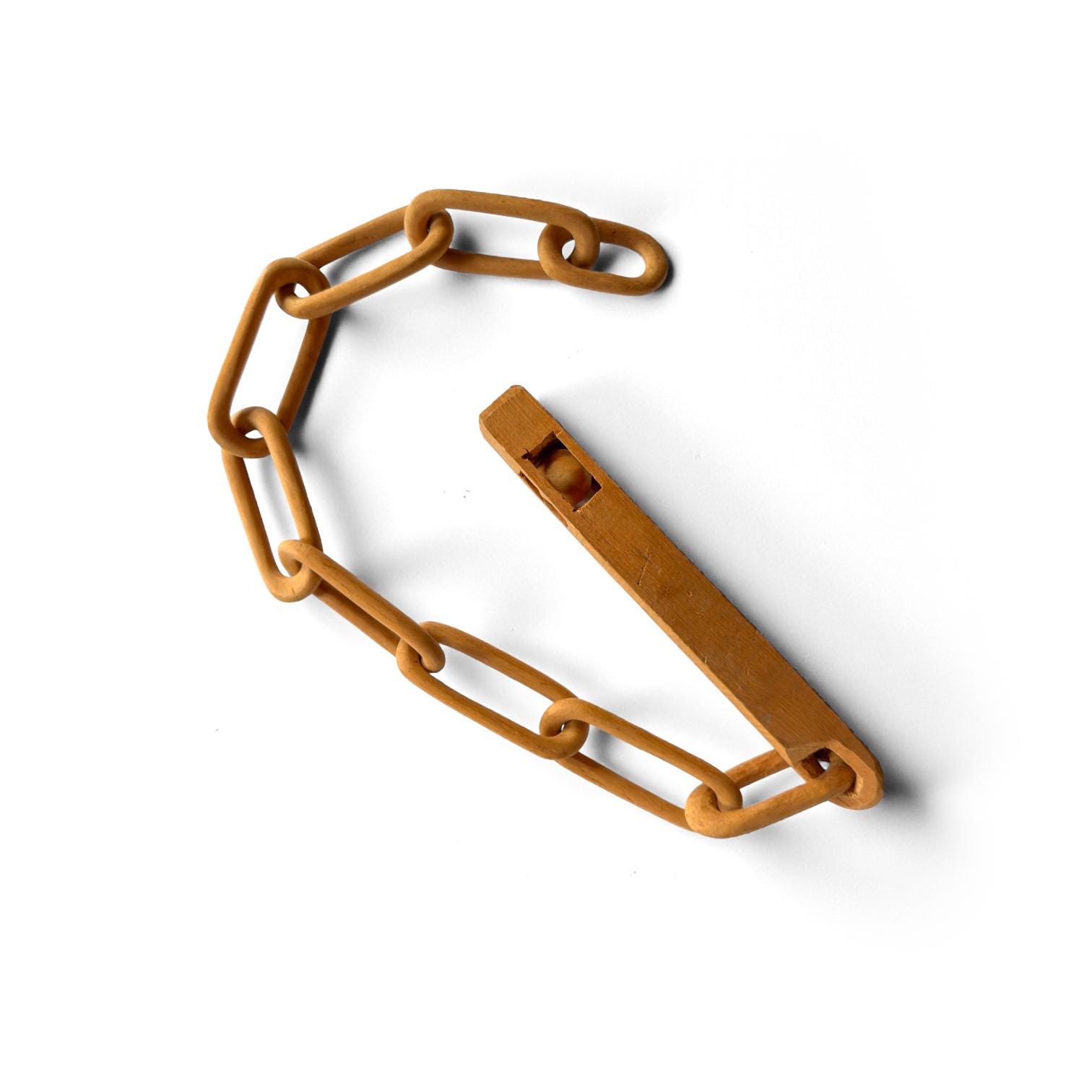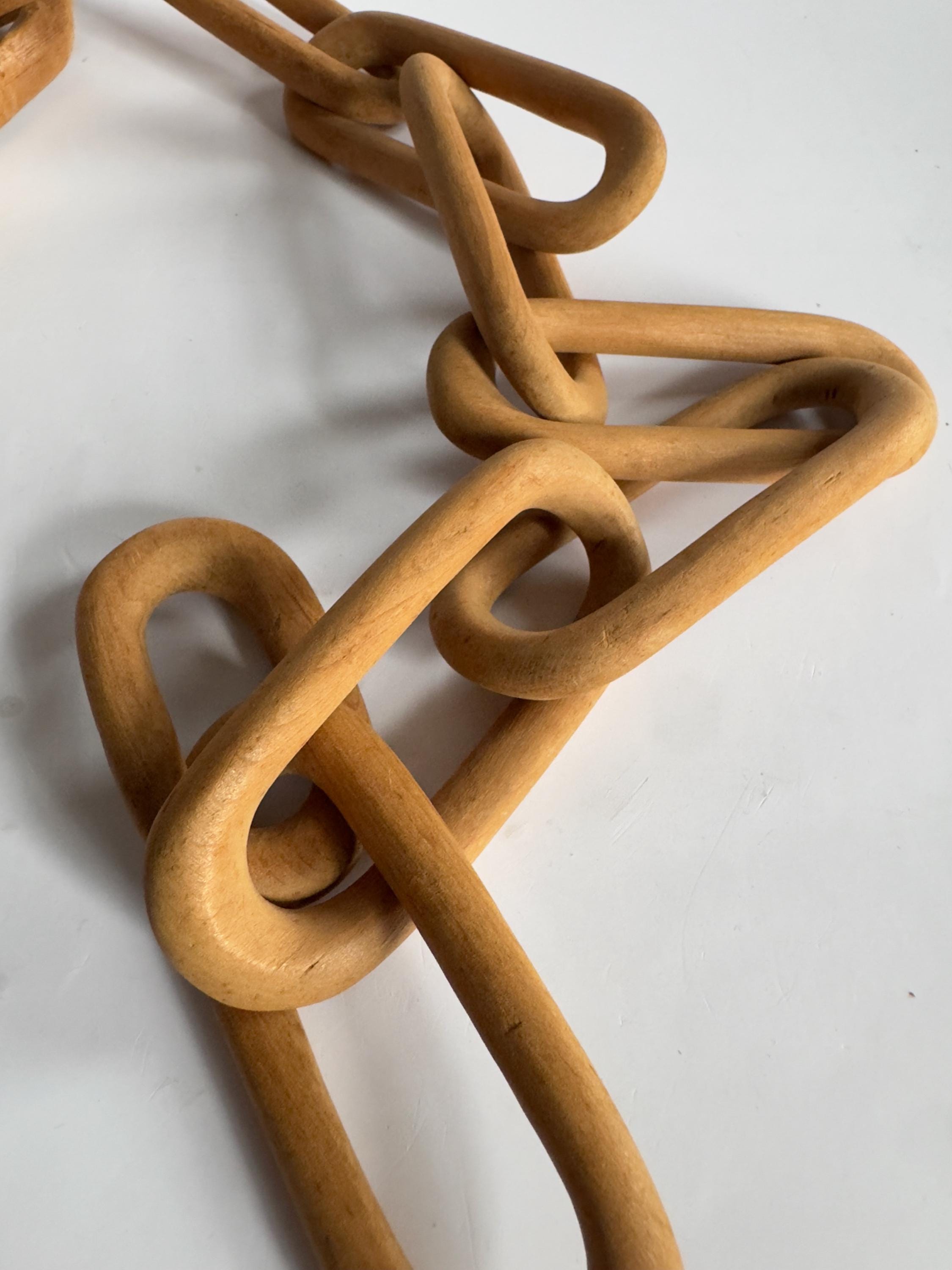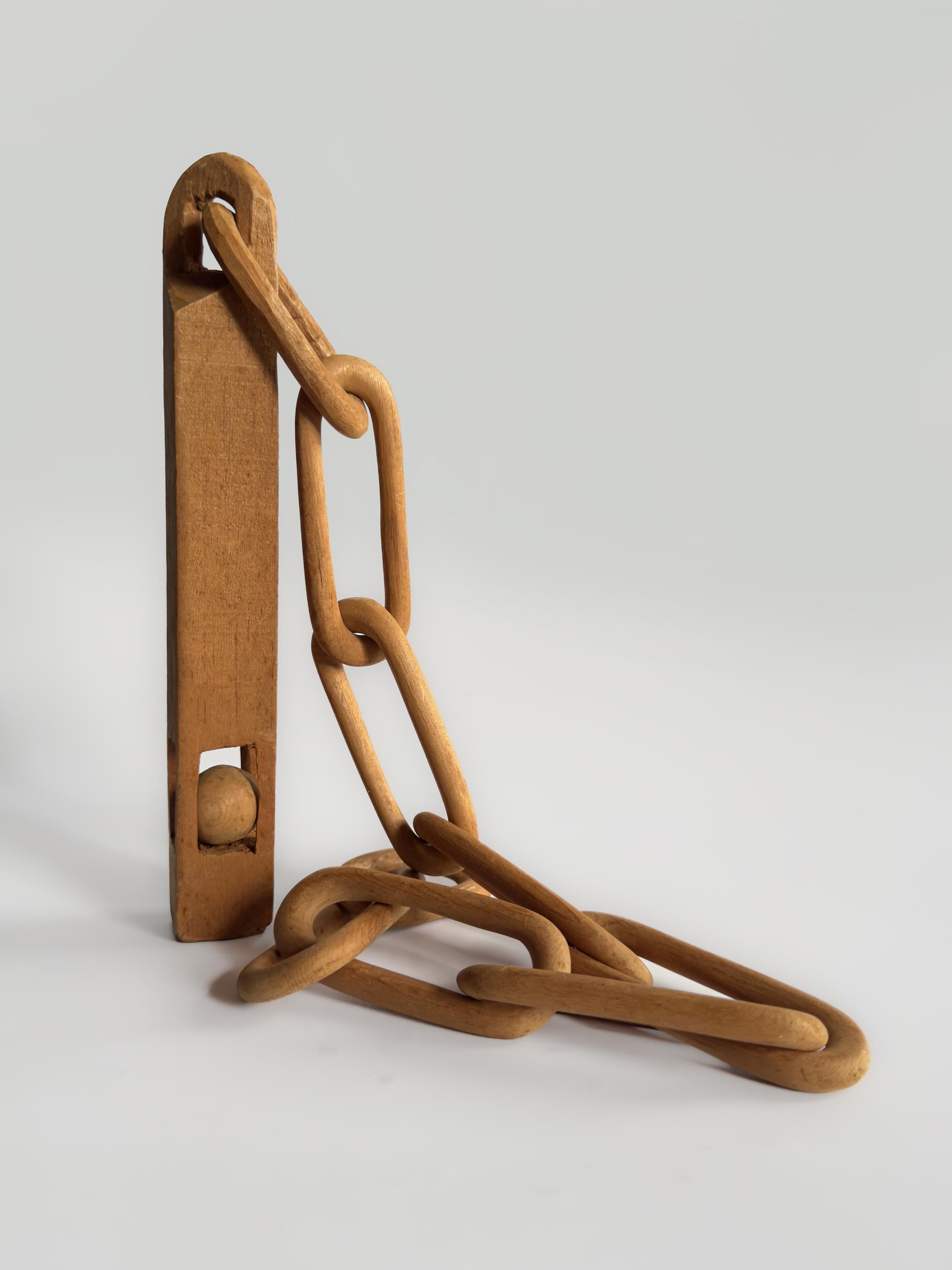 Great example of a folk art whimsy chain with a carved baton with a ball in cage. Measures 11.5 inches by 1 inch. Baton measures 9.5 x 1 inches. Chain measures 24 x 1.5 inches