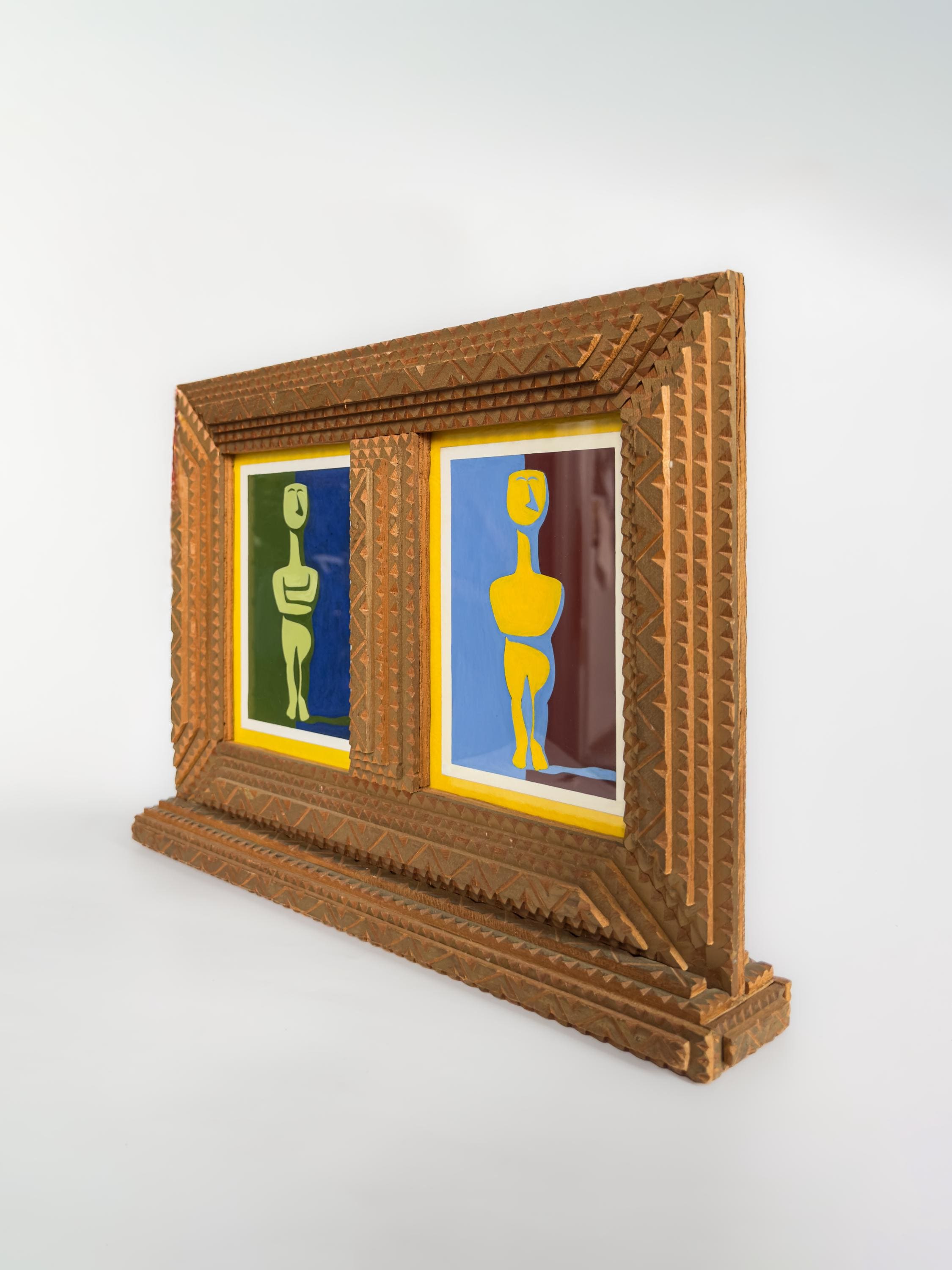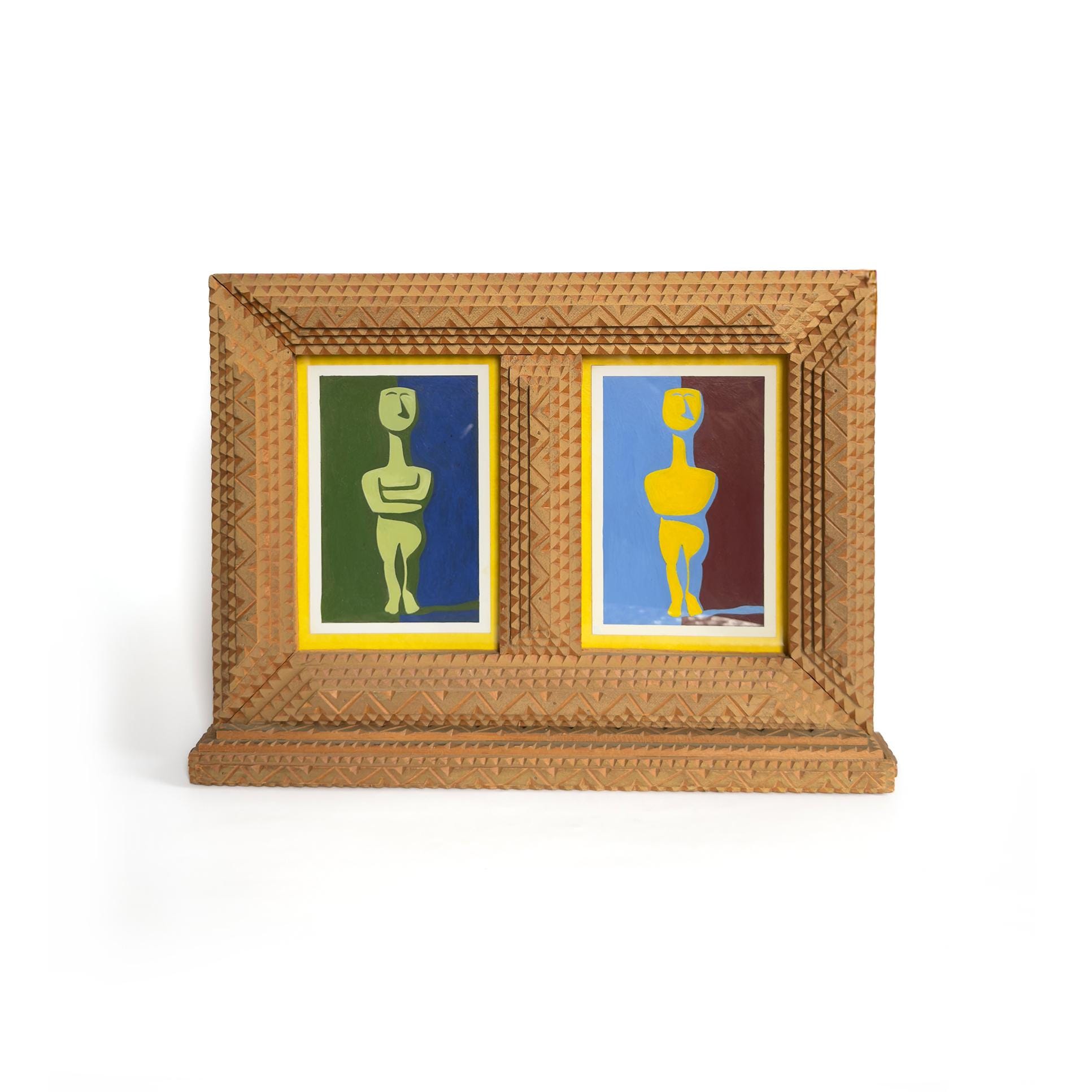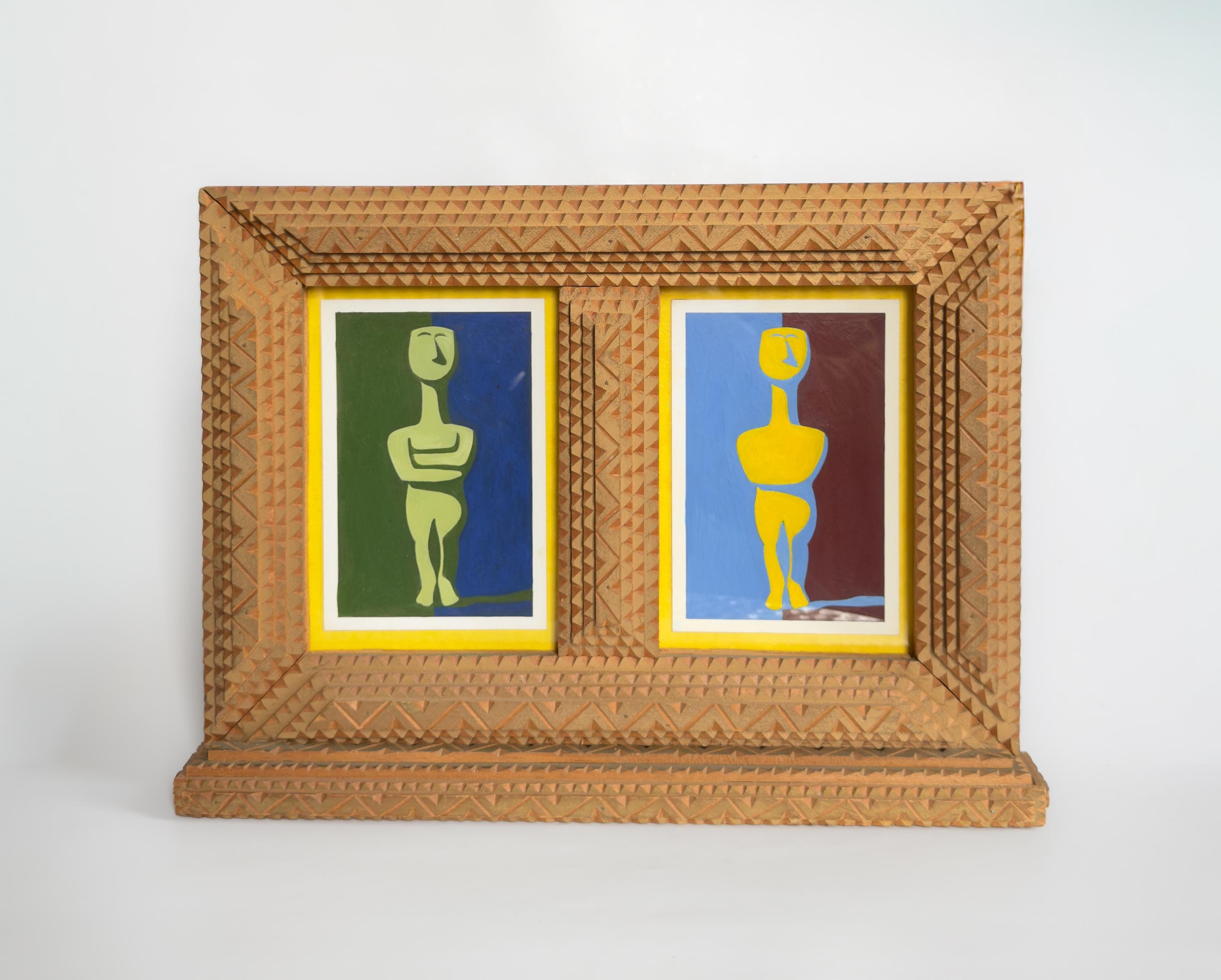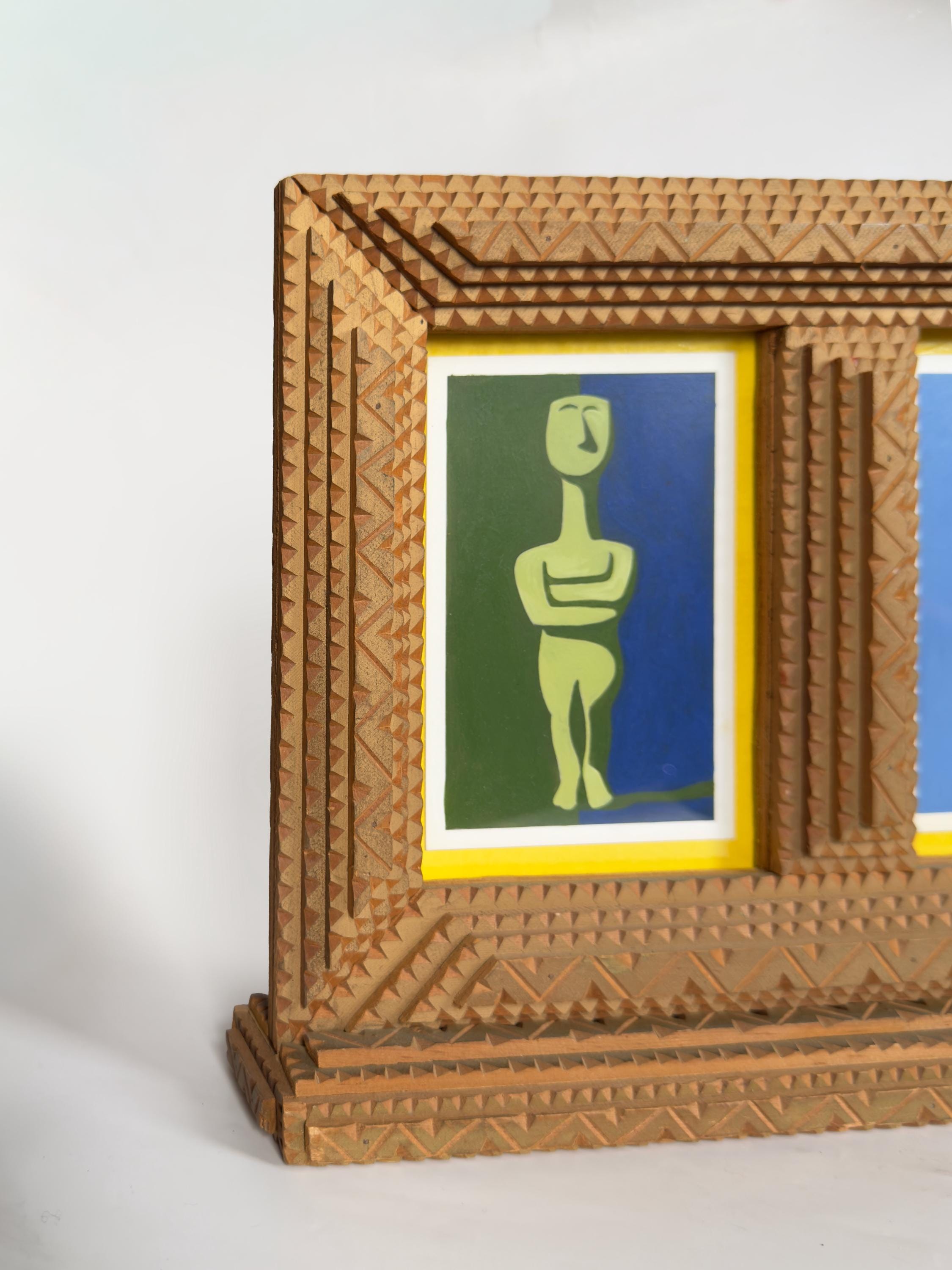 A standing two-opening tramp art picture frame on a carved, stepped base, fully constructed with layered and notched wood throughout. The frame holds two original acrylic paintings of Cycladic-style figures dating to around 1970, though the openings can easily accommodate substitute photographs or artwork.