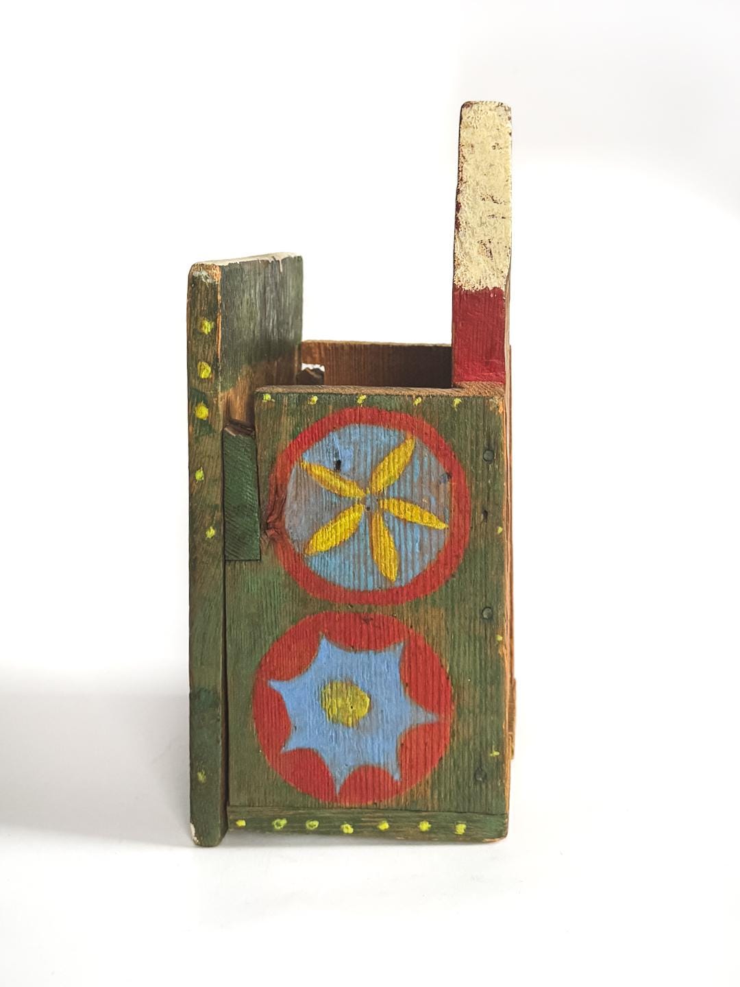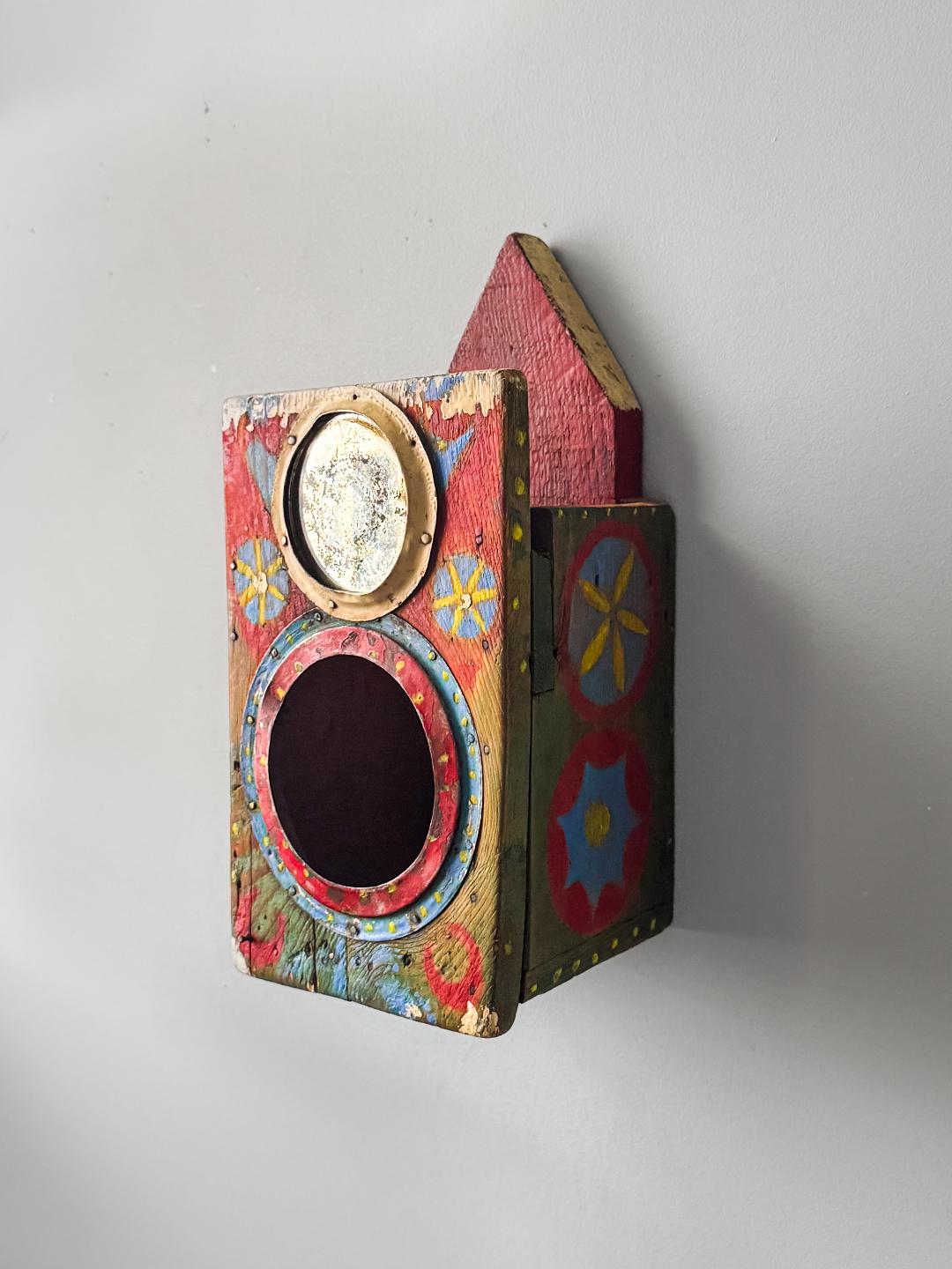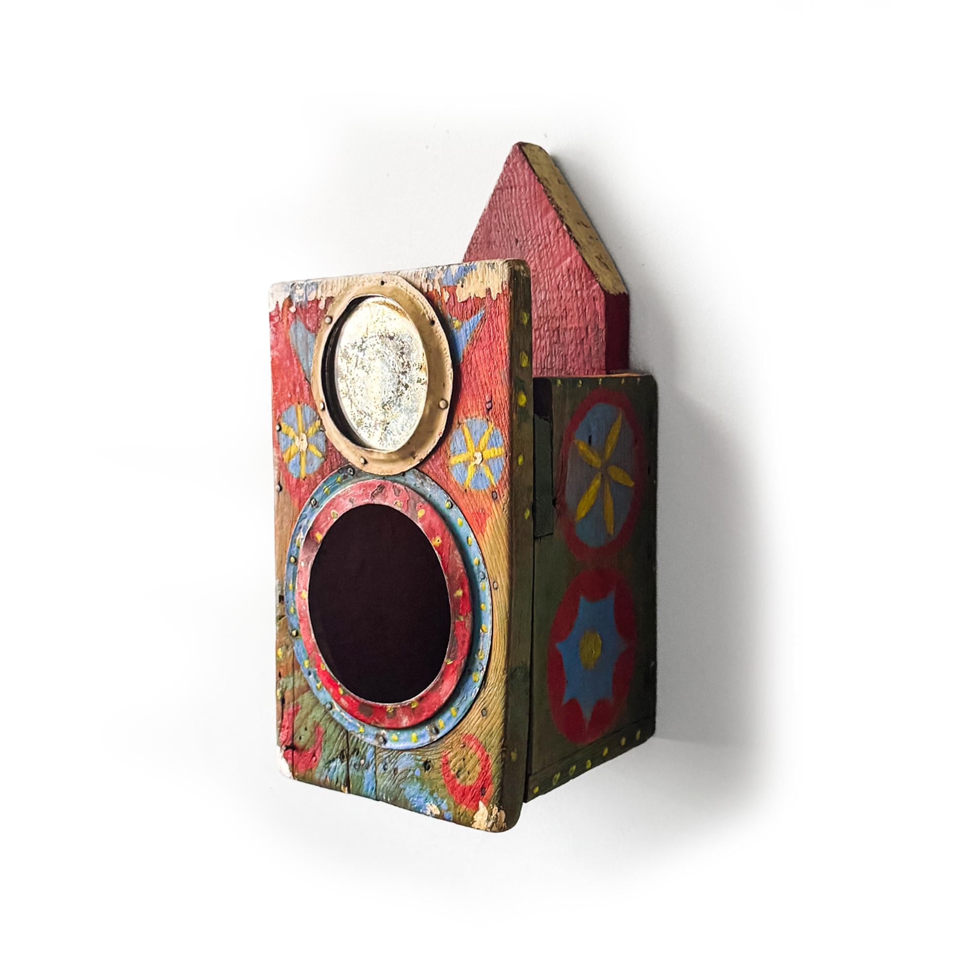 A vibrant handmade folk art box, rustic in construction and exuberant in color. Cobble together from off-cut scrap wood and found materials, the form balances utility and ornament, functioning equally well as a tabletop object or wall-hung piece. Each side is hand-painted with bold pinwheel and flower motifs in bright red, blue, green, and yellow, creating a rhythmic, almost talismanic surface. A small mirror element adds a playful, reflective accent, reinforcing the object’s intuitive, vernacular character.