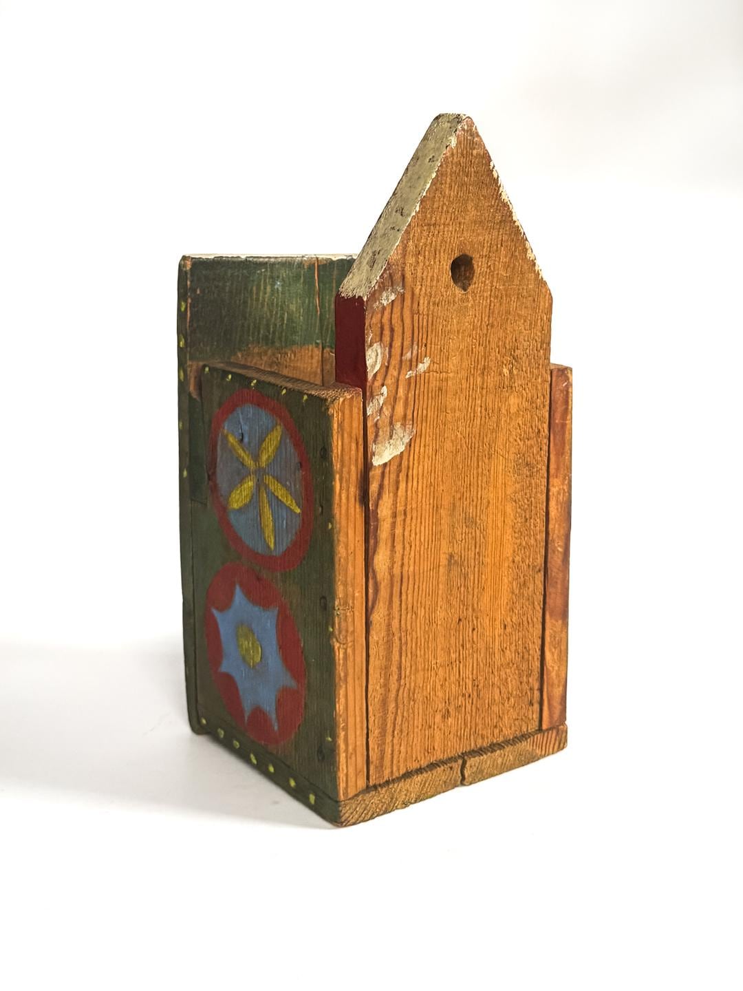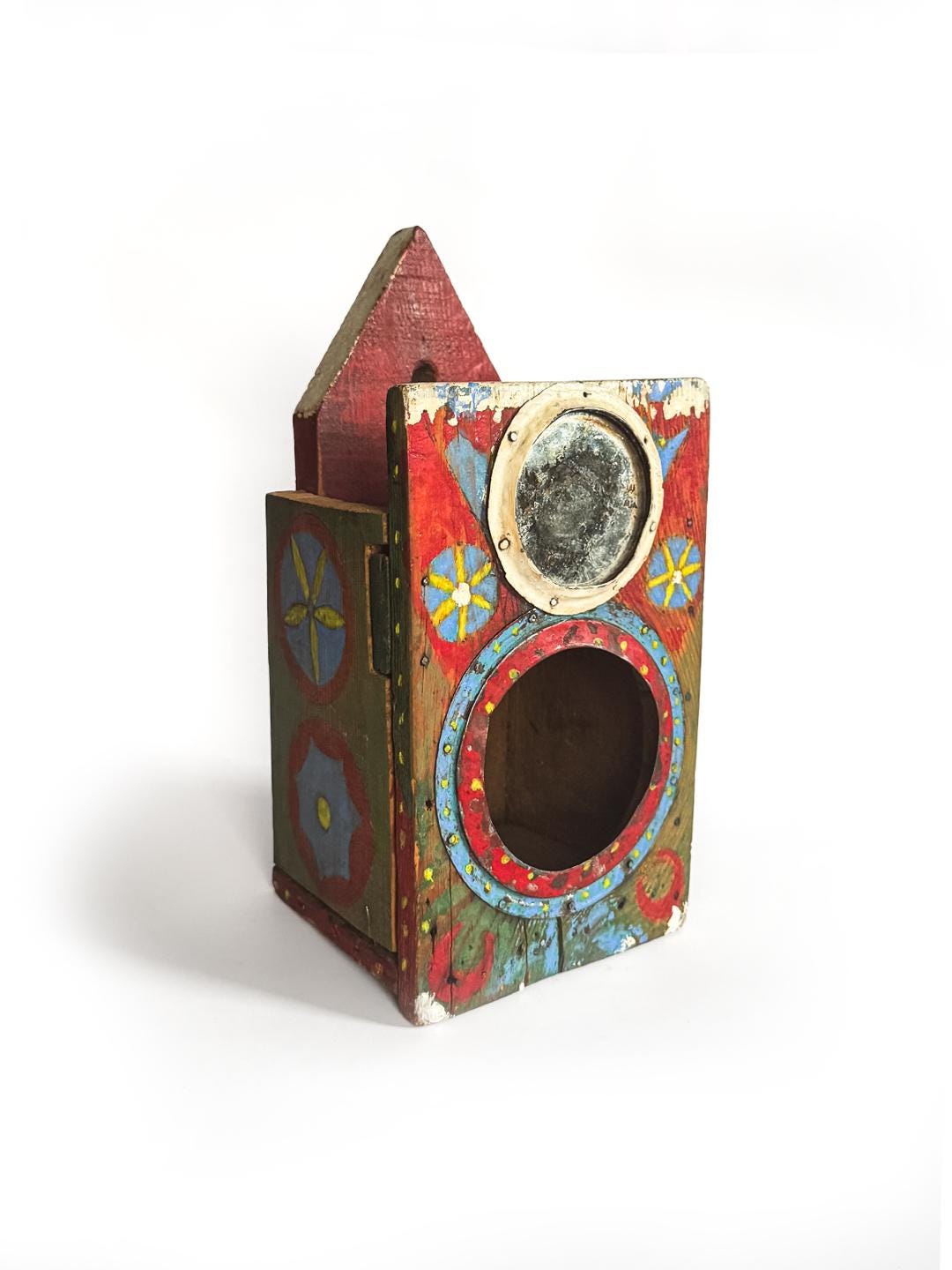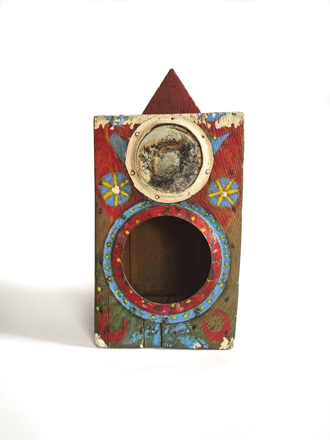 A vibrant handmade folk art box, rustic in construction and exuberant in color. Cobble together from off-cut scrap wood and found materials, the form balances utility and ornament, functioning equally well as a tabletop object or wall-hung piece. Each side is hand-painted with bold pinwheel and flower motifs in bright red, blue, green, and yellow, creating a rhythmic, almost talismanic surface. A small mirror element adds a playful, reflective accent, reinforcing the object’s intuitive, vernacular character.