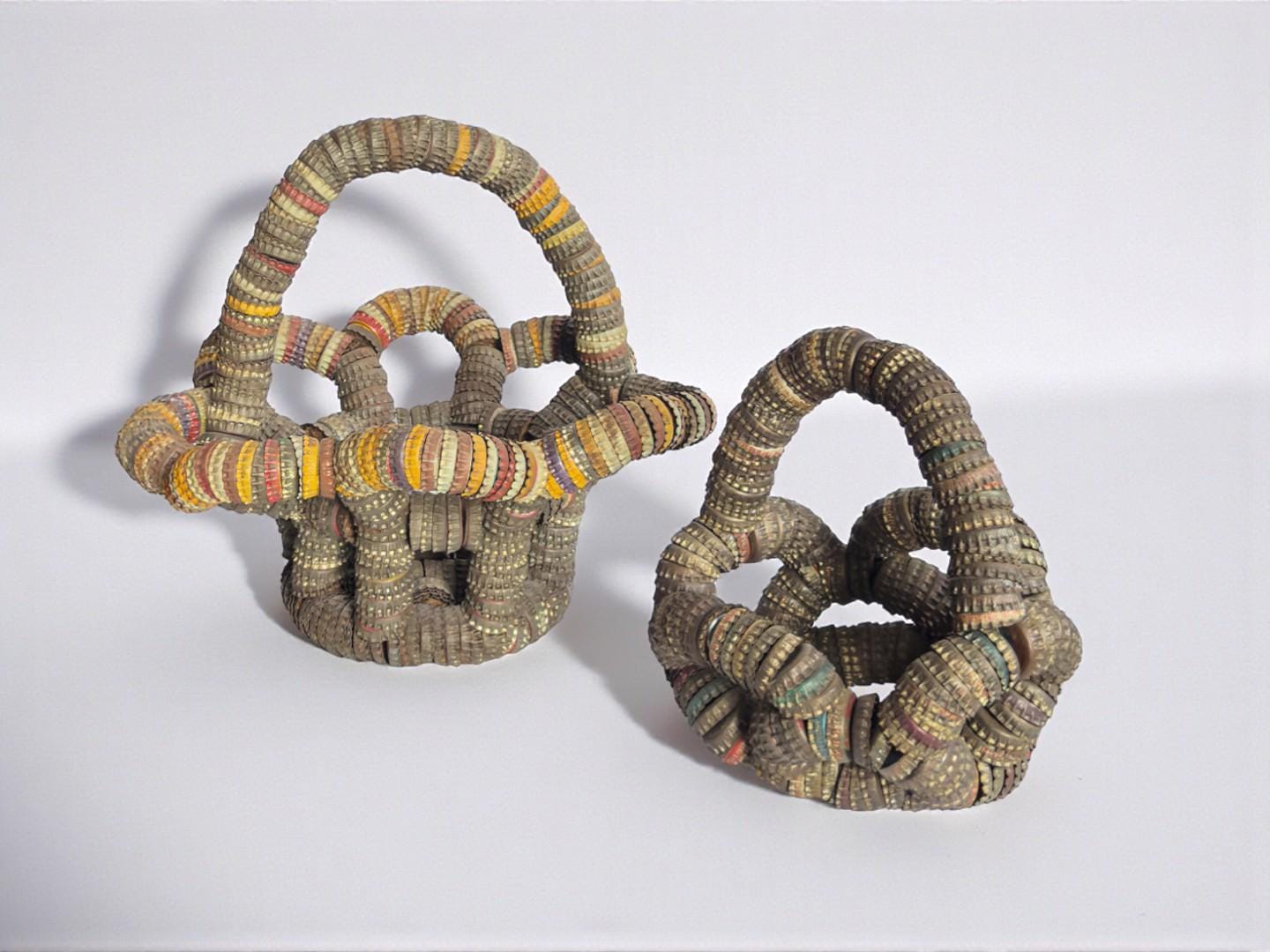 These rustic objects sit at the intersection of vernacular ingenuity and decorative craft. Bottlecap baskets reflect a resourceful tradition of transforming everyday refuse into durable, ornamental forms. The surface carries a distinctly tramp art–like patina, with softened edges, oxidation, and tonal variation that speak to decades of handling and display.