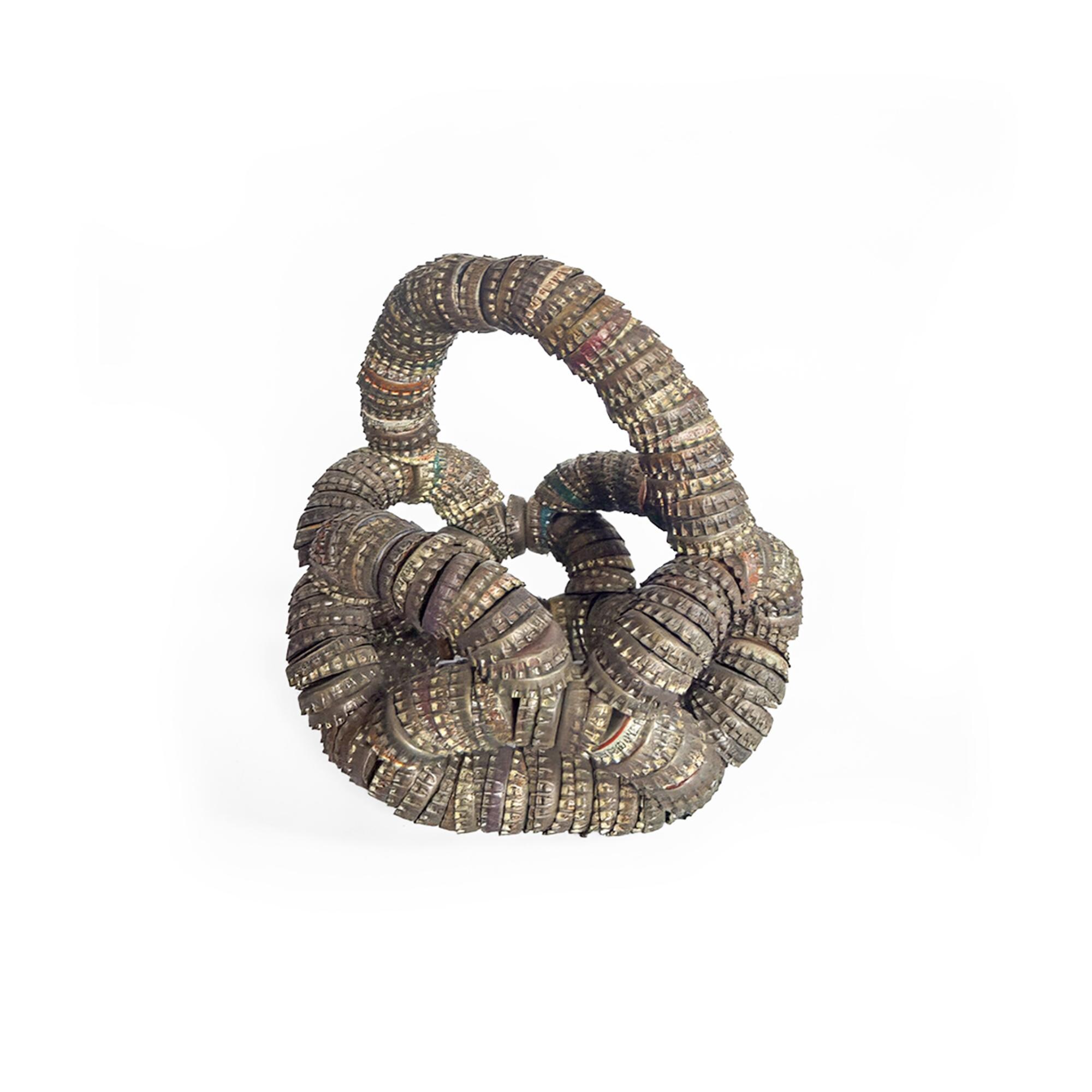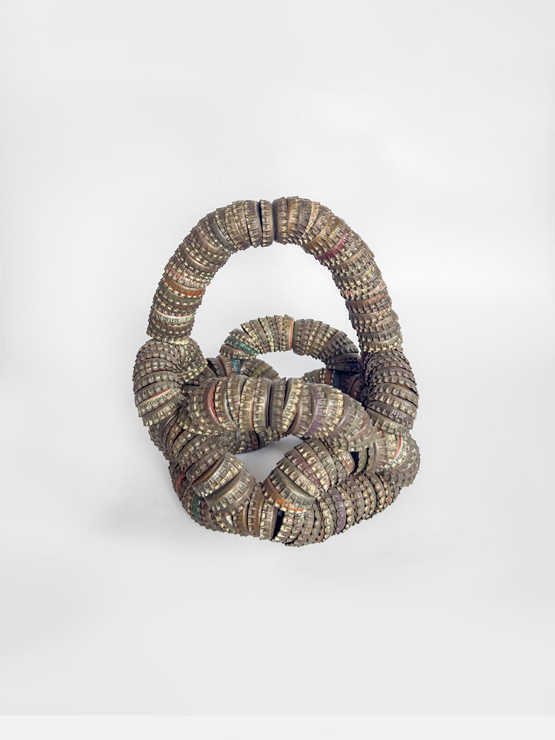Antique American folk art bottlecap basket, circa 1930s–1950s, constructed from thousands of soda and beer bottle caps meticulously linked together with thin wire. Measuring 8 x 6 x6 inches, the basket forms a dense, sculptural volume animated by an intricate floral pattern and a naturally aged patina.