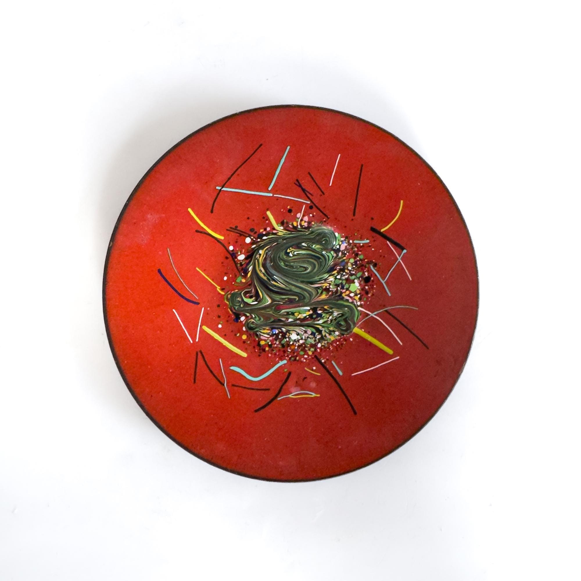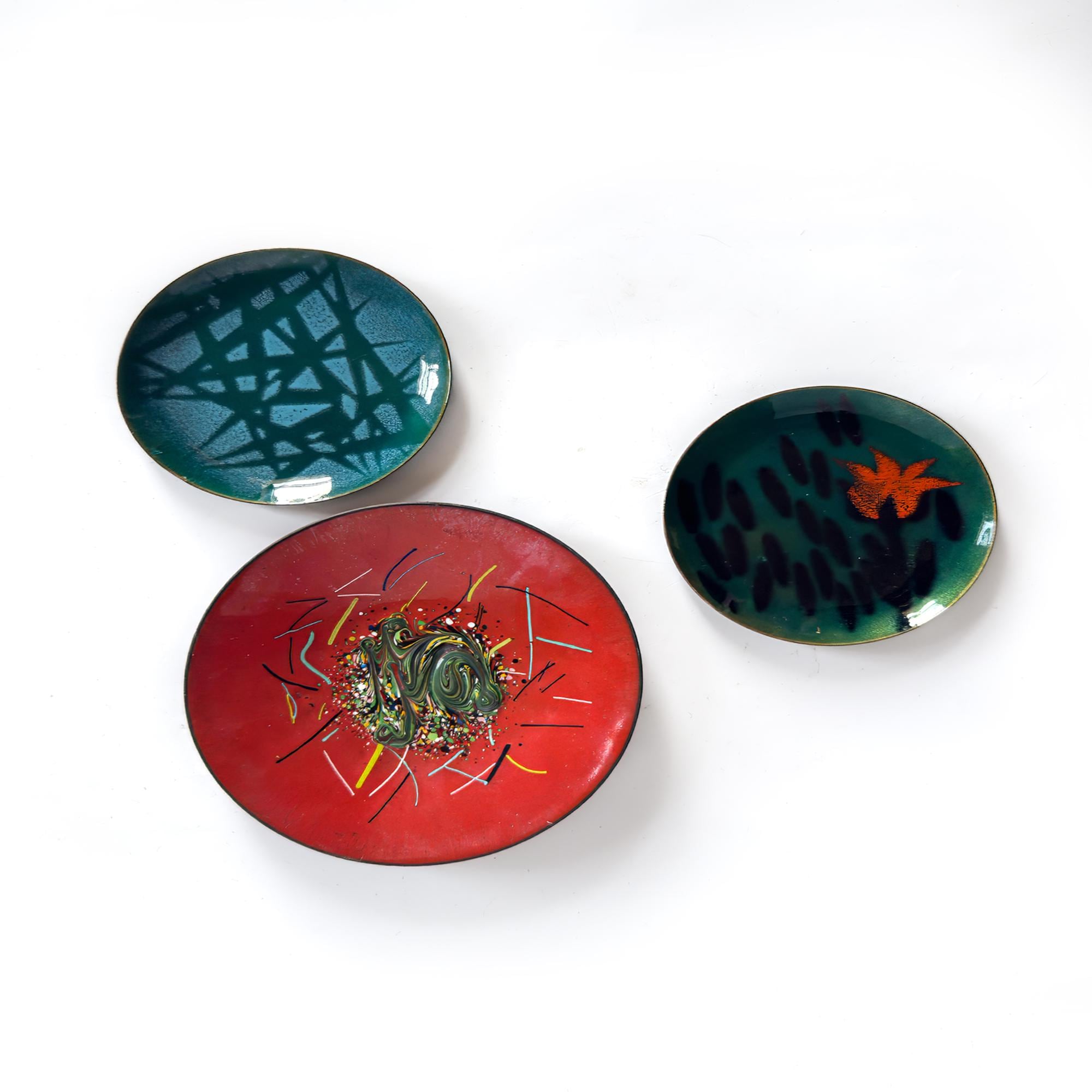 Handcrafted mid-century enamel dishes produced by Bovano of Cheshire, Connecticut, a studio known for its richly colored enamel-on-copper decorative objects. Each dish features a distinct composition combining Abstract Expressionist gesture with Modernist form, balancing painterly movement against controlled geometry.