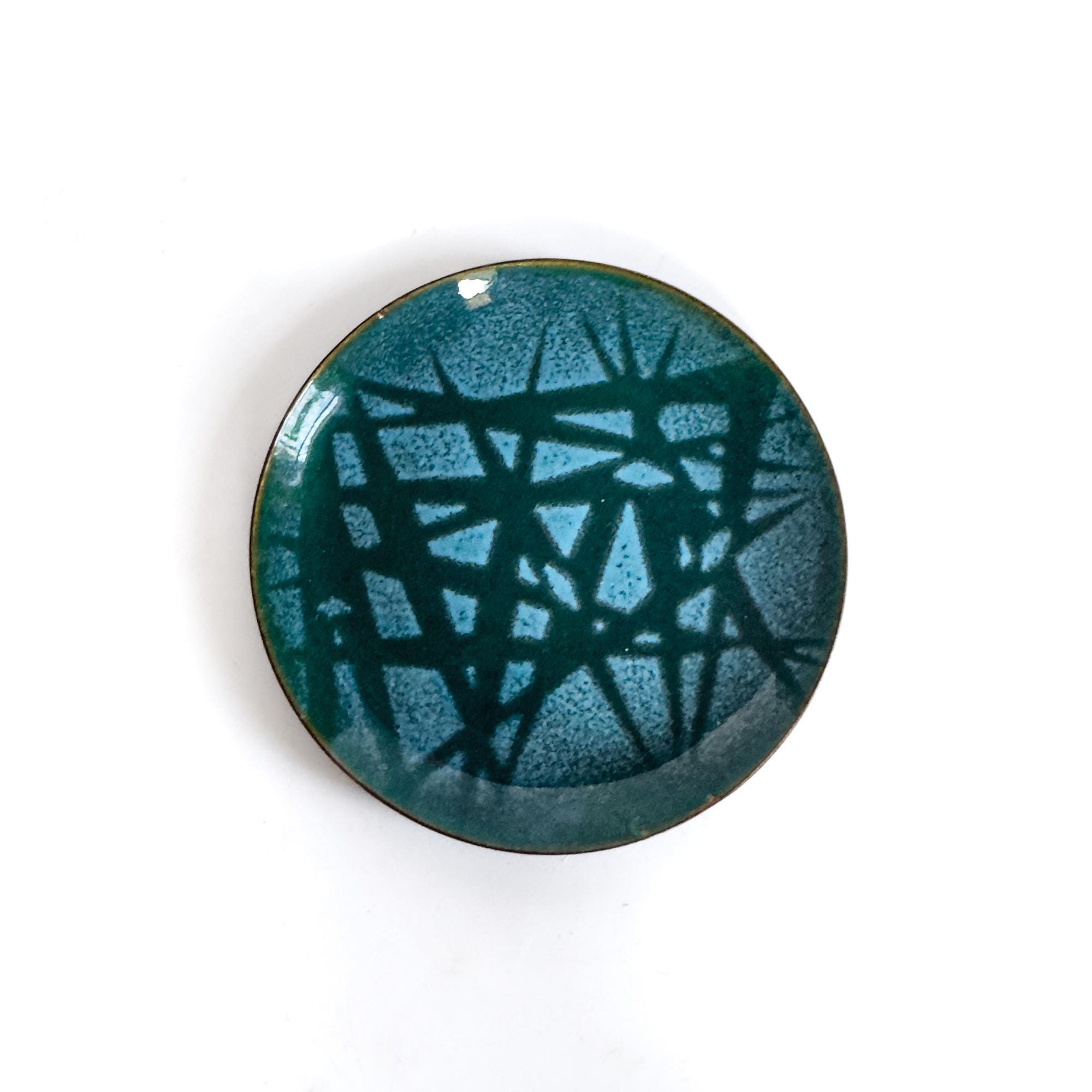 Bold yet restrained color palettes—saturated blues, greens, and a striking red—are fused into copper through traditional vitreous enameling, creating luminous, glass-like surfaces with subtle variation and depth. The designs read as intimate, functional abstractions: part small-scale sculpture, part decorative object.