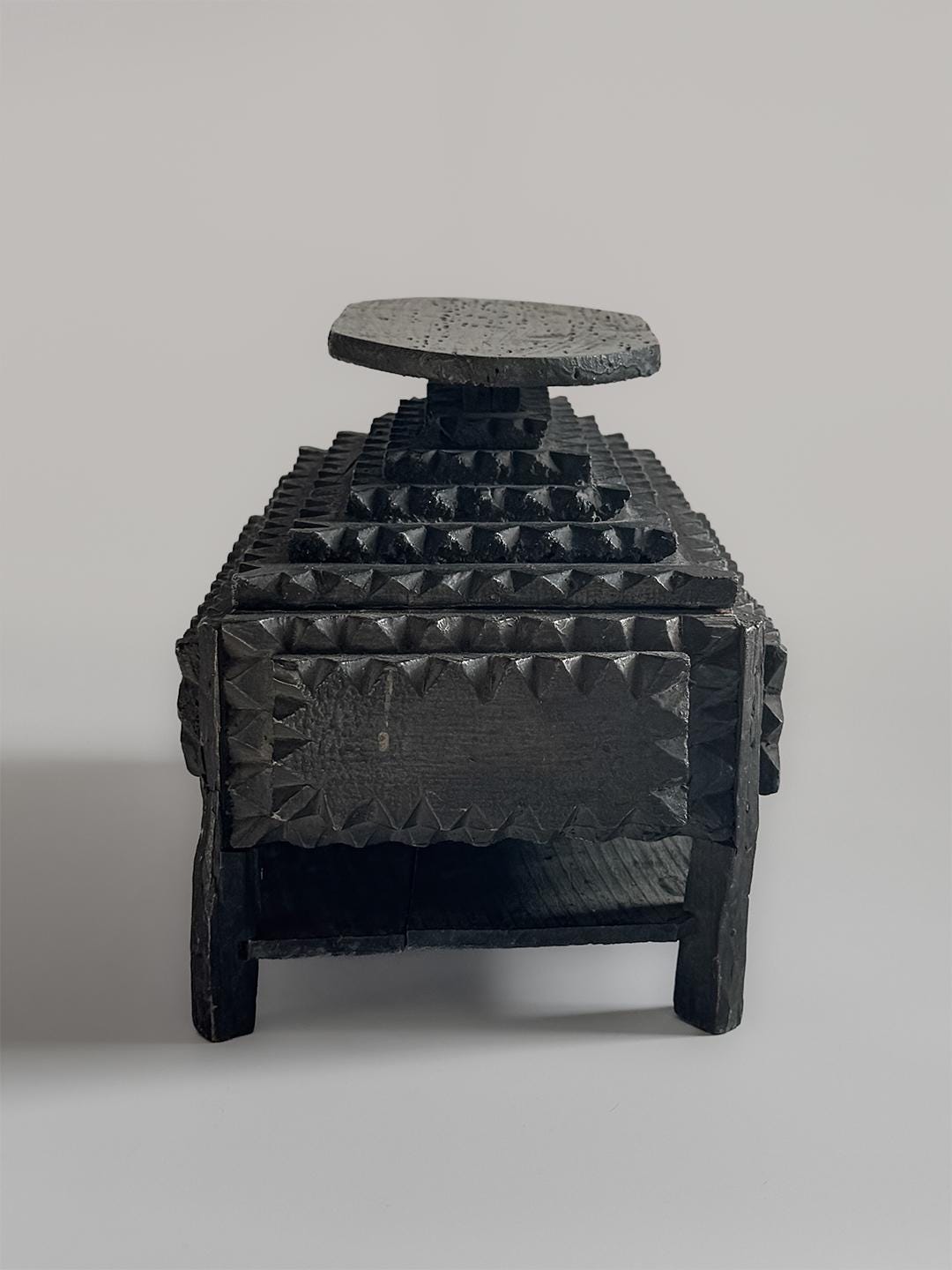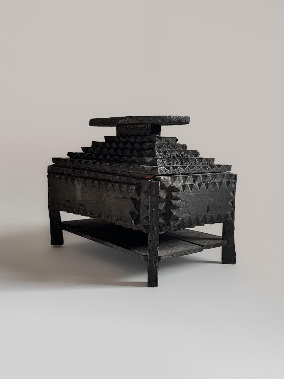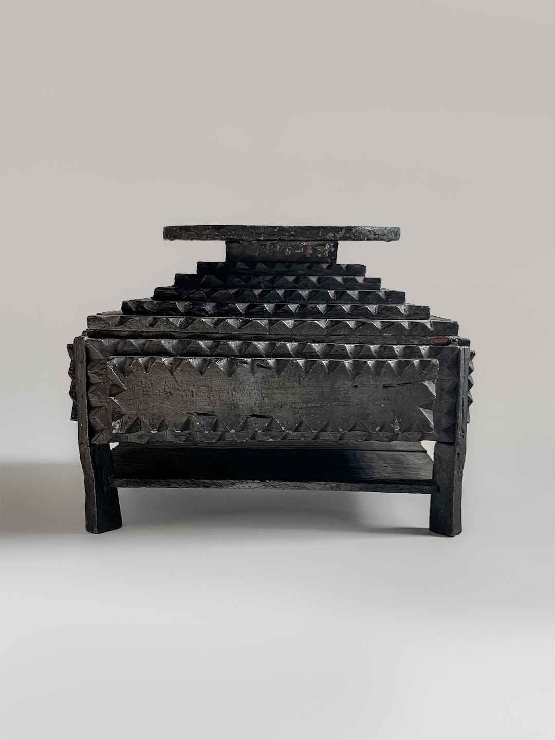 Vintage tramp art box featuring wide-tooth chip carving, raised on four legs with a lower shelf, and surmounted by a fitted top. The lid is centered with an oval medallion, adding a focal point to an otherwise stark, architectural form. Measuring 10 × 7 × 8 inches, the box is finished in a deep black painted surface that emphasizes shadow, relief, and the irregularity of the hand-cut construction.