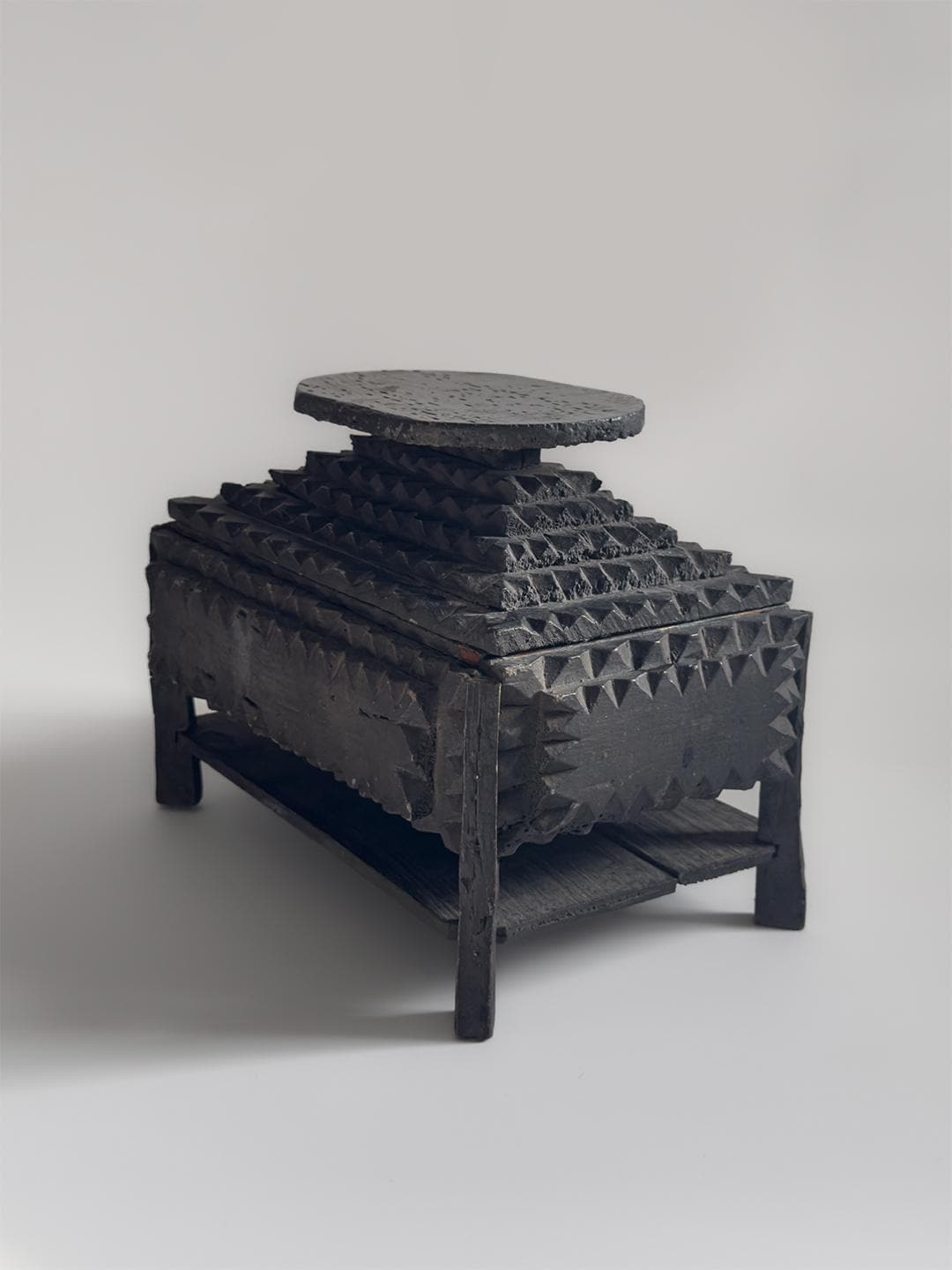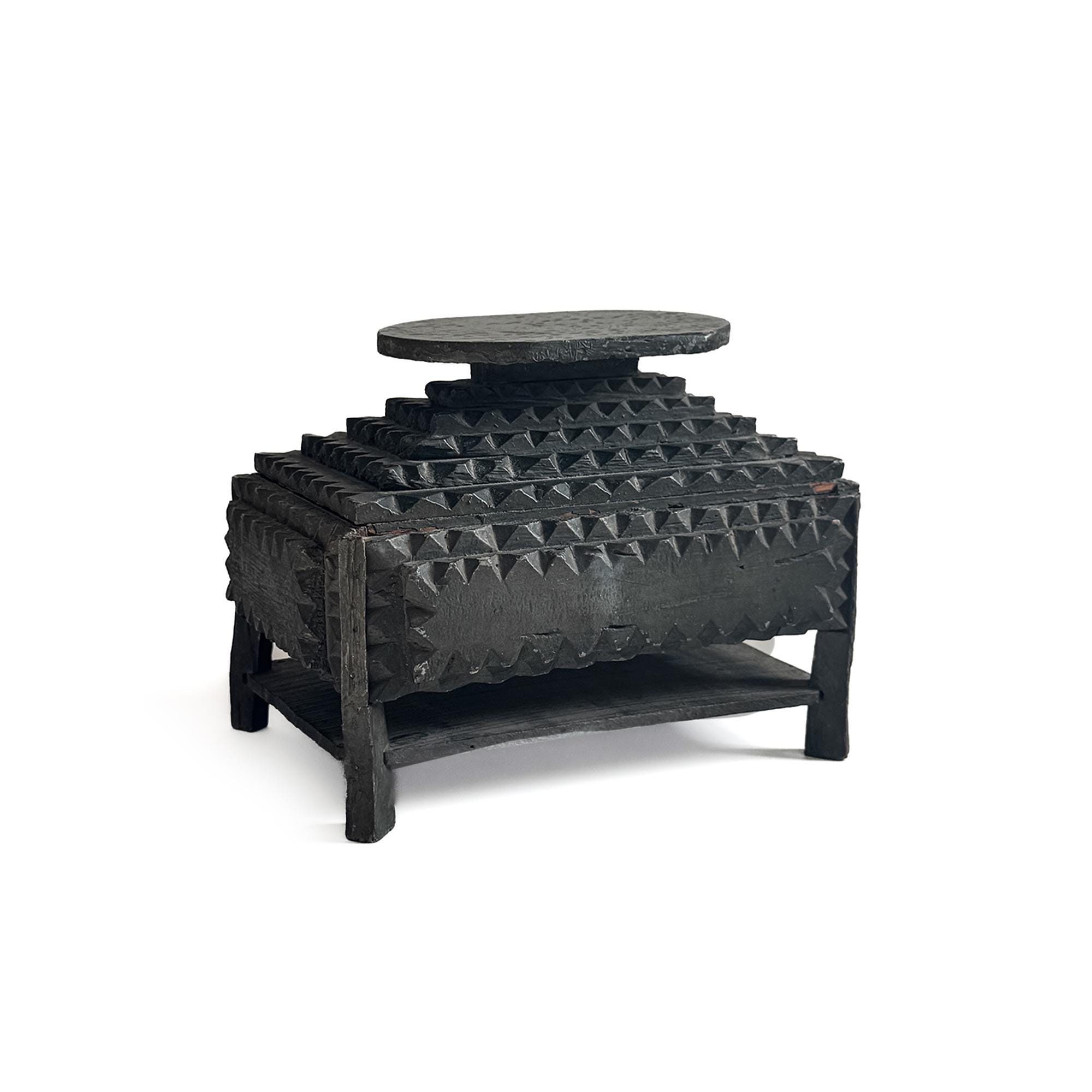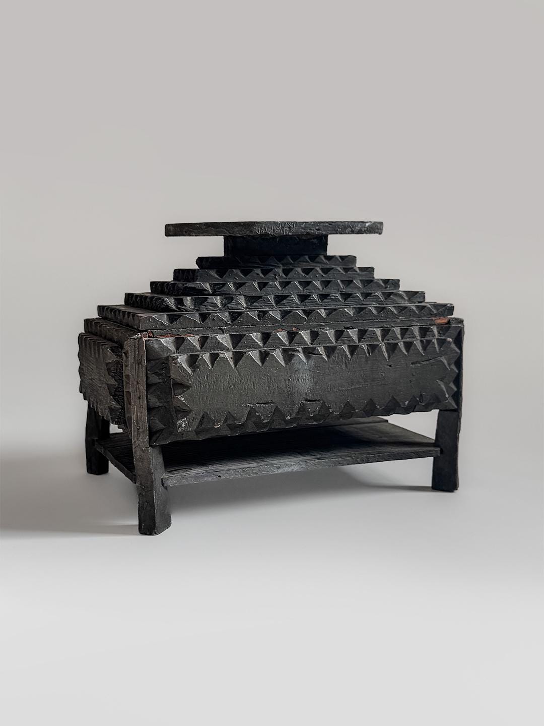 Vintage tramp art box featuring wide-tooth chip carving, raised on four legs with a lower shelf, and surmounted by a fitted top. The lid is centered with an oval medallion, adding a focal point to an otherwise stark, architectural form. Measuring 10 × 7 × 8 inches, the box is finished in a deep black painted surface that emphasizes shadow, relief, and the irregularity of the hand-cut construction.