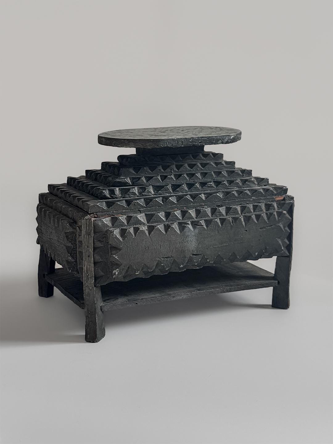 The design is notably idiosyncratic and crude in construction, underscoring the raw, self-directed nature of tramp art making. The bold monochrome finish and heavy carving give the piece a sculptural presence, blurring the line between functional object and folk expression.