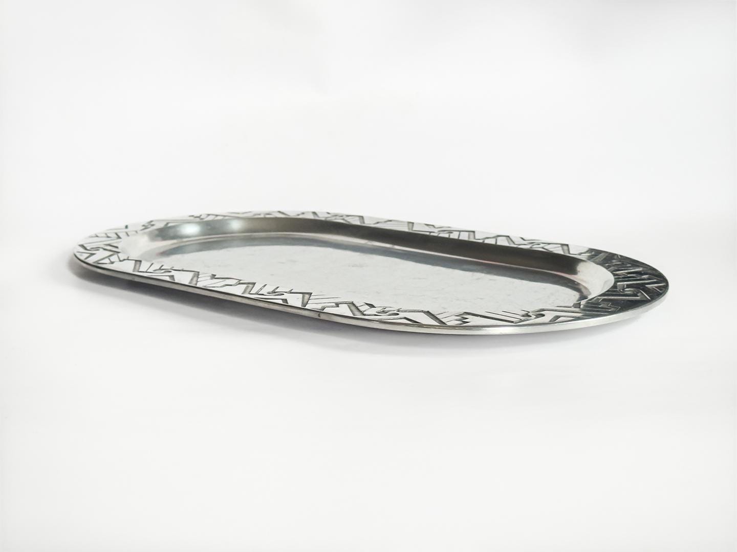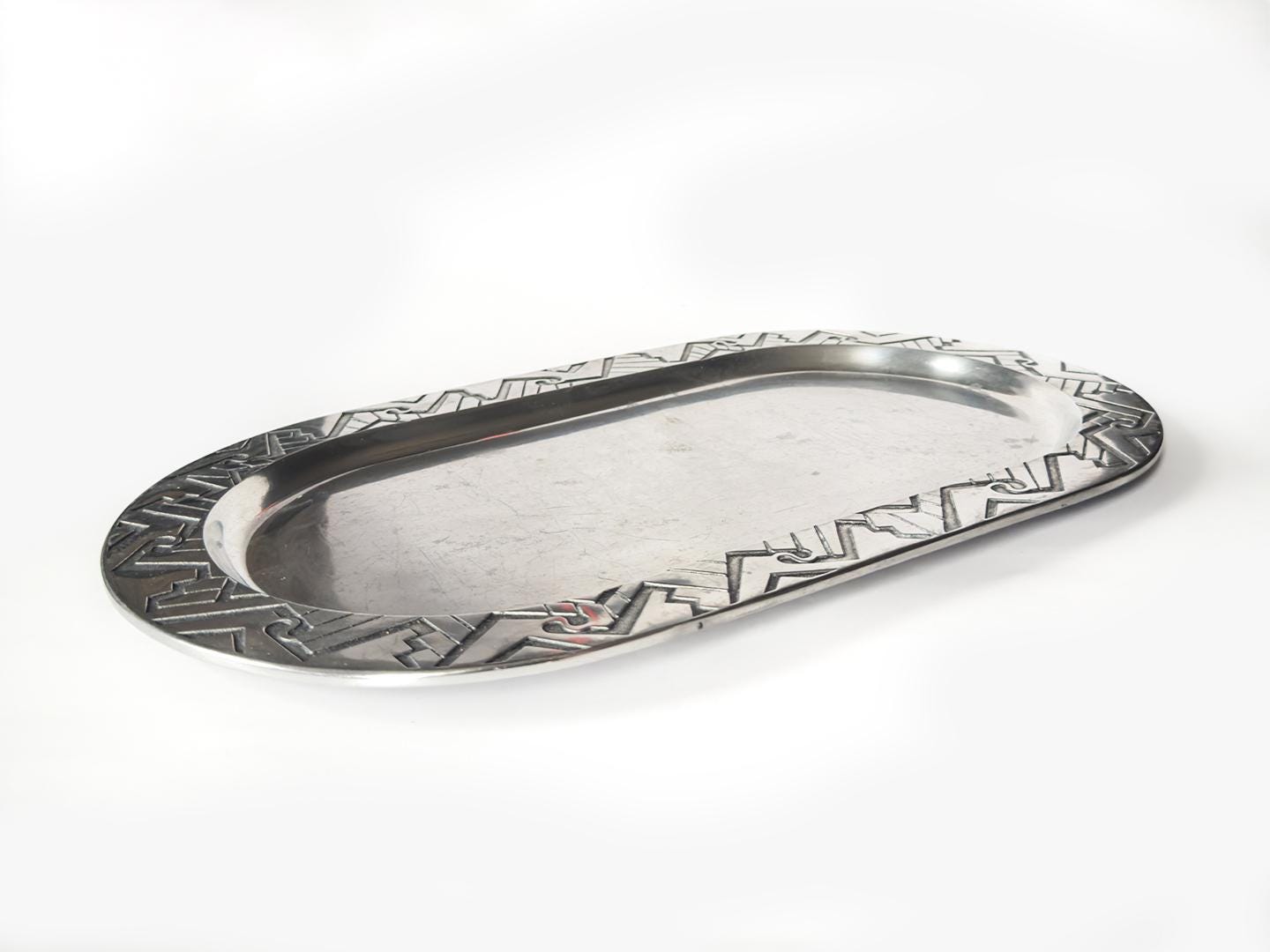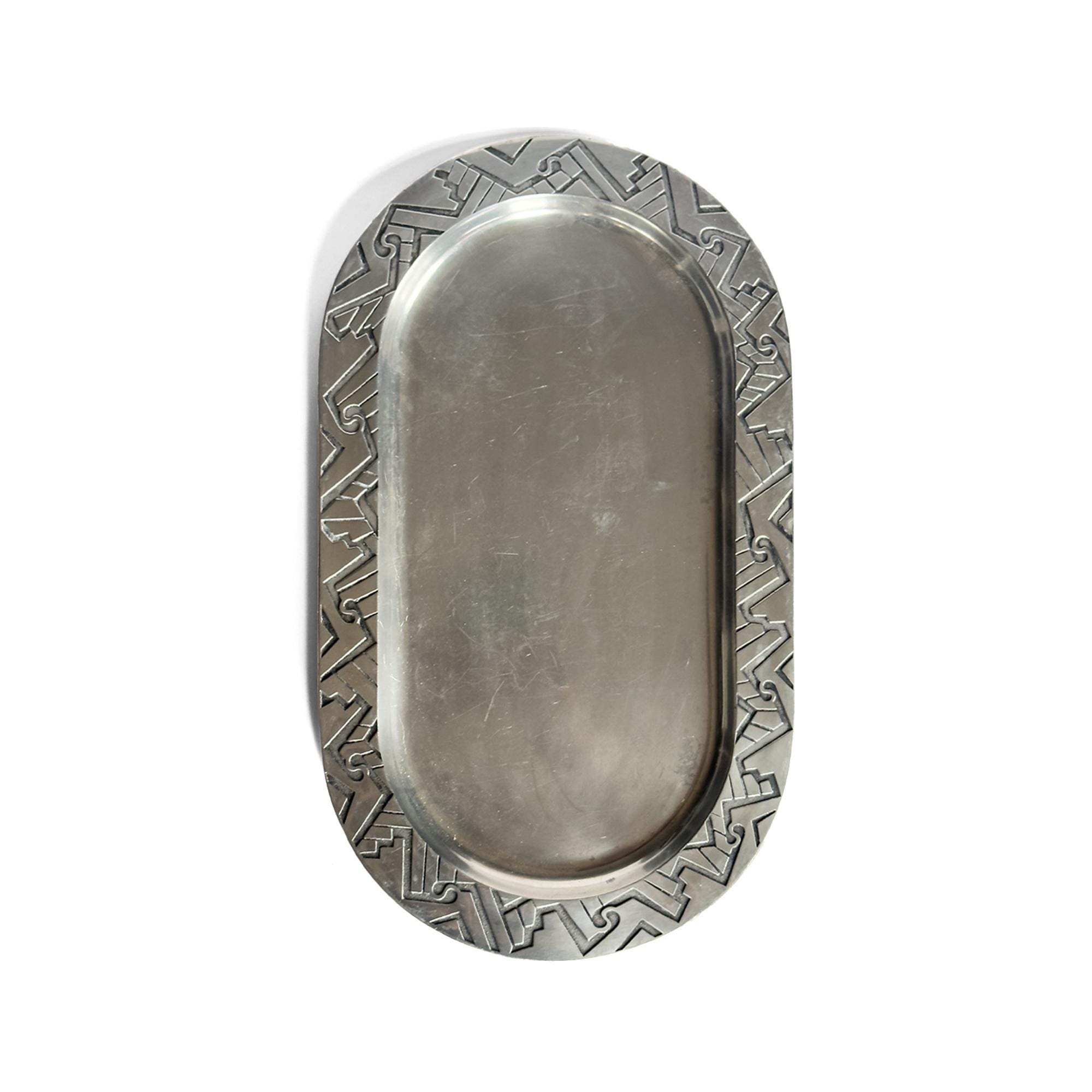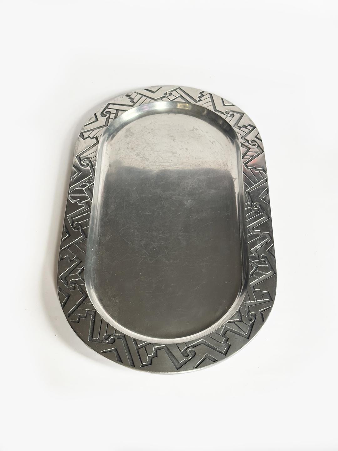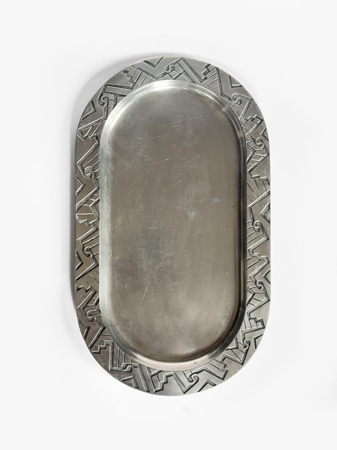 Known for its durable, sculptural alloy, Wilton Armetale pieces balance function and ornament, making them equally suited for serving or display. The weight and matte metallic finish give the tray a substantial presence, while the graphic pattern situates it firmly within a postmodern revival of historic and global design references.