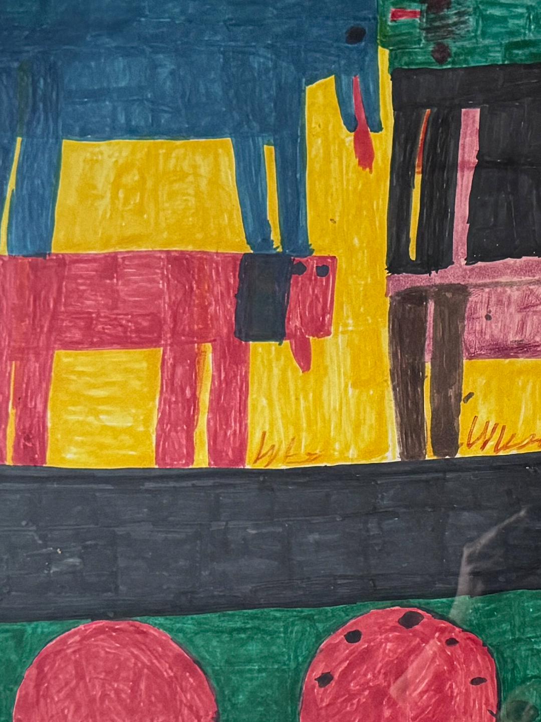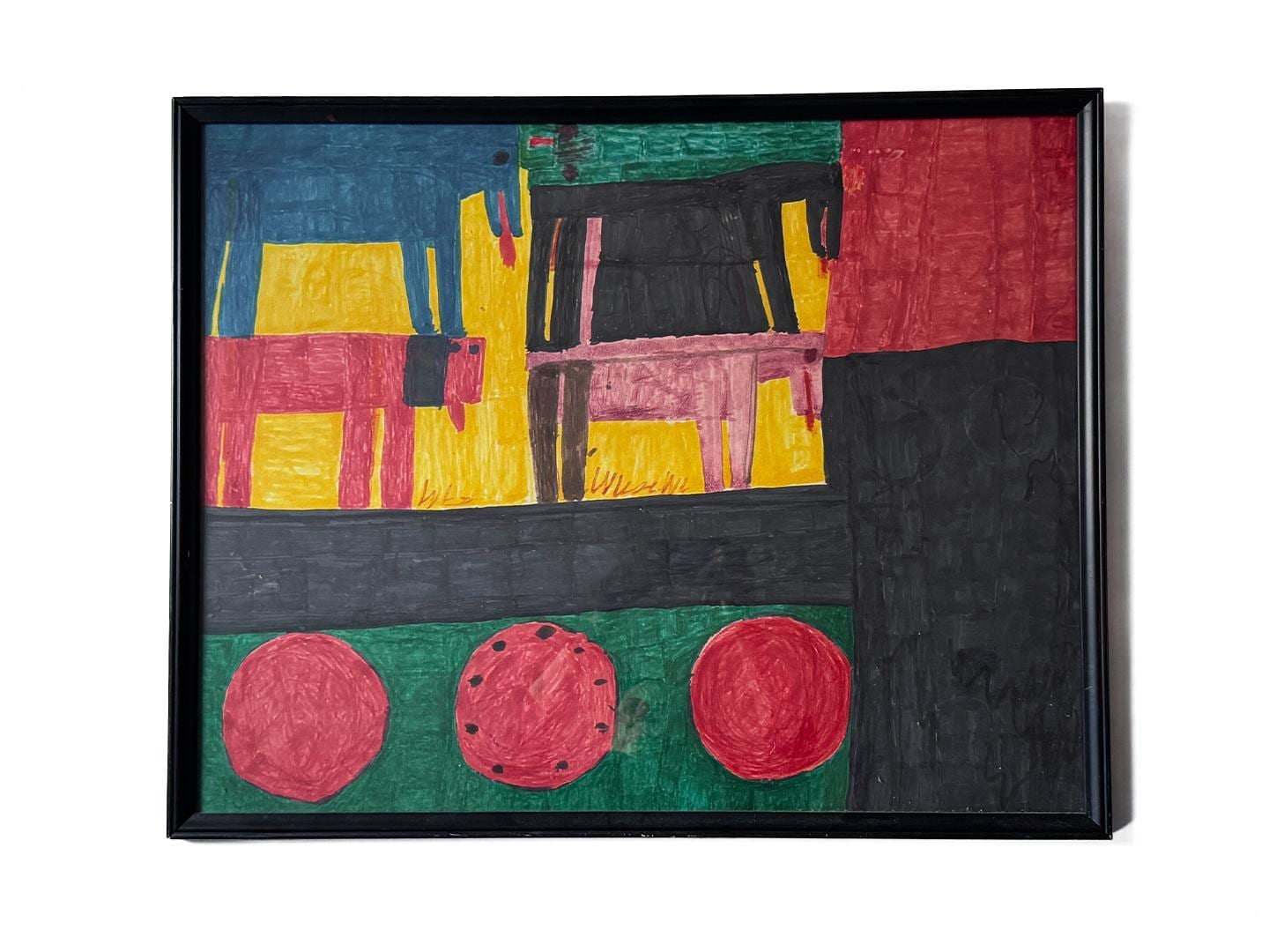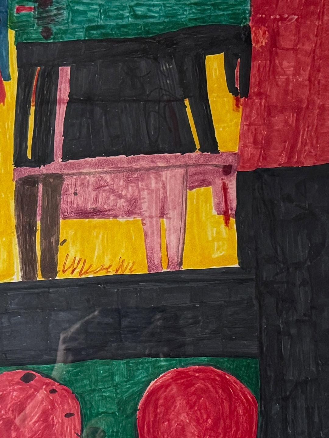 Inspired by the artists working in the French Quarter, White began painting, at first imitating their work until he developed his own language. Instantly recognizable, he is known for vibrant marker drawings on poster board. By eliminating any foreground or background he achieves a flattened picture plane with an all over design populated by a lexicon of imagery that includes dinosaurs, horses, birds, watermelons, skyscrapers, rocket ships, suns and planets.