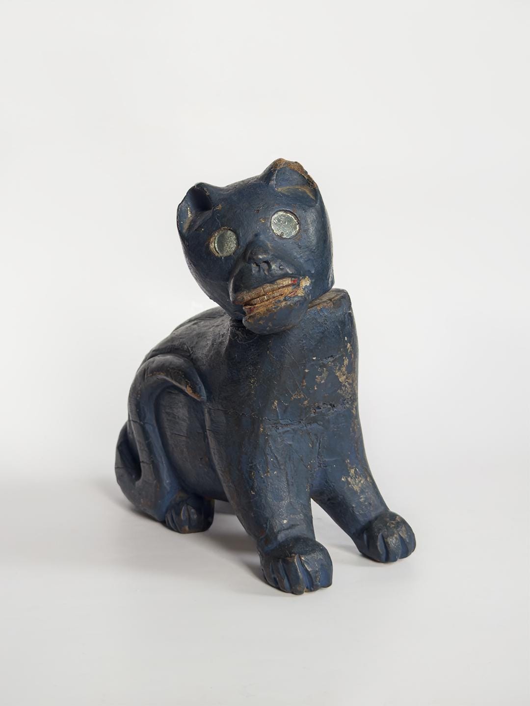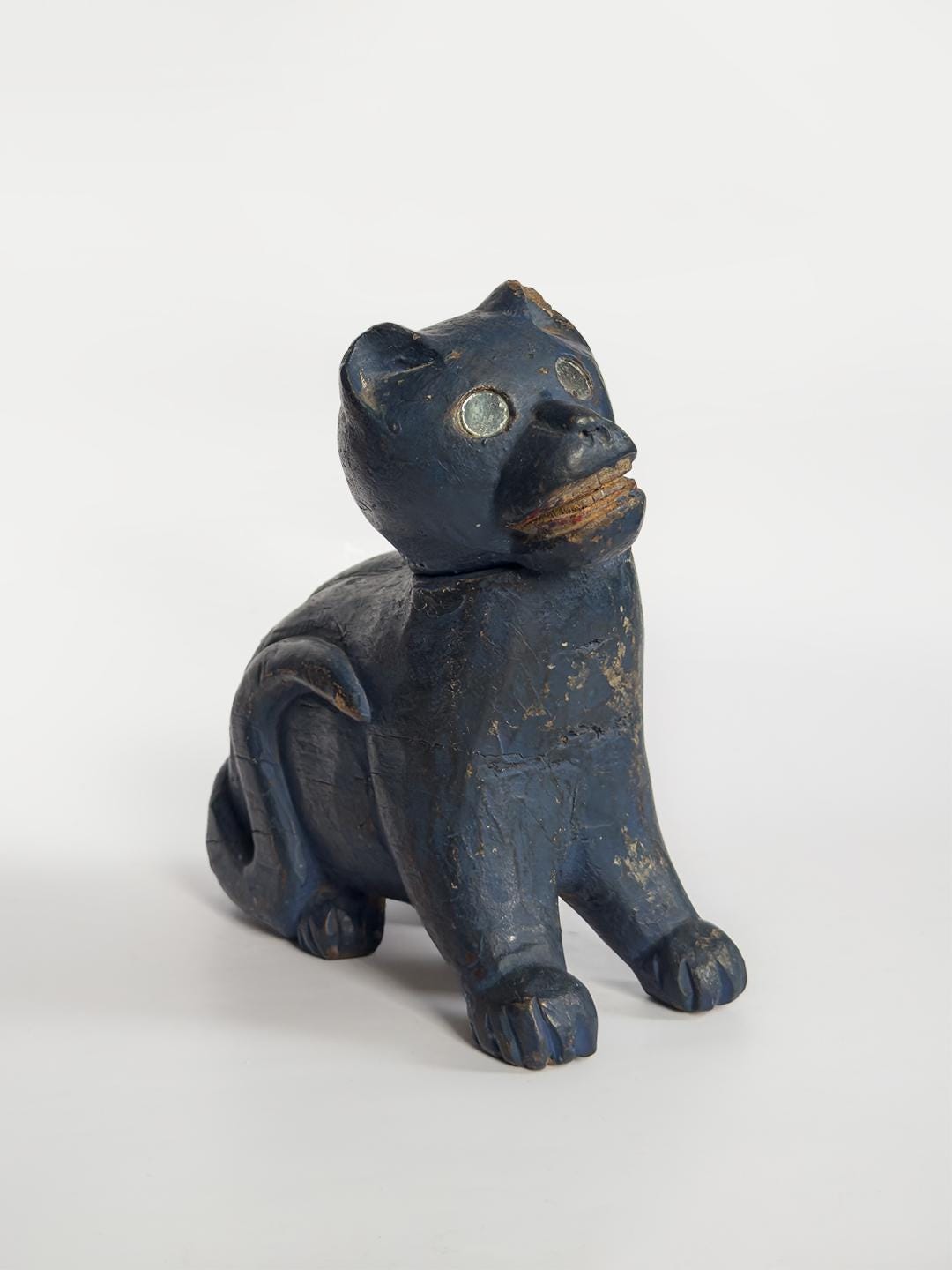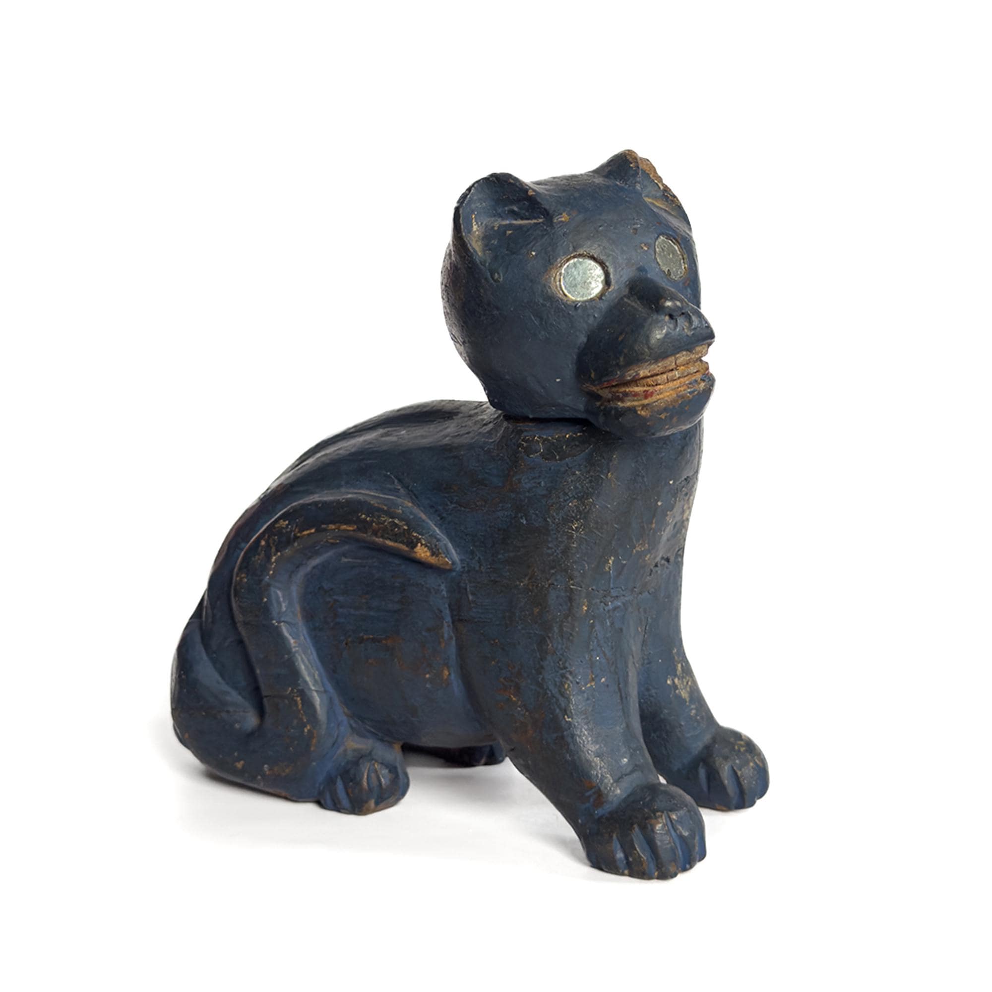 A charming hand-carved wooden cat sculpture painted in a vivid blue, with bright mirrored eyes and a swiveling articulated head that gives the piece an especially lively character. Folk art in spirit and full of personality, this compact sculptural object makes a playful accent on a shelf, tabletop, or cabinet.