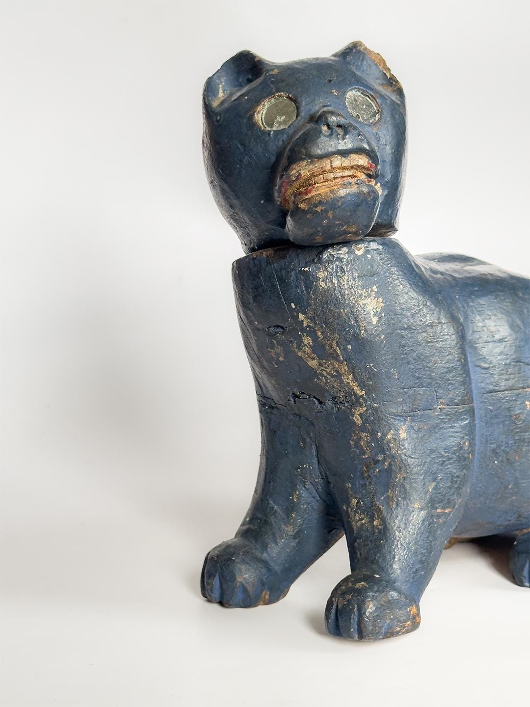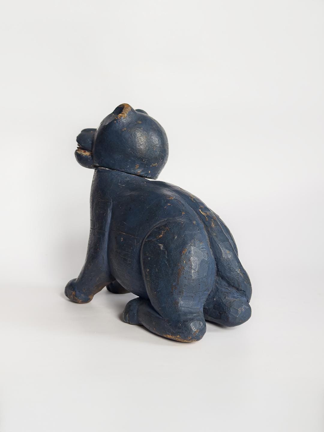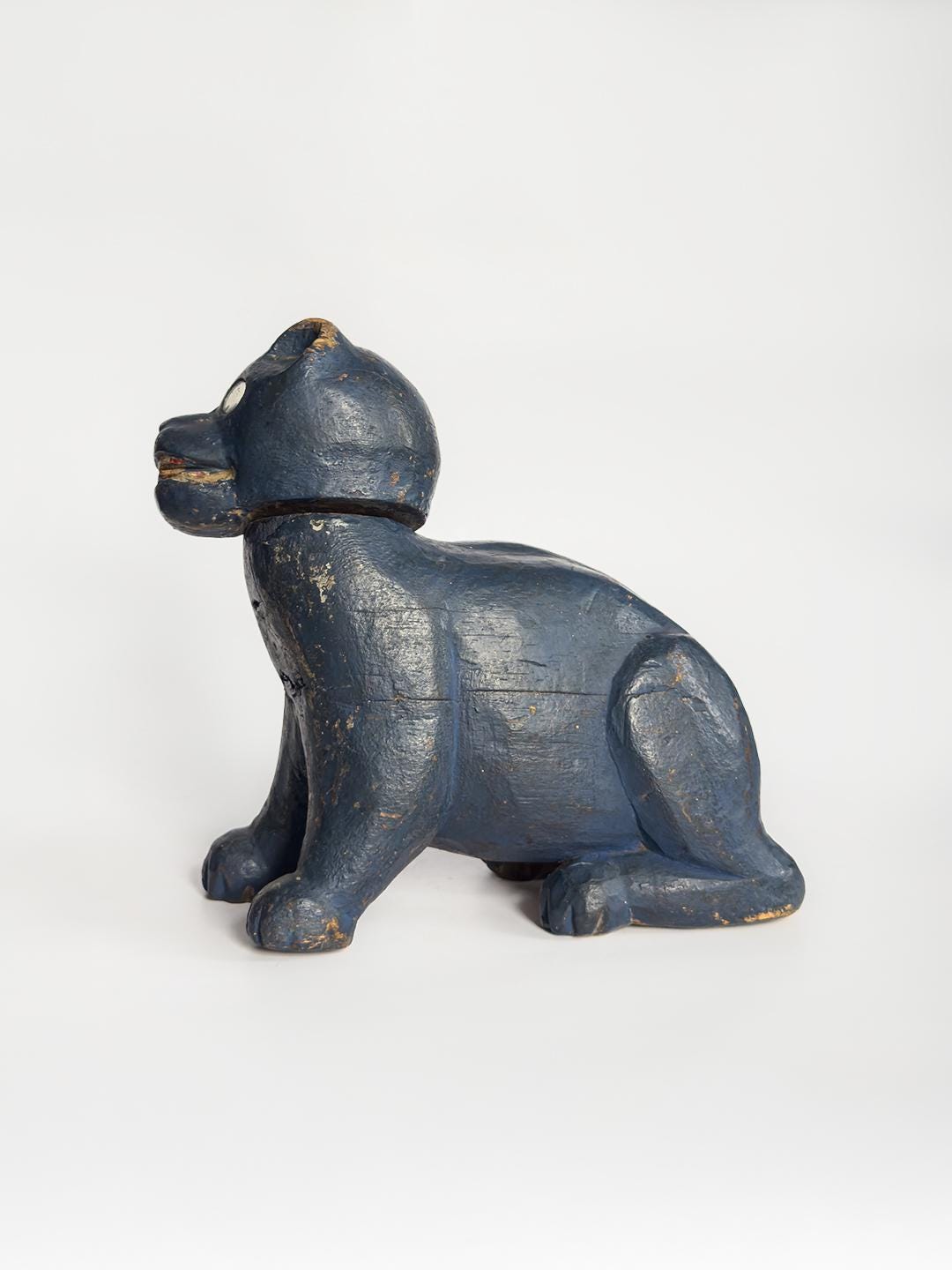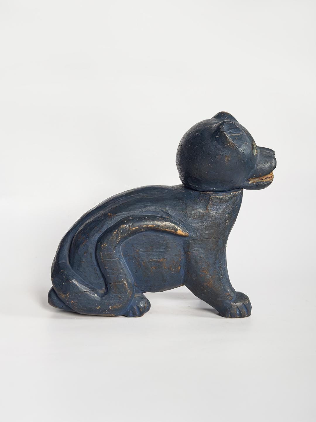 A charming hand-carved wooden cat sculpture painted in a vivid blue, with bright mirrored eyes and a swiveling articulated head that gives the piece an especially lively character. Folk art in spirit and full of personality, this compact sculptural object makes a playful accent on a shelf, tabletop, or cabinet.