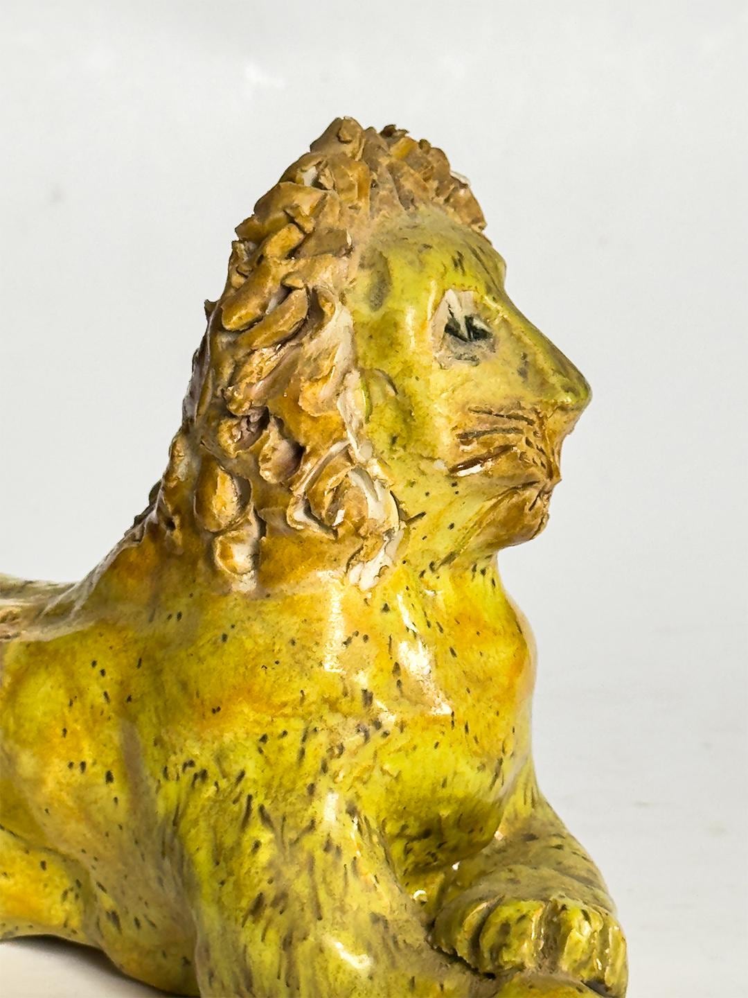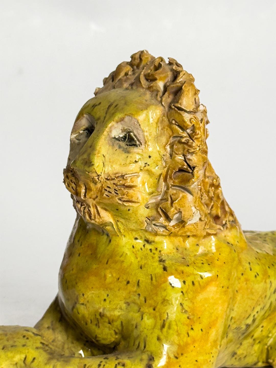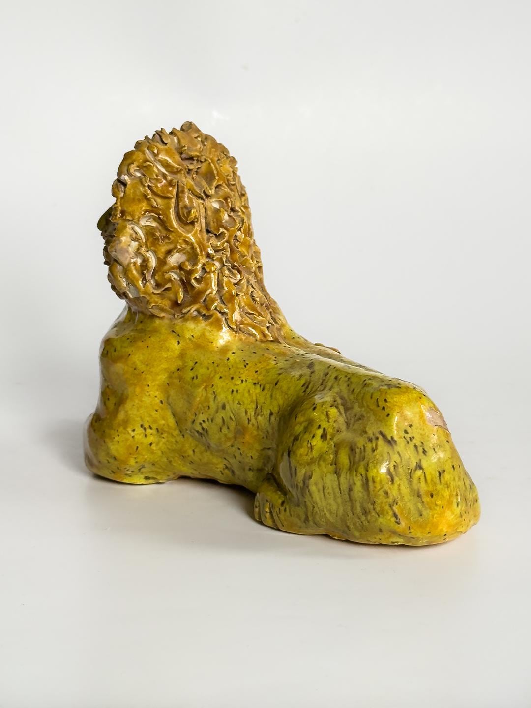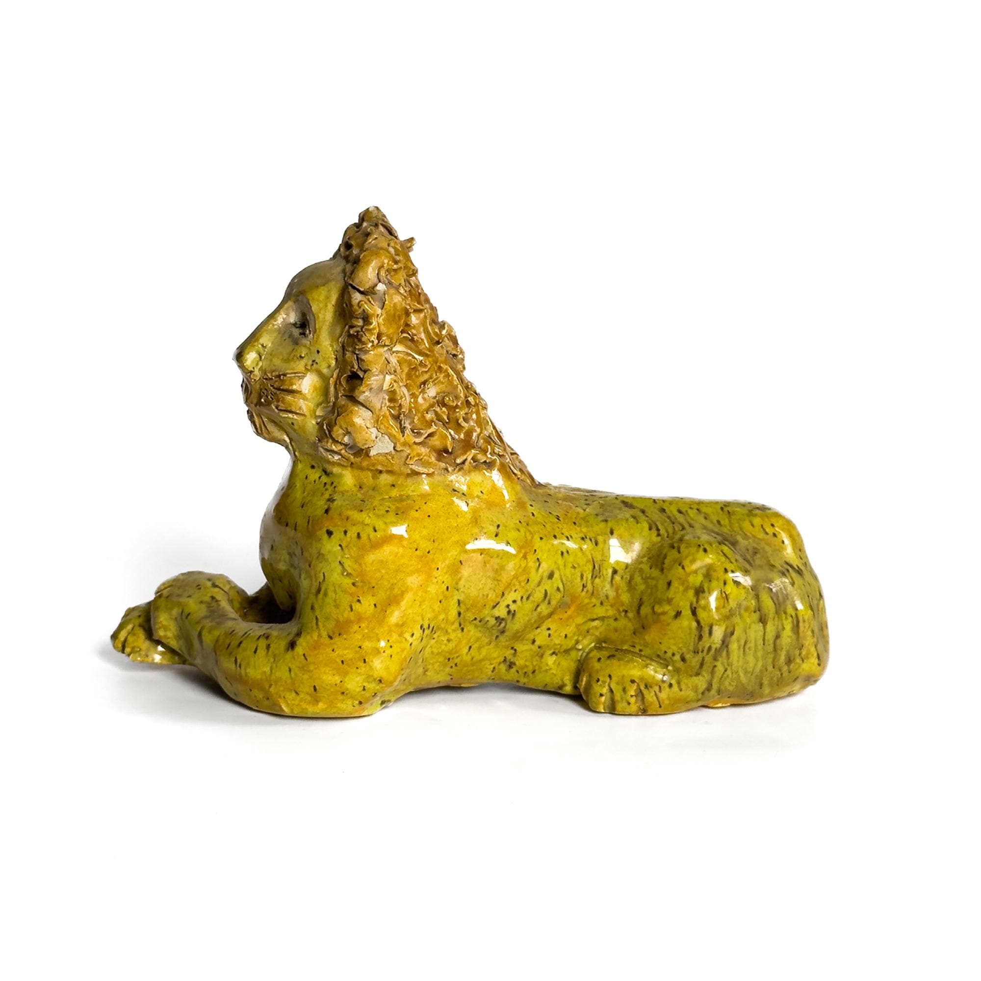 A stately and expressive ceramic lion rendered in the spirited tradition of Southern folk pottery. The figure is hand-built with clearly defined facial features and a richly textured mane, giving the piece both presence and personality. With its bold stance and simplified form, the sculpture carries the unmistakable character associated with works in the style of Billy Ray Hussey. Both playful and regal, it reflects the enduring appeal of Southern vernacular ceramics and handmade animal figures.