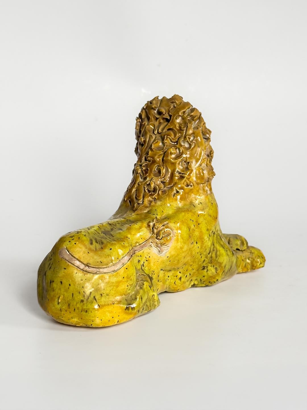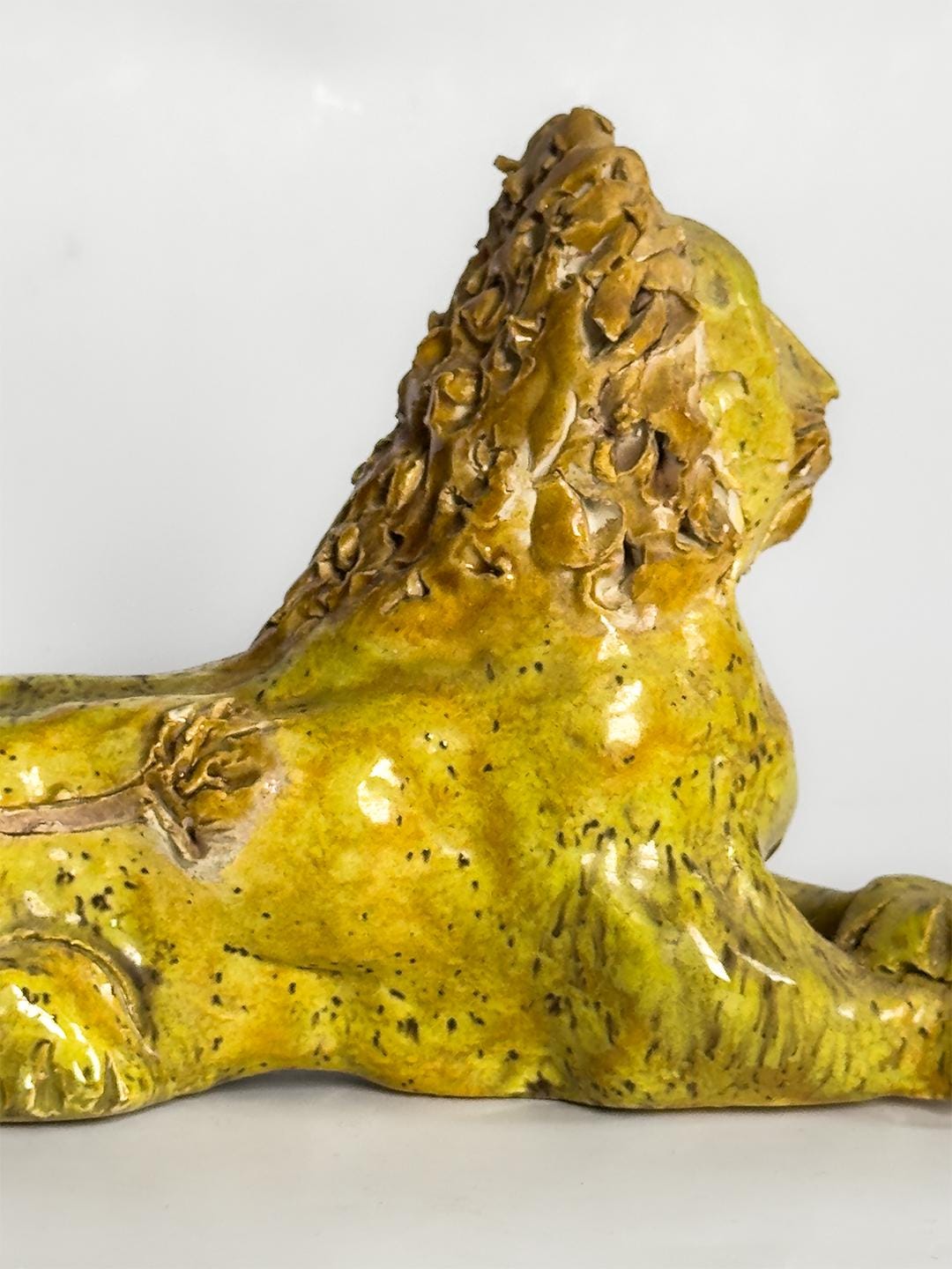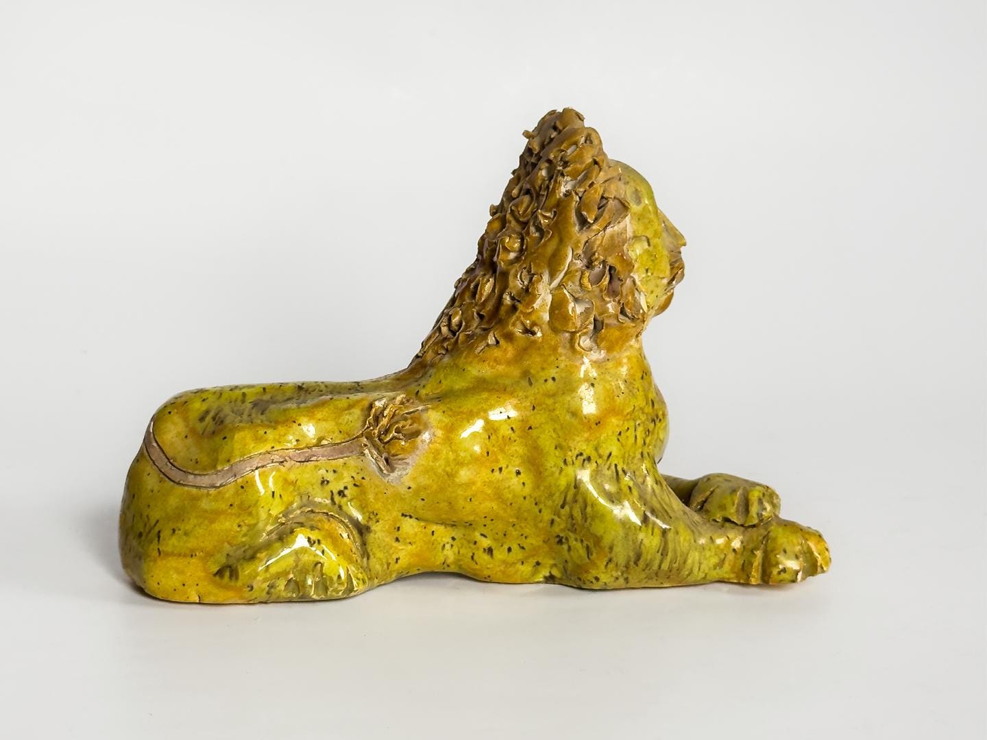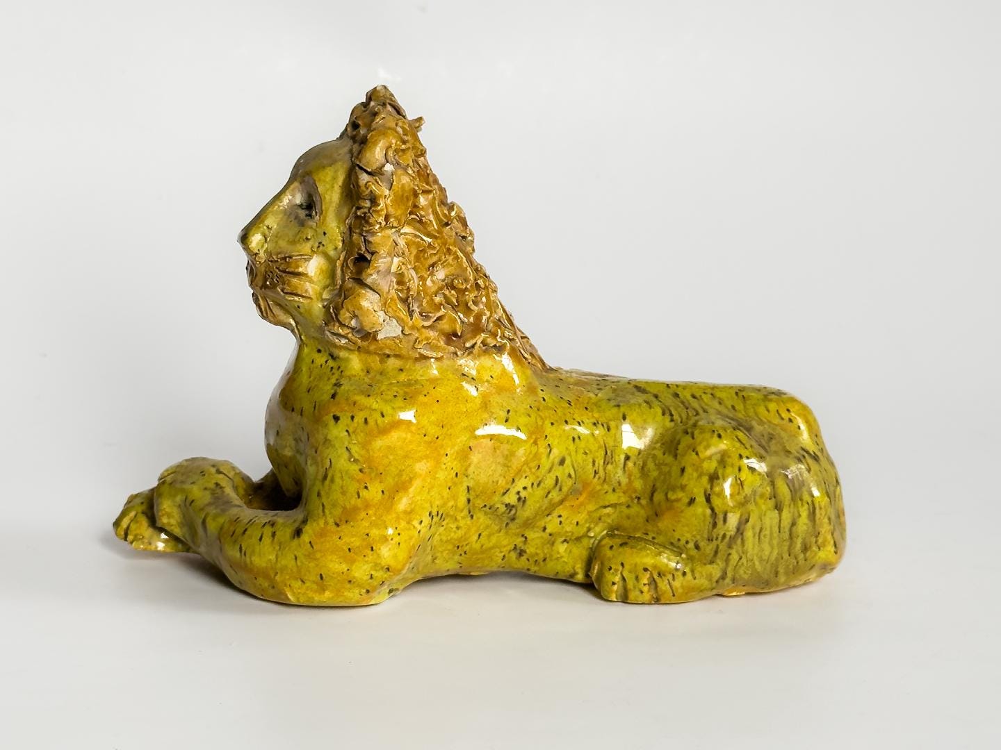 A stately and expressive ceramic lion rendered in the spirited tradition of Southern folk pottery. The figure is hand-built with clearly defined facial features and a richly textured mane, giving the piece both presence and personality. With its bold stance and simplified form, the sculpture carries the unmistakable character associated with works in the style of Billy Ray Hussey. Both playful and regal, it reflects the enduring appeal of Southern vernacular ceramics and handmade animal figures.