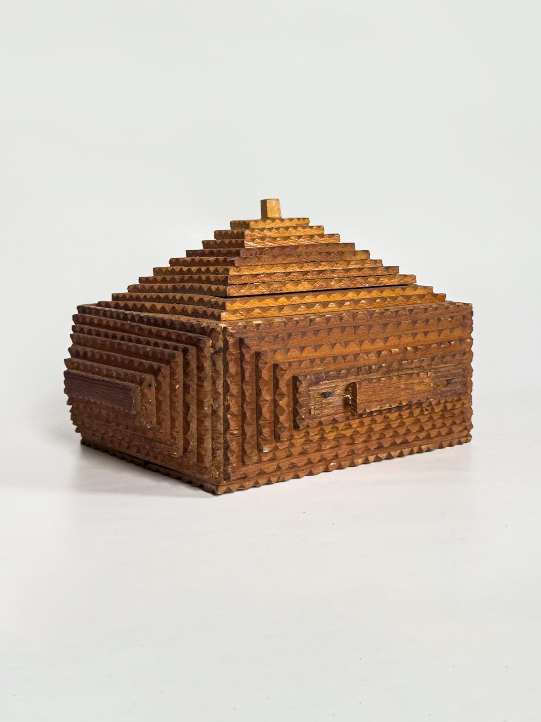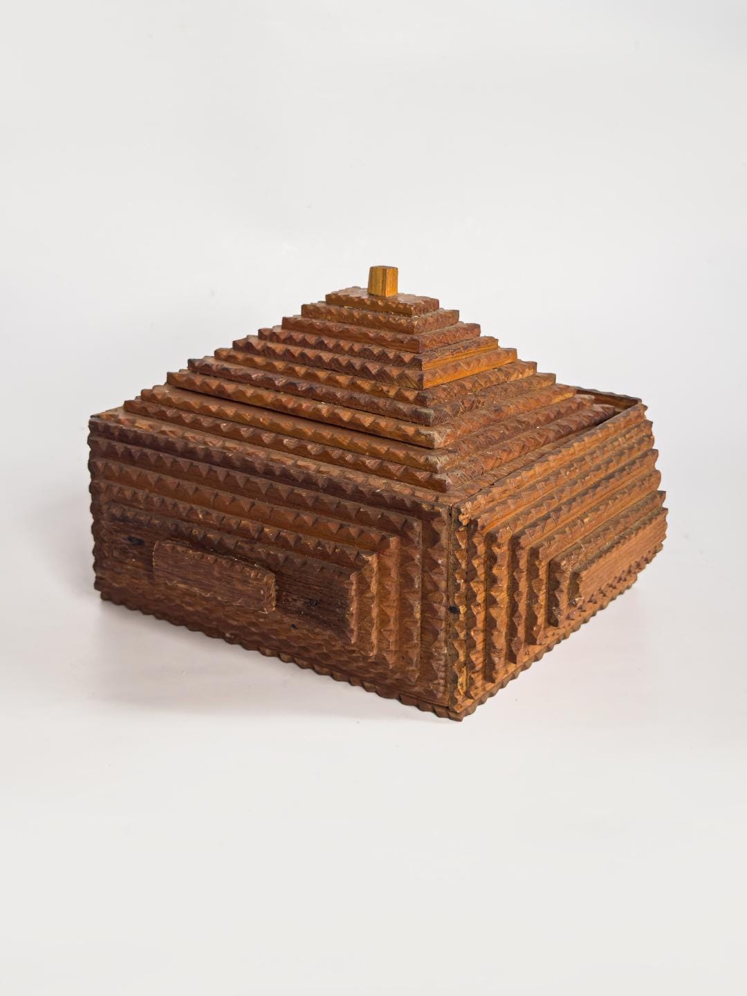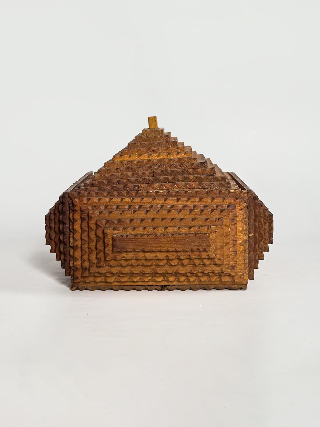 A striking vintage tramp art box distinguished by its dramatic ten-layer pyramid lid, this handcrafted wooden piece transforms a utilitarian form into a sculptural object. Built through the careful stacking of individually carved wooden elements, the stepped top creates strong architectural lines and a bold sense of symmetry. Measuring 10 x 8.5 x 6 inches, it has an impressive presence while remaining practical for tabletop storage or display.