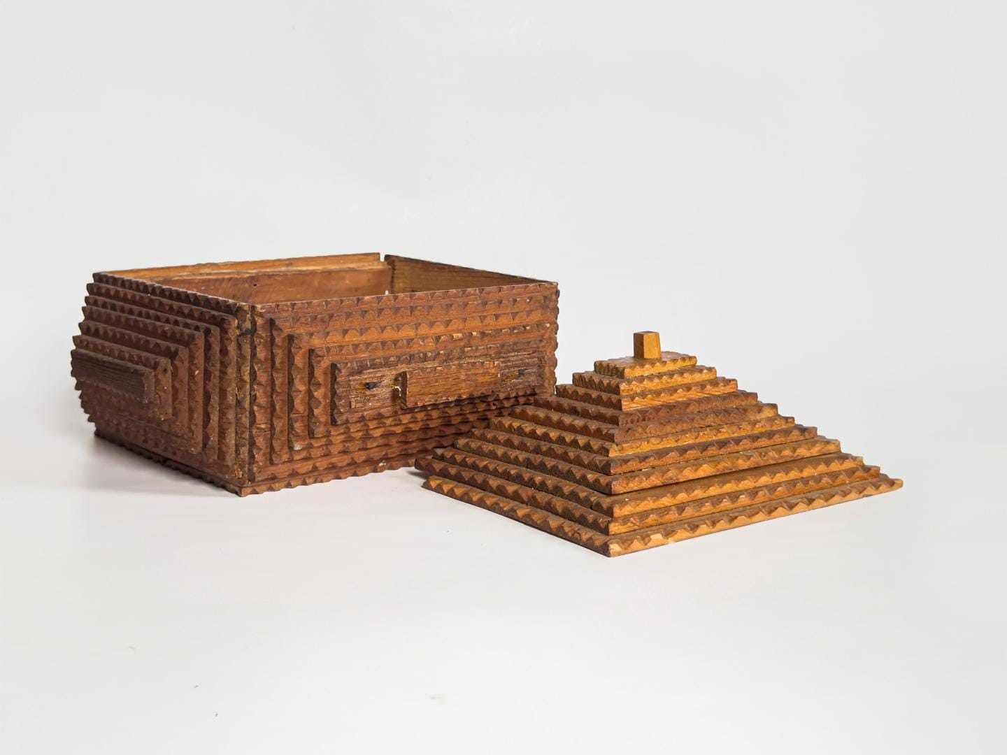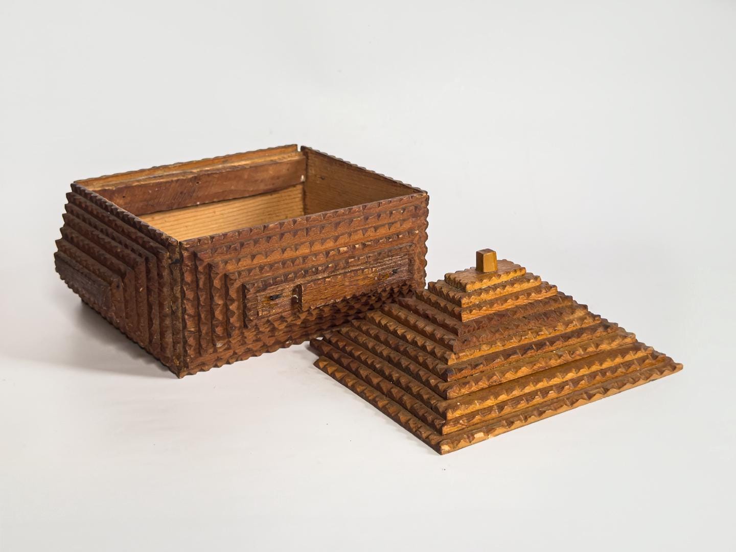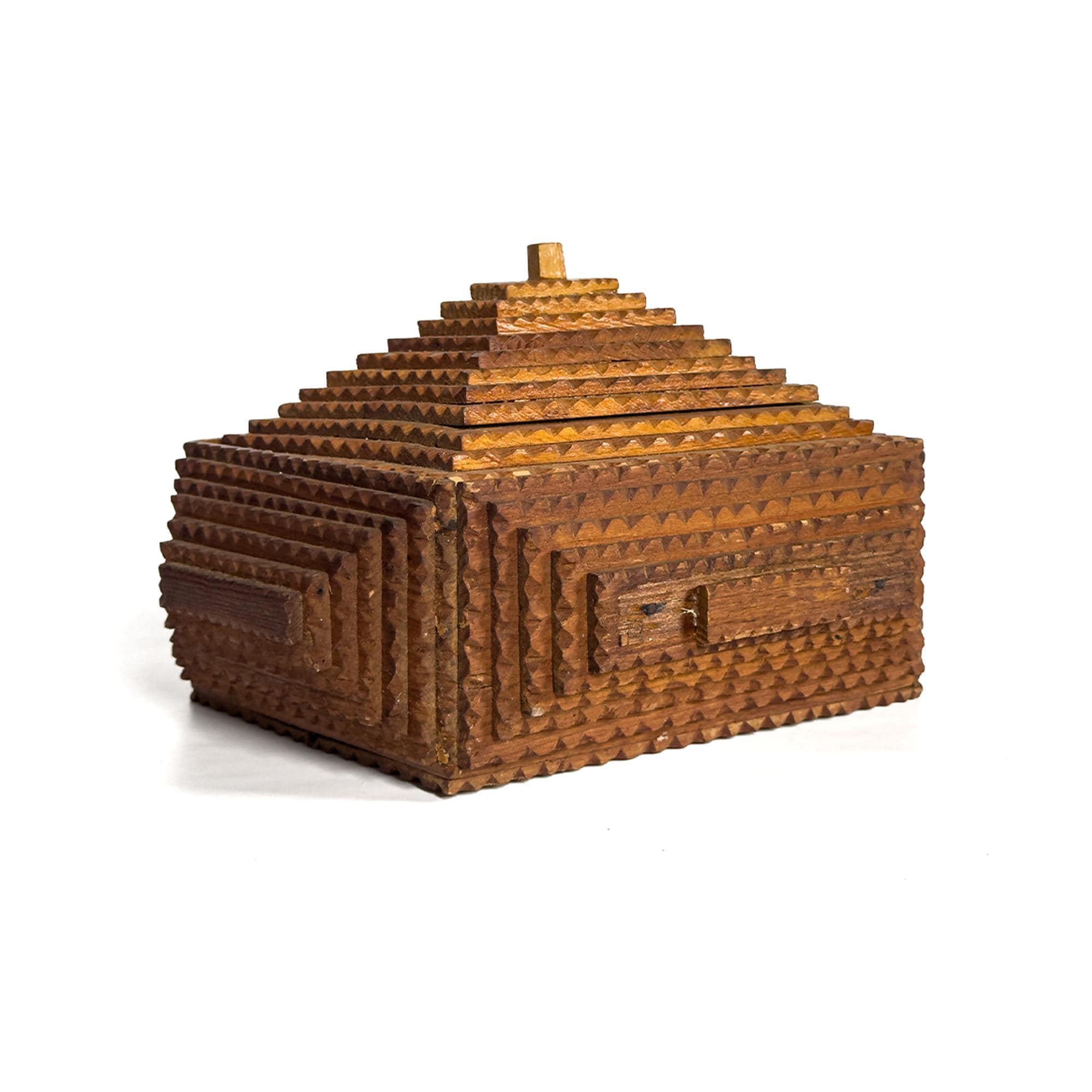 A striking vintage tramp art box distinguished by its dramatic ten-layer pyramid lid, this handcrafted wooden piece transforms a utilitarian form into a sculptural object. Built through the careful stacking of individually carved wooden elements, the stepped top creates strong architectural lines and a bold sense of symmetry. Measuring 10 x 8.5 x 6 inches, it has an impressive presence while remaining practical for tabletop storage or display.