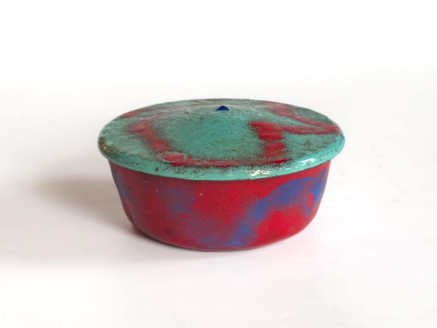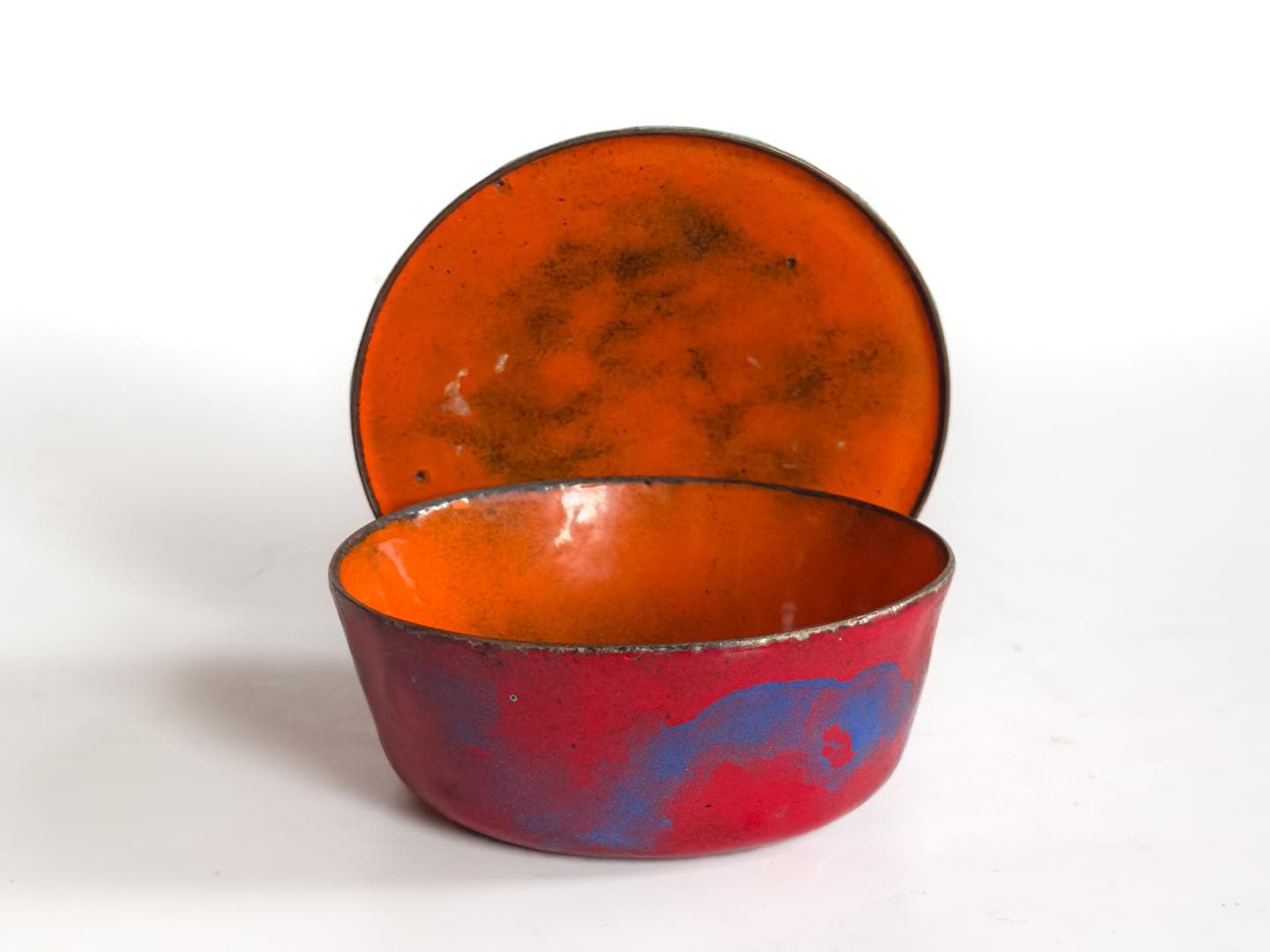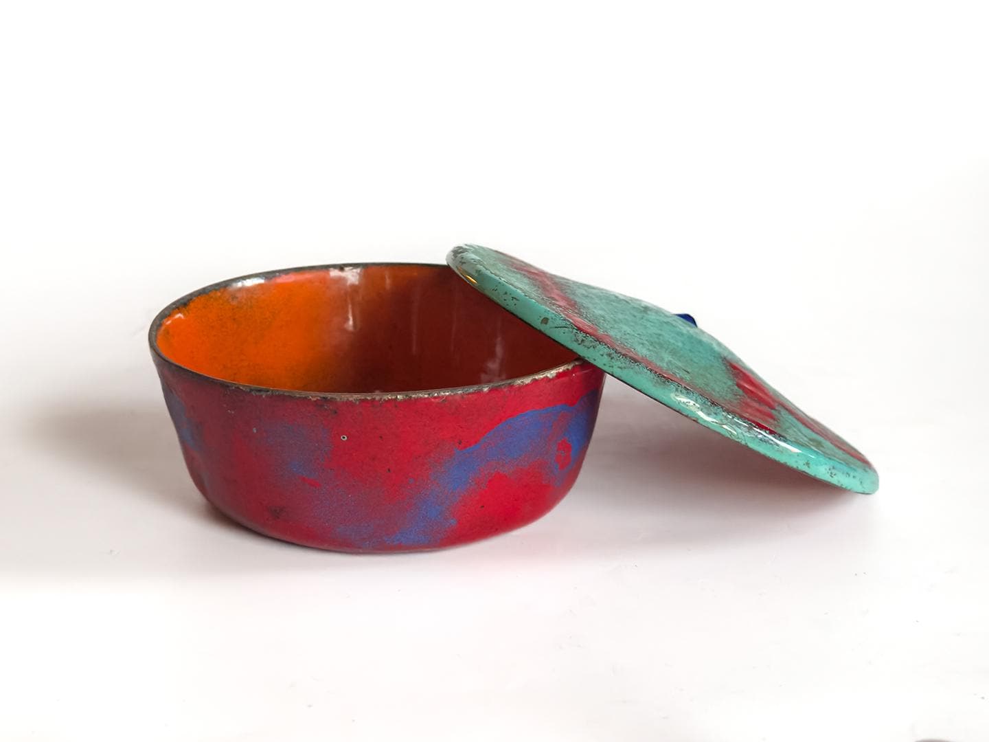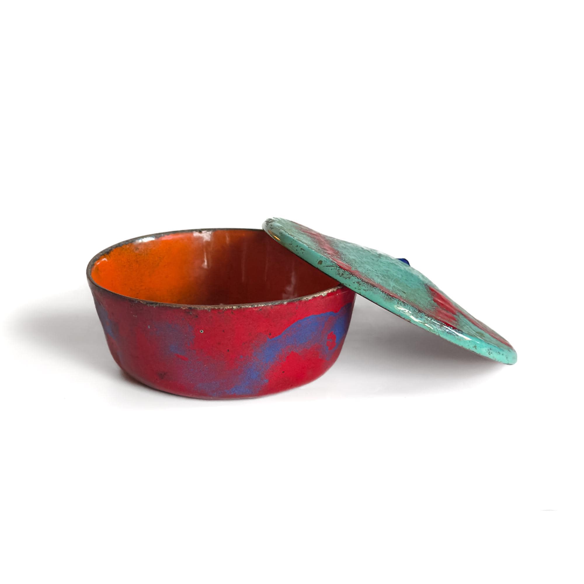 A bold and sculptural mid-century enamel on copper lidded dish featuring an exceptional interplay of color and form. The rounded bowl is finished in rich red and blue tones, opening to a vibrant orange interior that continues beneath the lid. Resting above is a flat abstract top in turquoise and red, creating a striking modernist contrast. Measures 2 inches high by 4 inches in diameter.
