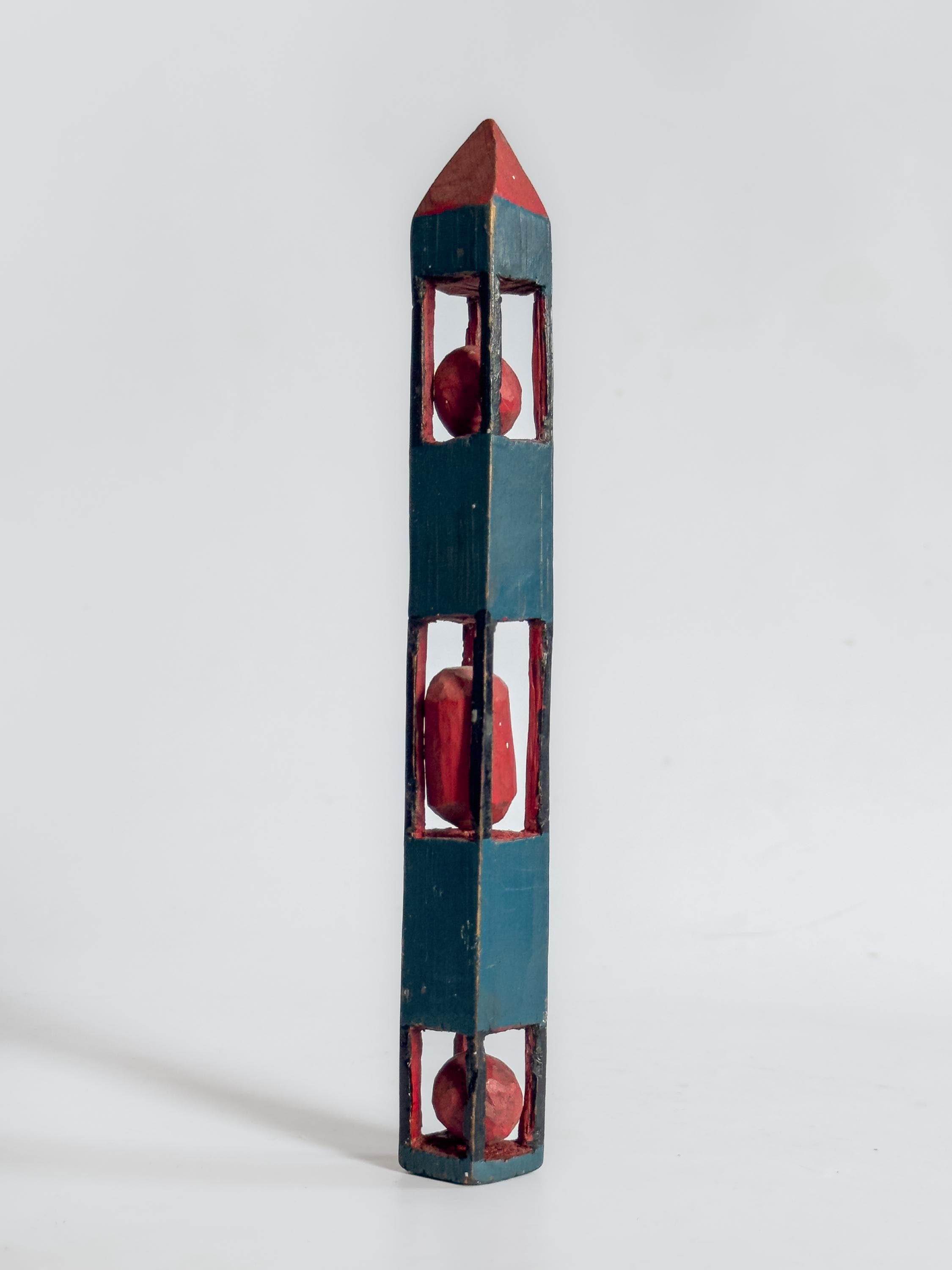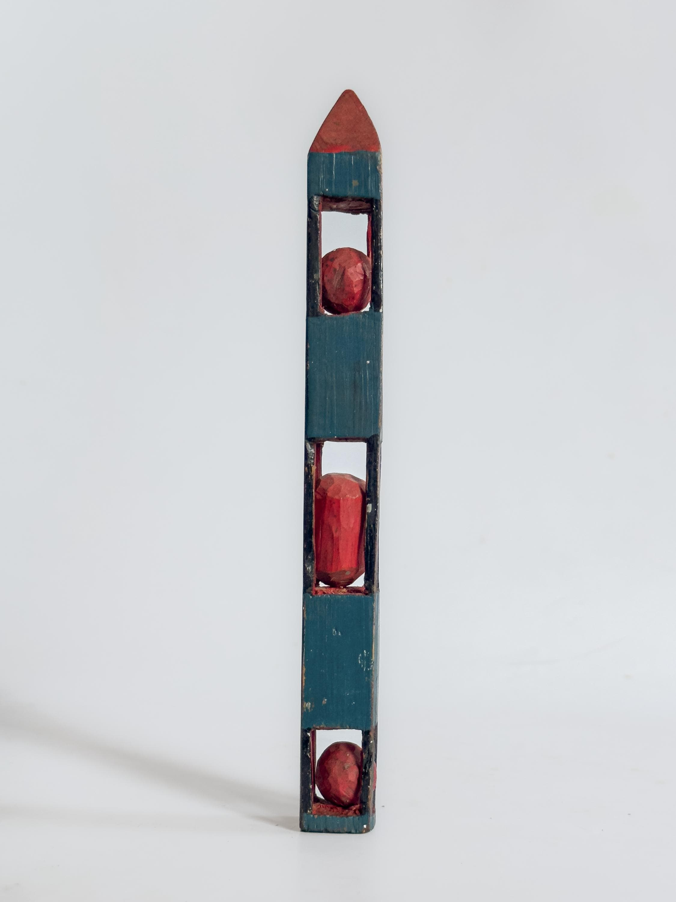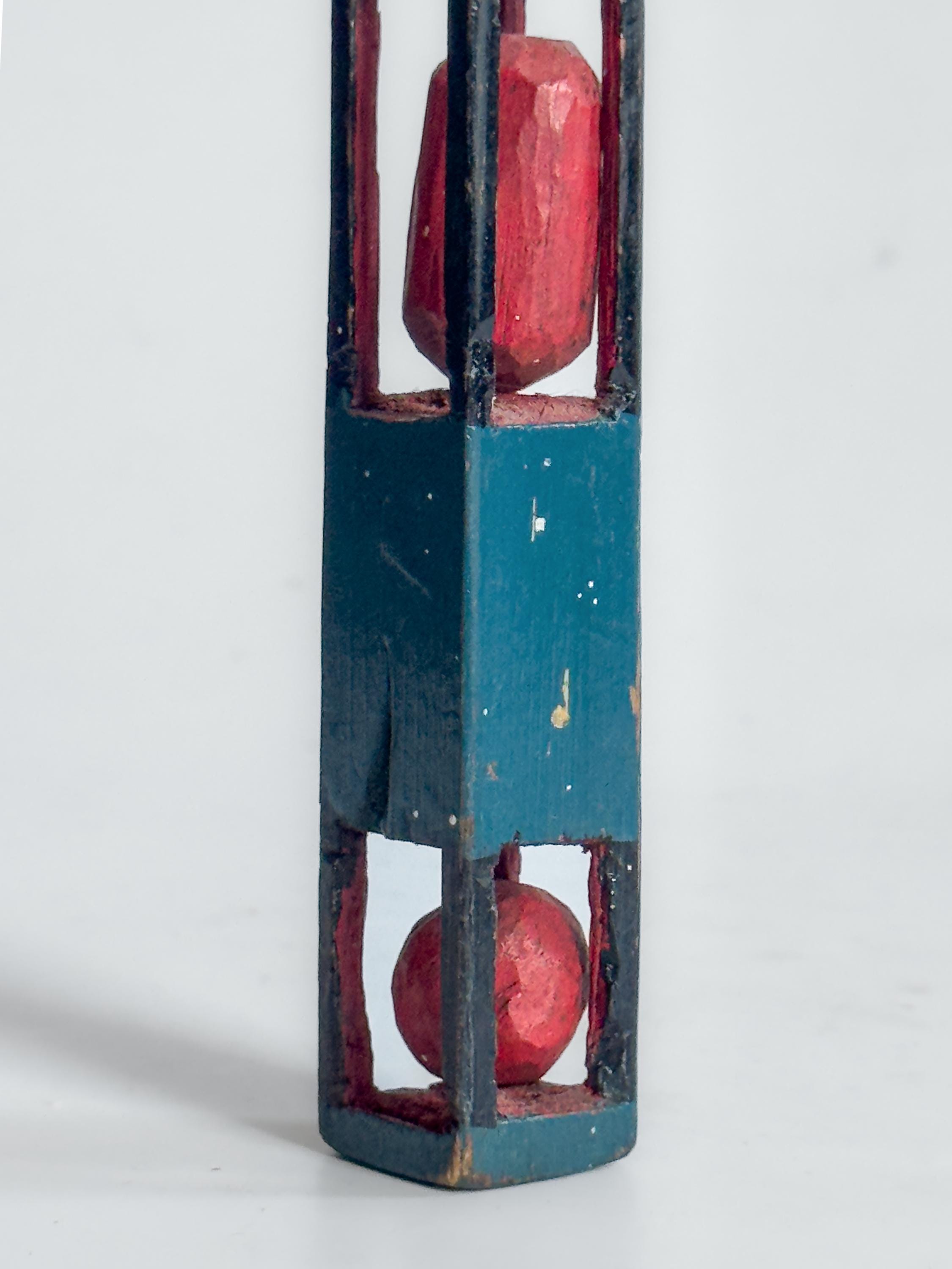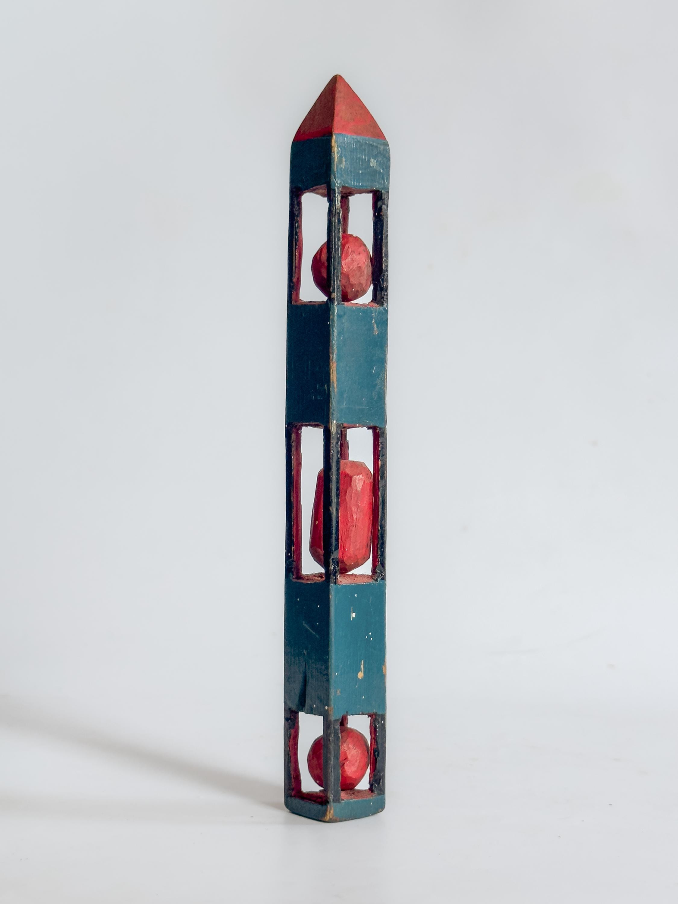 Whimsy carvings have long associations with sailors, soldiers, and self-taught rural makers, for whom carving served as pastime, discipline, and creative expression. Painted examples such as these are especially appealing, with color emphasizing their playful geometry and sculptural forms.