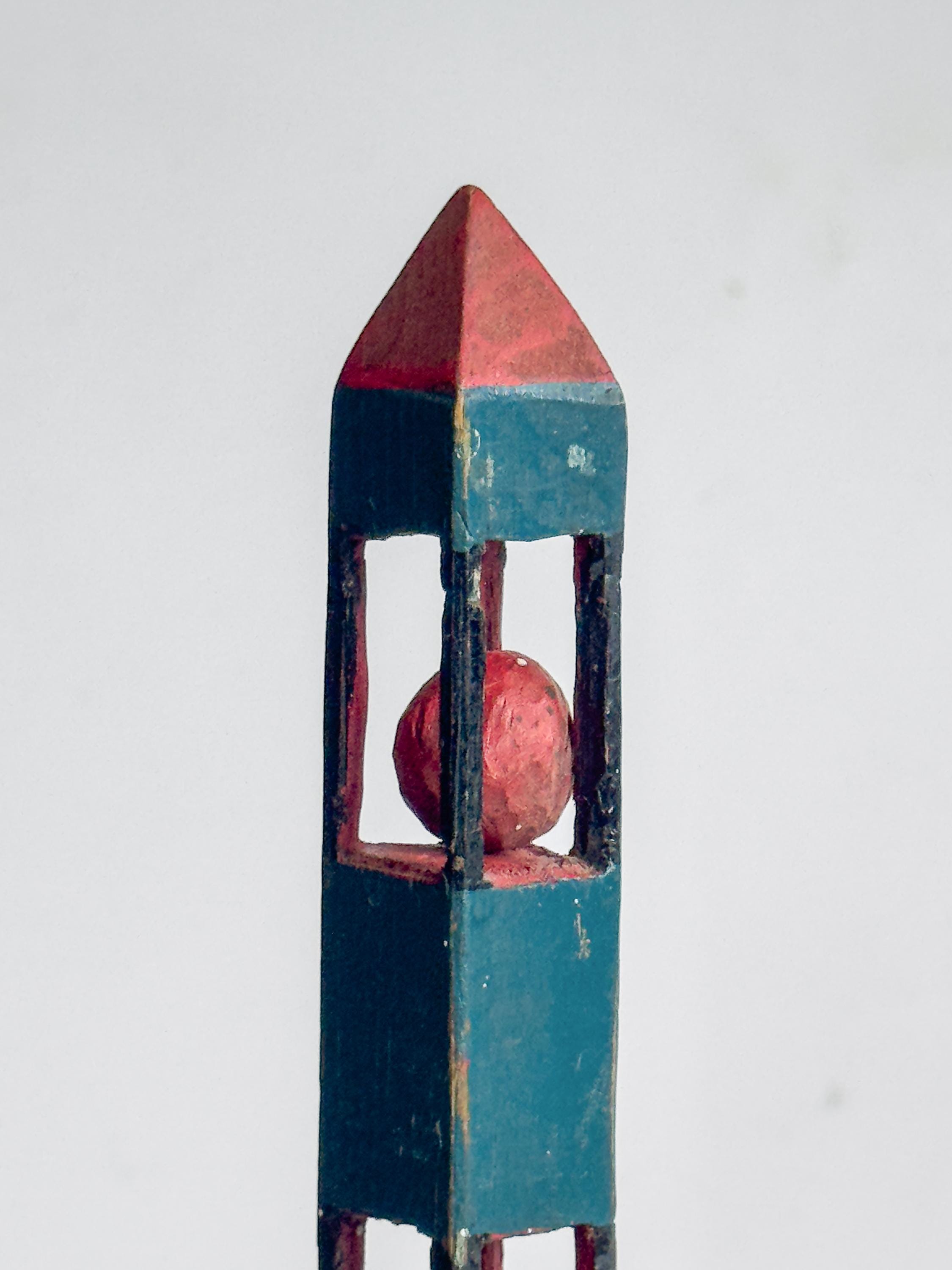 The white example features a dramatic spiked spire rising above its carved cage form and measures 9 x 1.5 inches. The red whimsy has a squared top with a small stepped base, giving it a strong architectural presence, and measures 5.5 x 1.25 inches. The blue and red example contains three enclosed balls, each painted red within a blue tower-like structure, and measures 8 x .75 inches. Together or separately, they make striking shelf accents and excellent examples of American primitive carving traditions.
