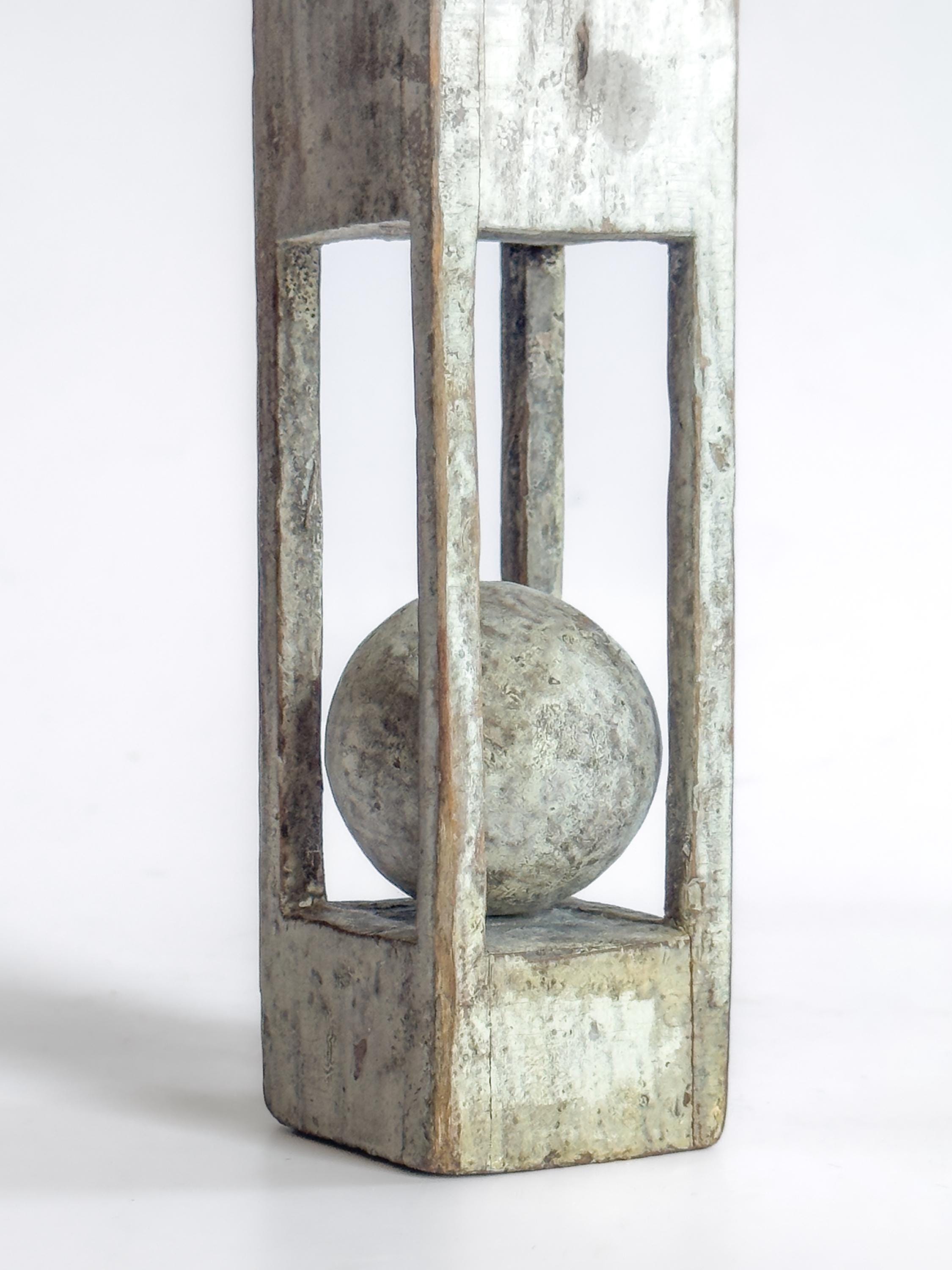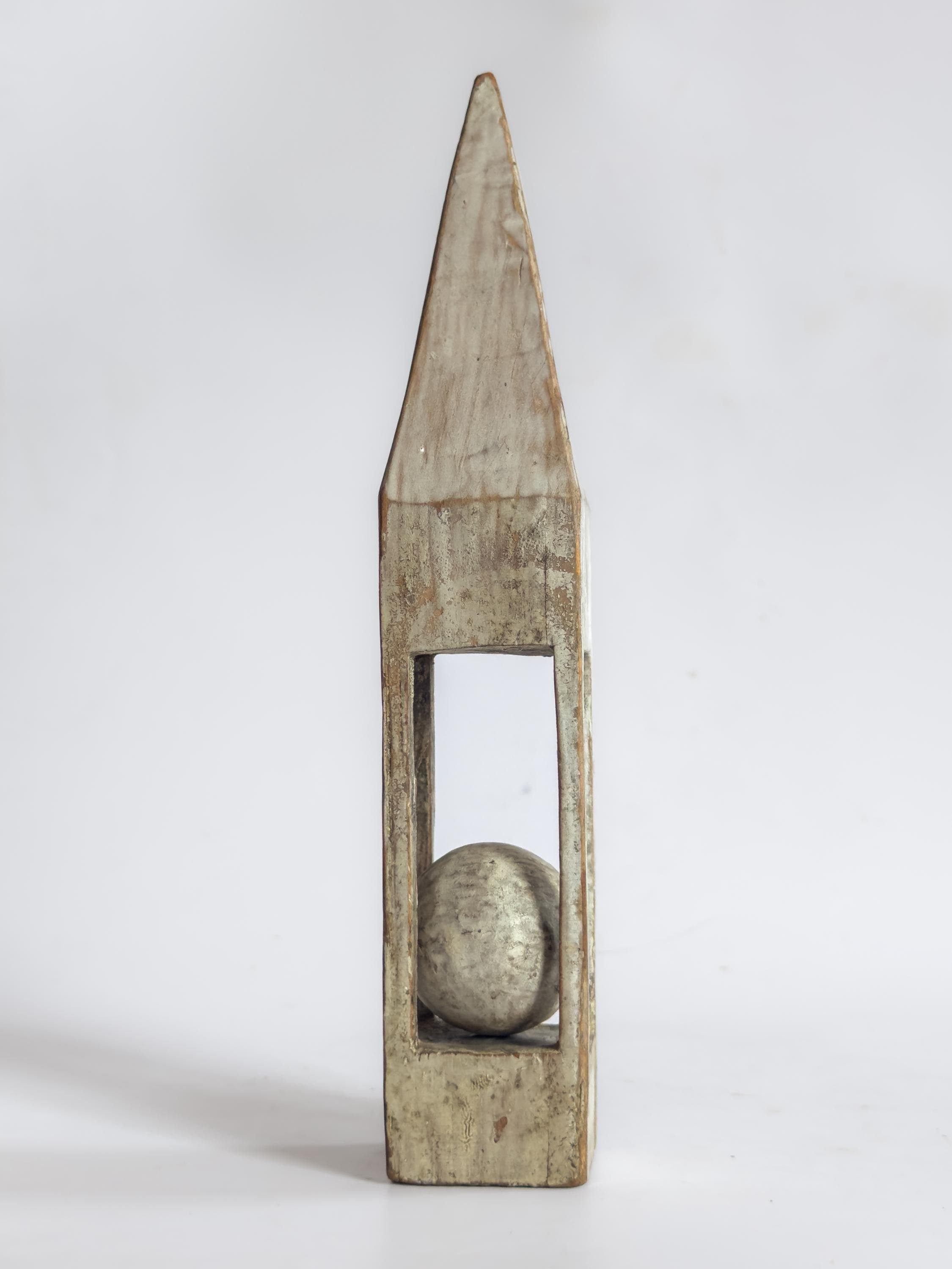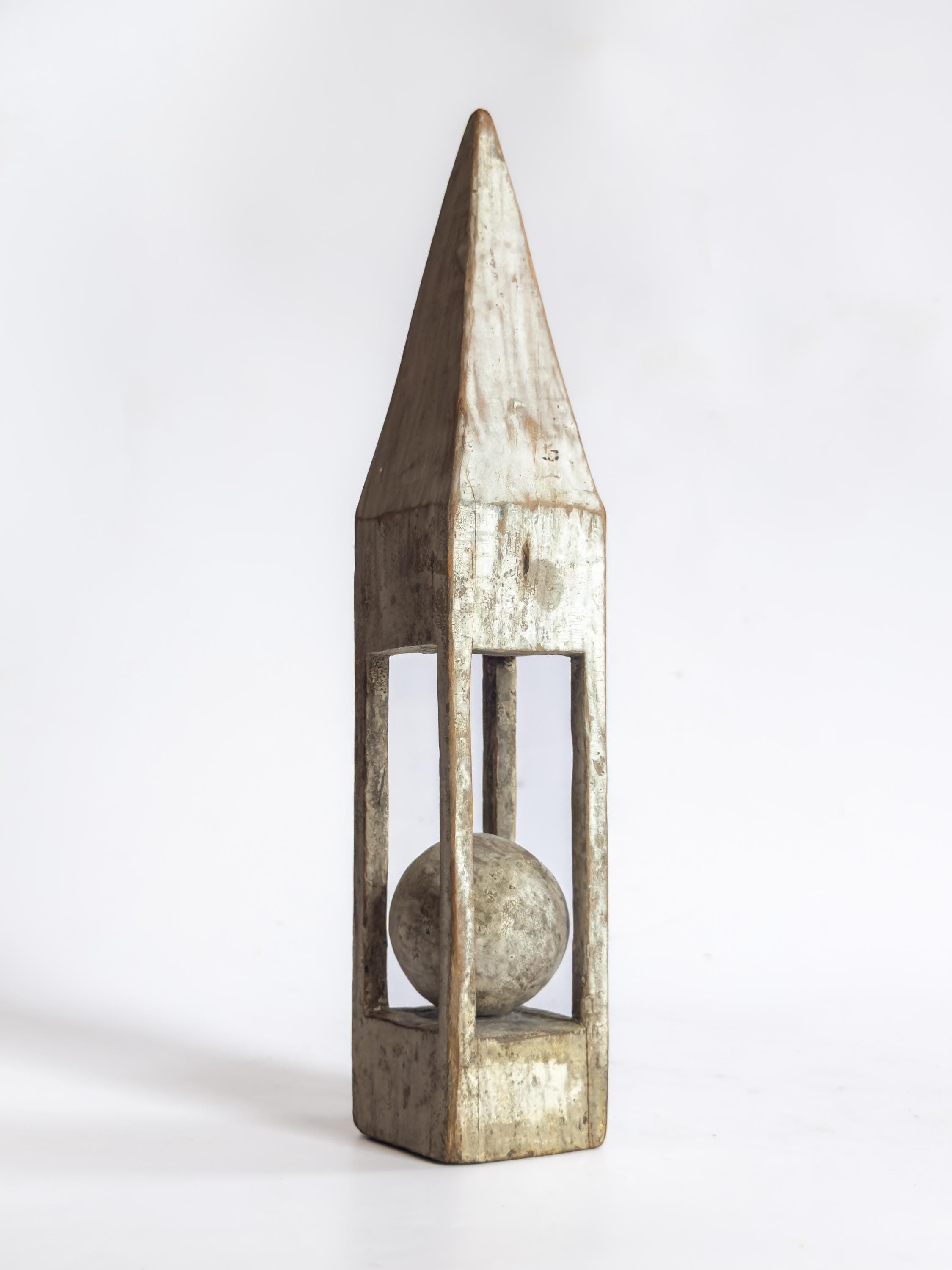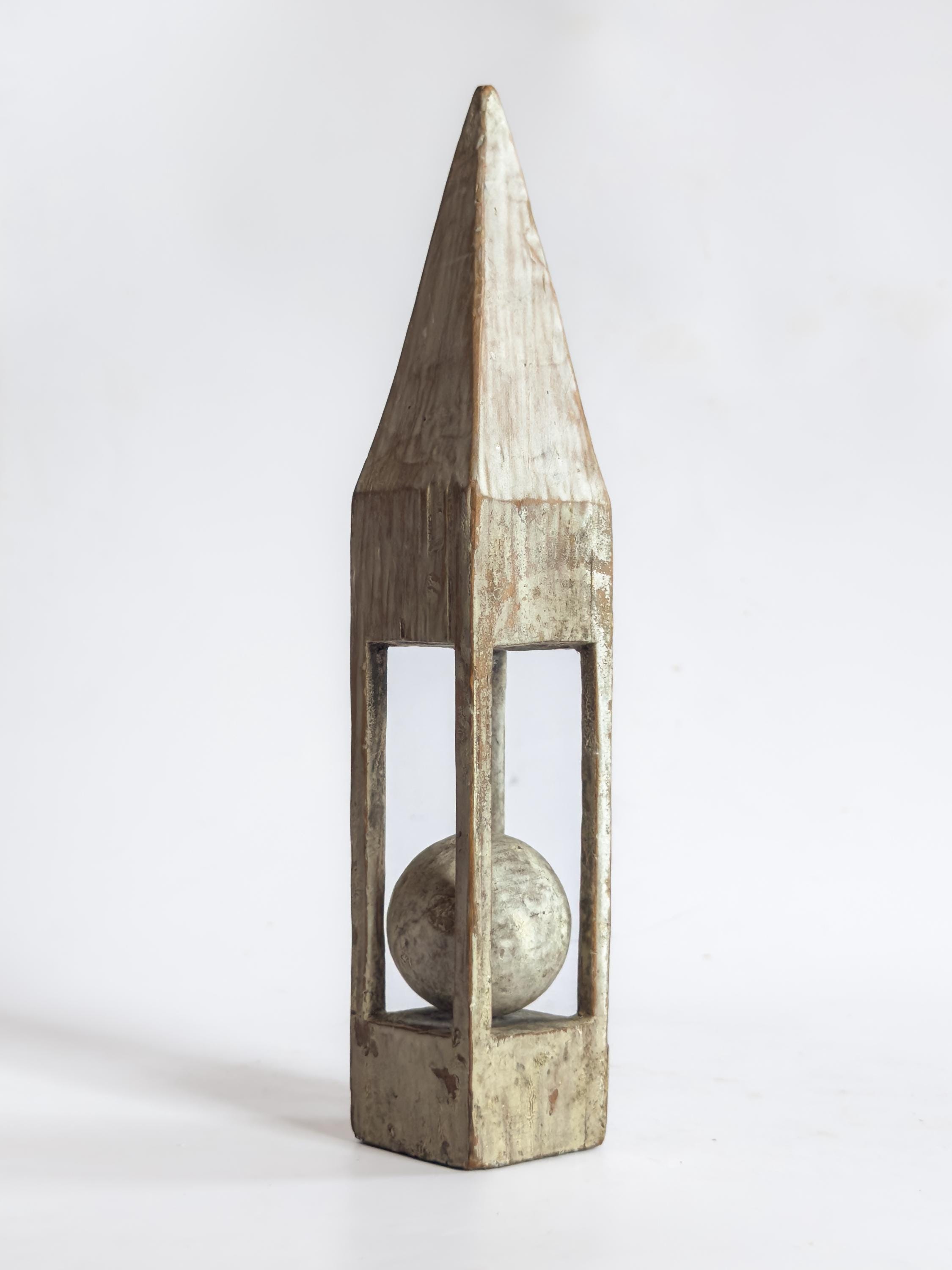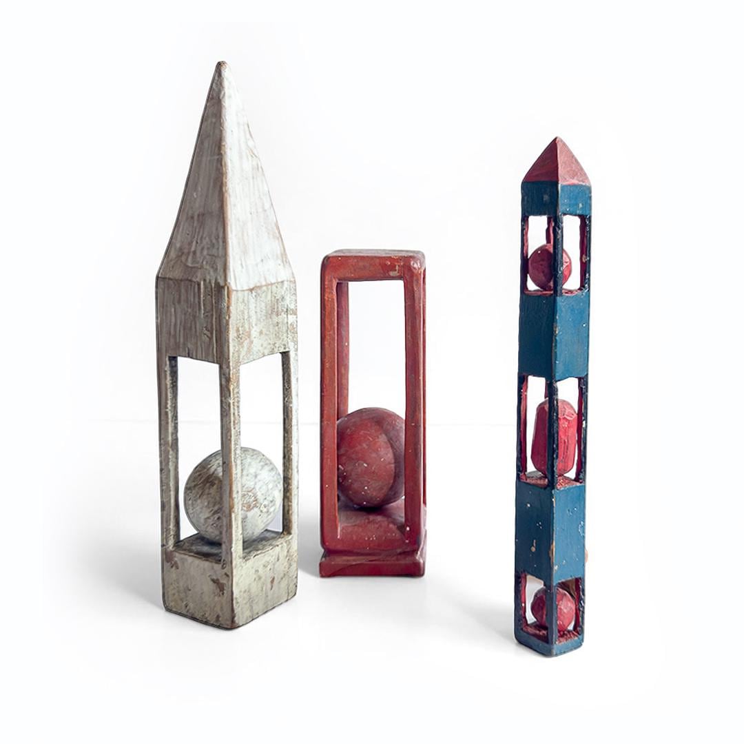 A charming group of antique primitive painted whimsy ball-in-cage carvings, sold individually, each hand carved as a standing sculptural object that celebrates ingenuity, patience, and playful design. These vernacular folk art pieces transform simple wood into captivating displays of captive carved forms, with each example distinguished by its own silhouette and painted surface.
